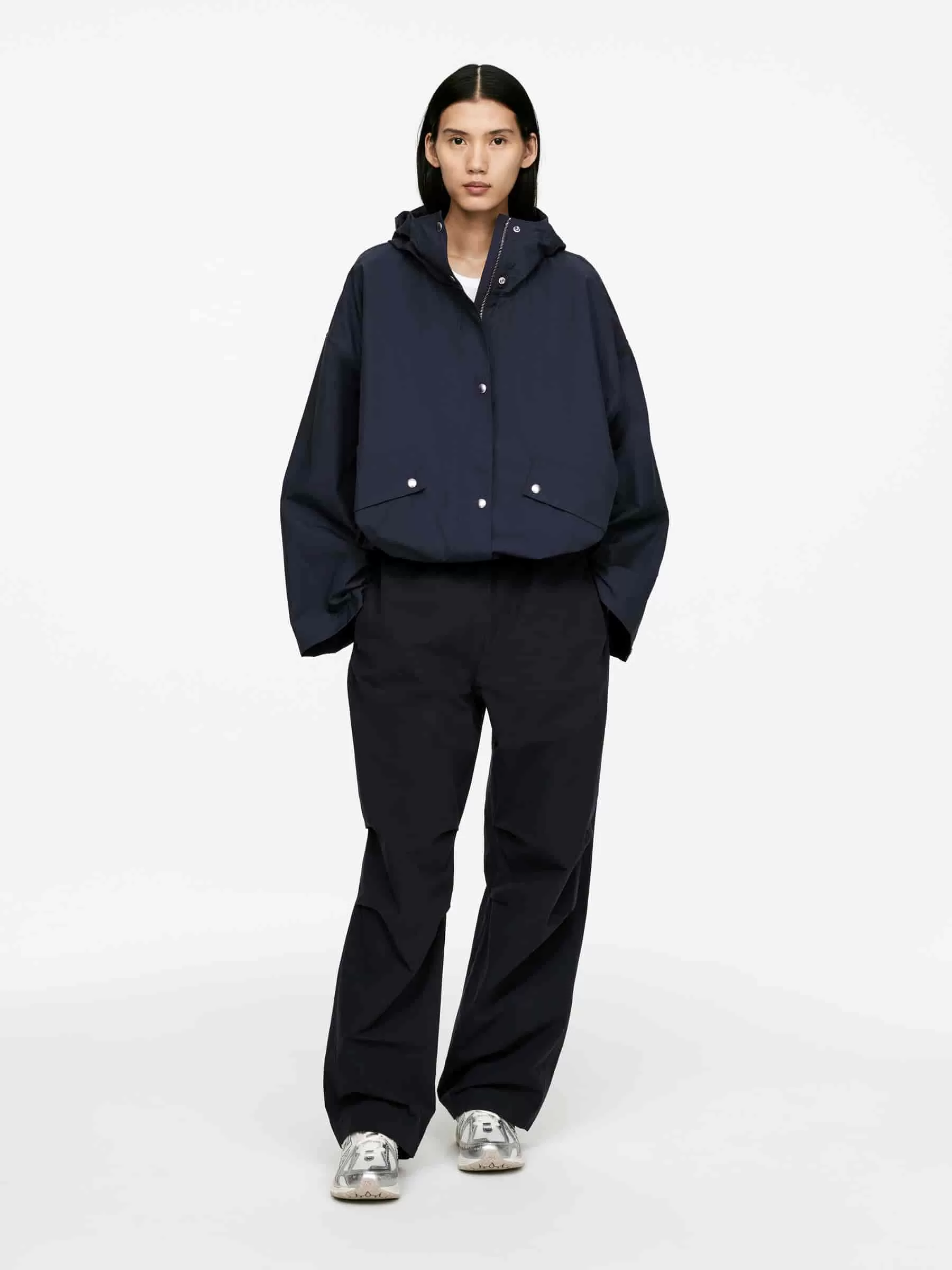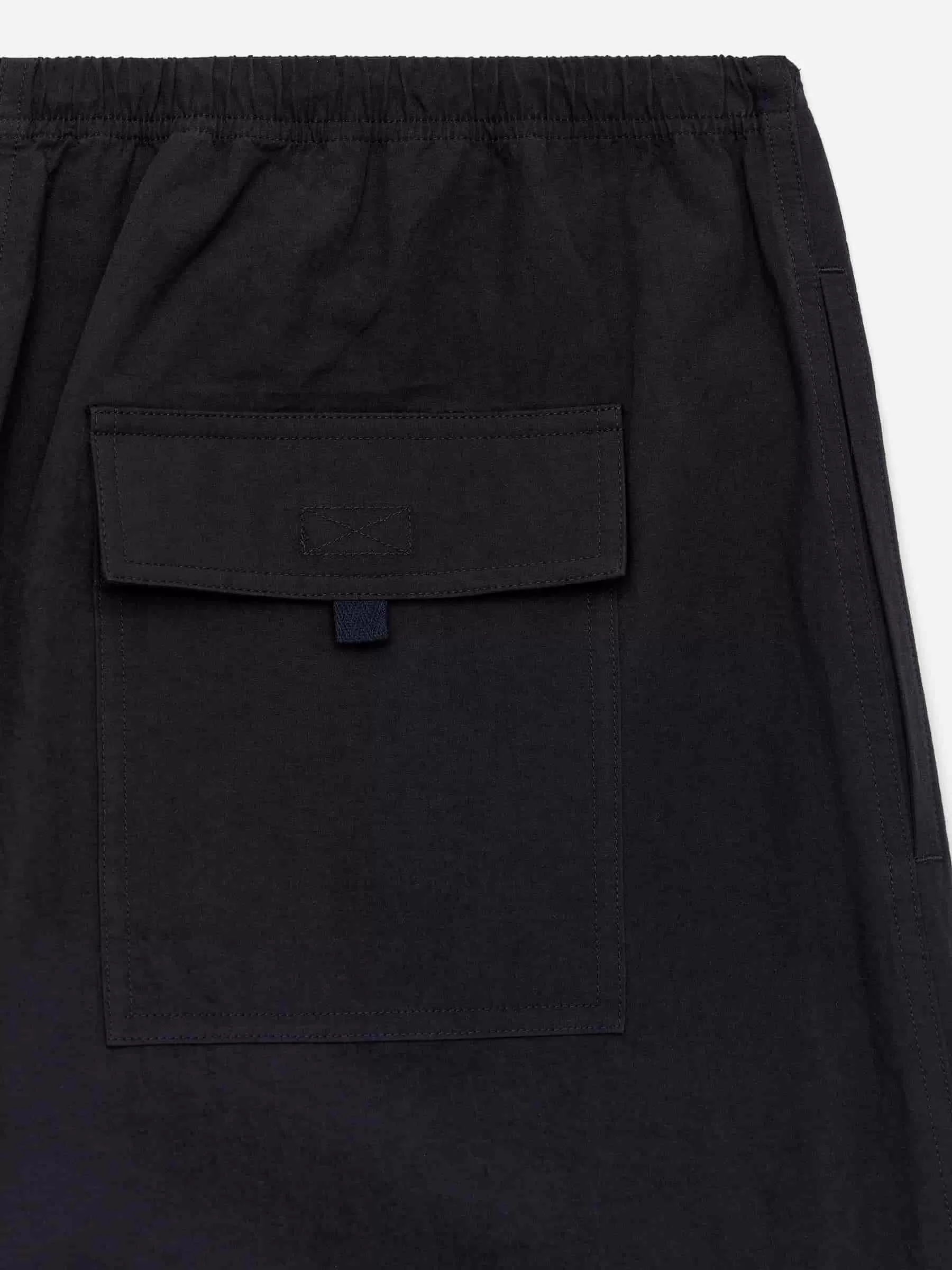 Baumwollhose mit Seitentaschen, Falten am Knie und Knebelverschluss an der Seite mit Gummizug im Bund. Eine Gesäßtasche mit Fischgrätenband aus Baumwolltwill.