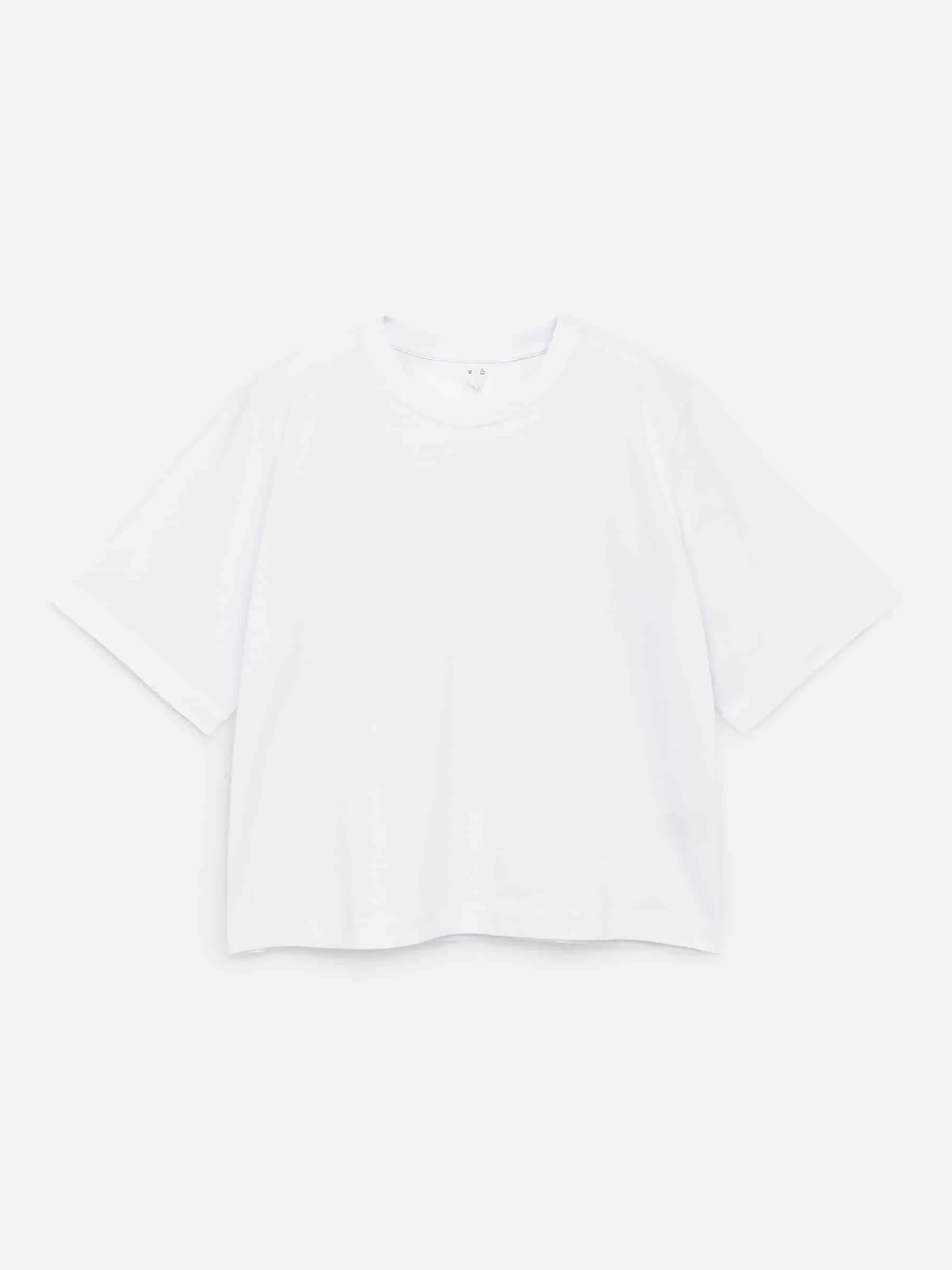 T-Shirt aus robustem Baumwoll-Single-Jersey. Ein kurzärmliges Modell mit kastenförmiger Passform und leicht verkürztem Körper.