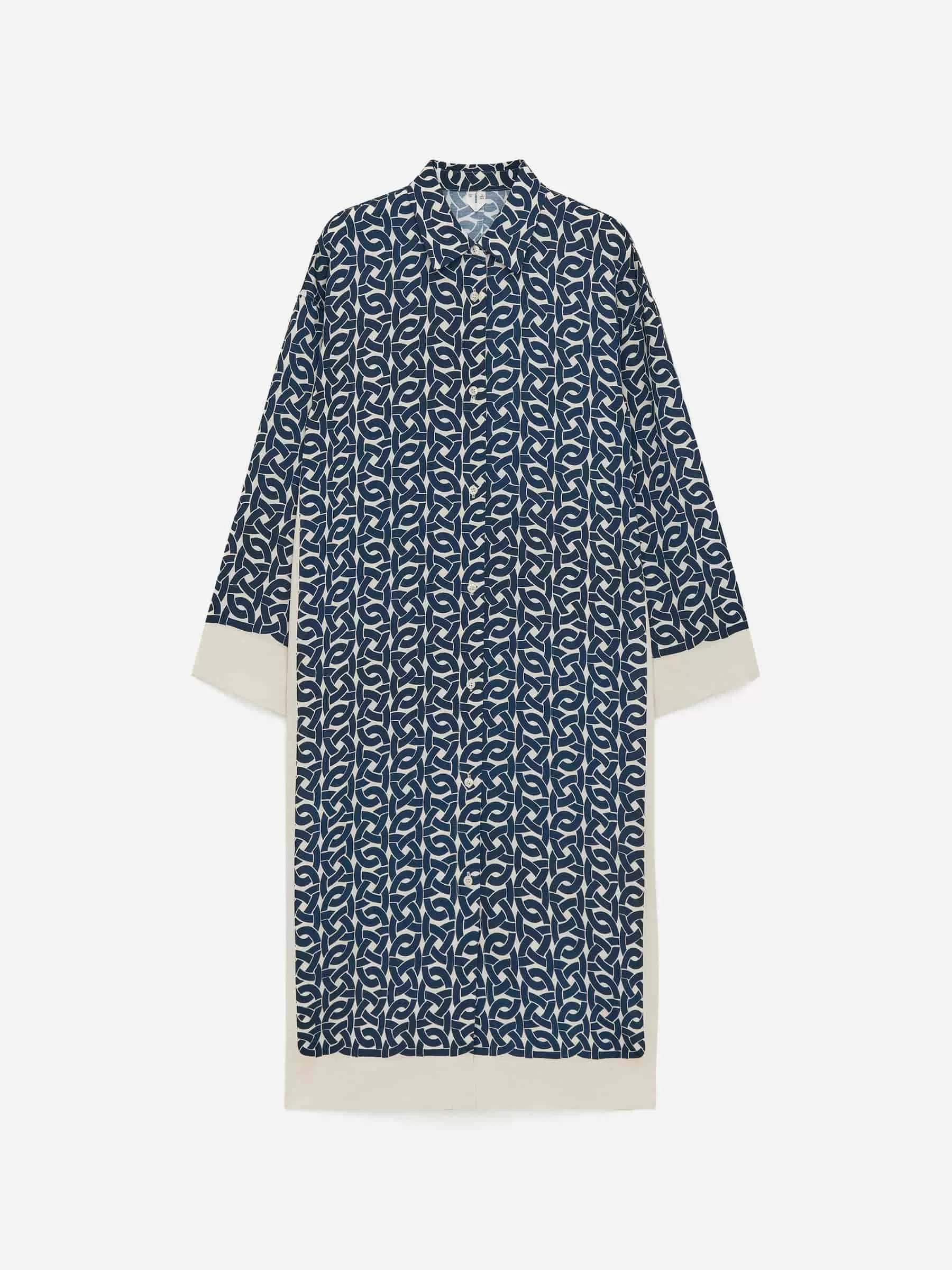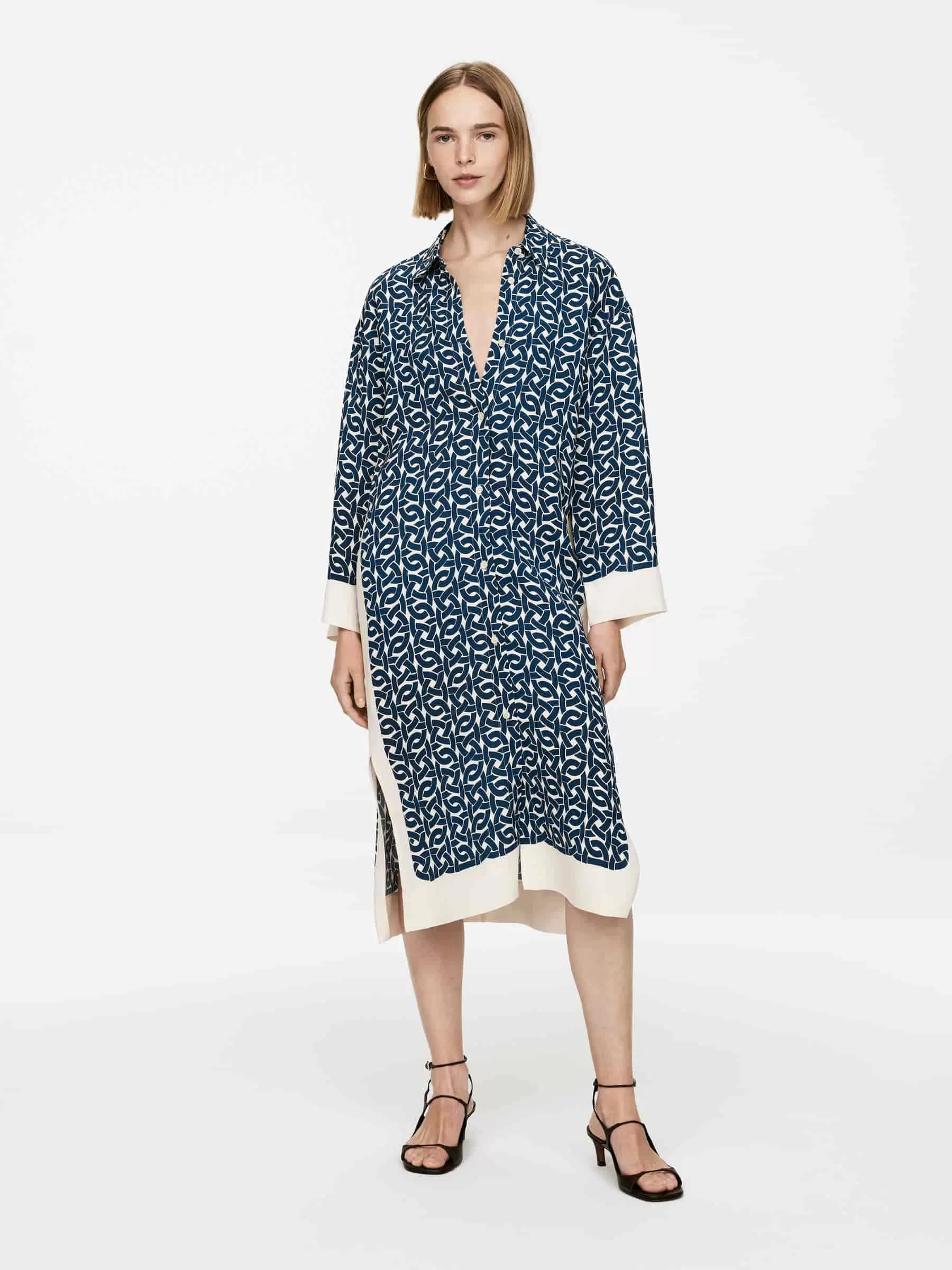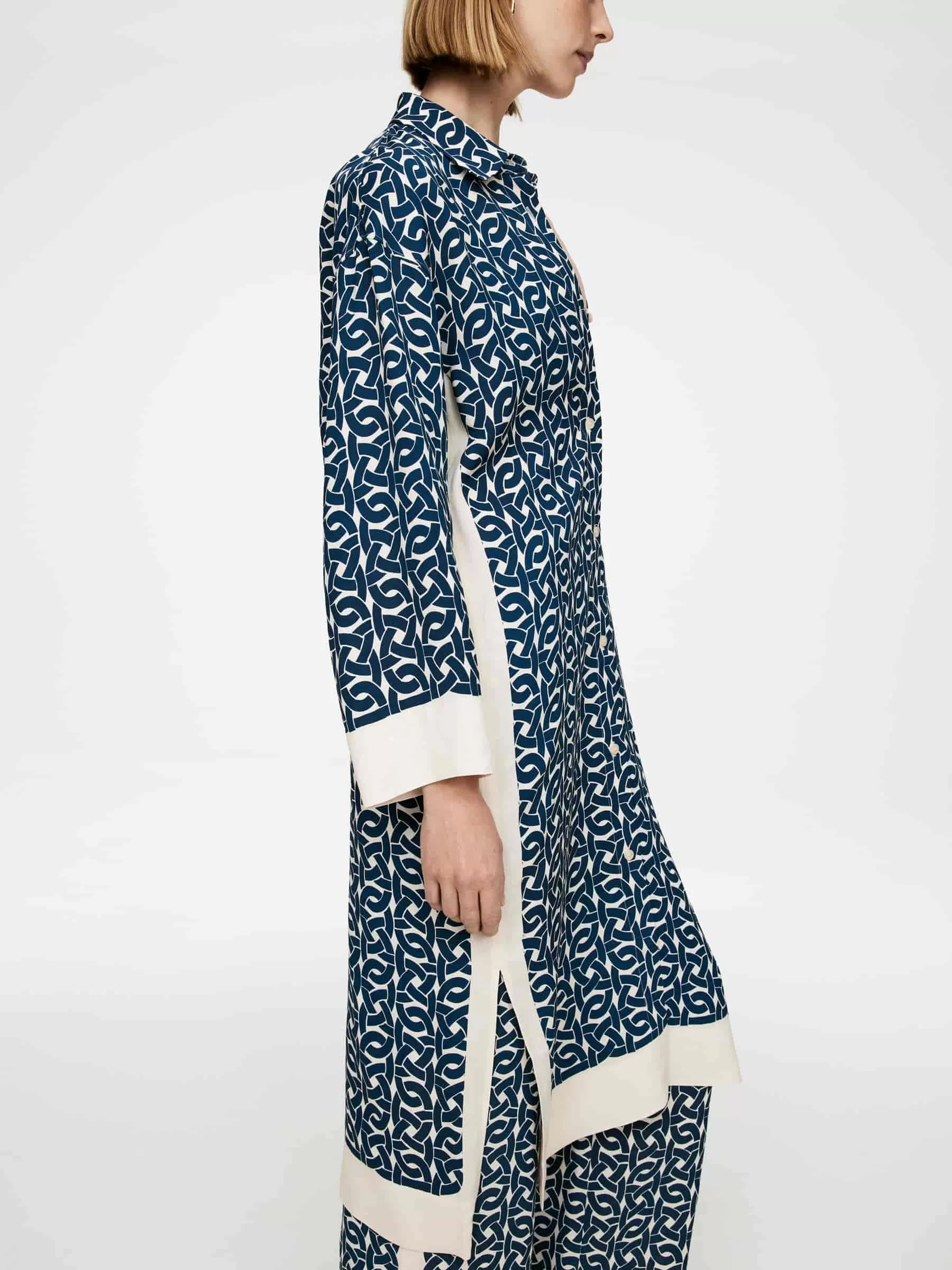 Bedrucktes Kleid aus einer Viskose-Hanf-Mischung. Ein langer, geknöpfter Stil mit Seitenschlitzen. Normale Passform.
