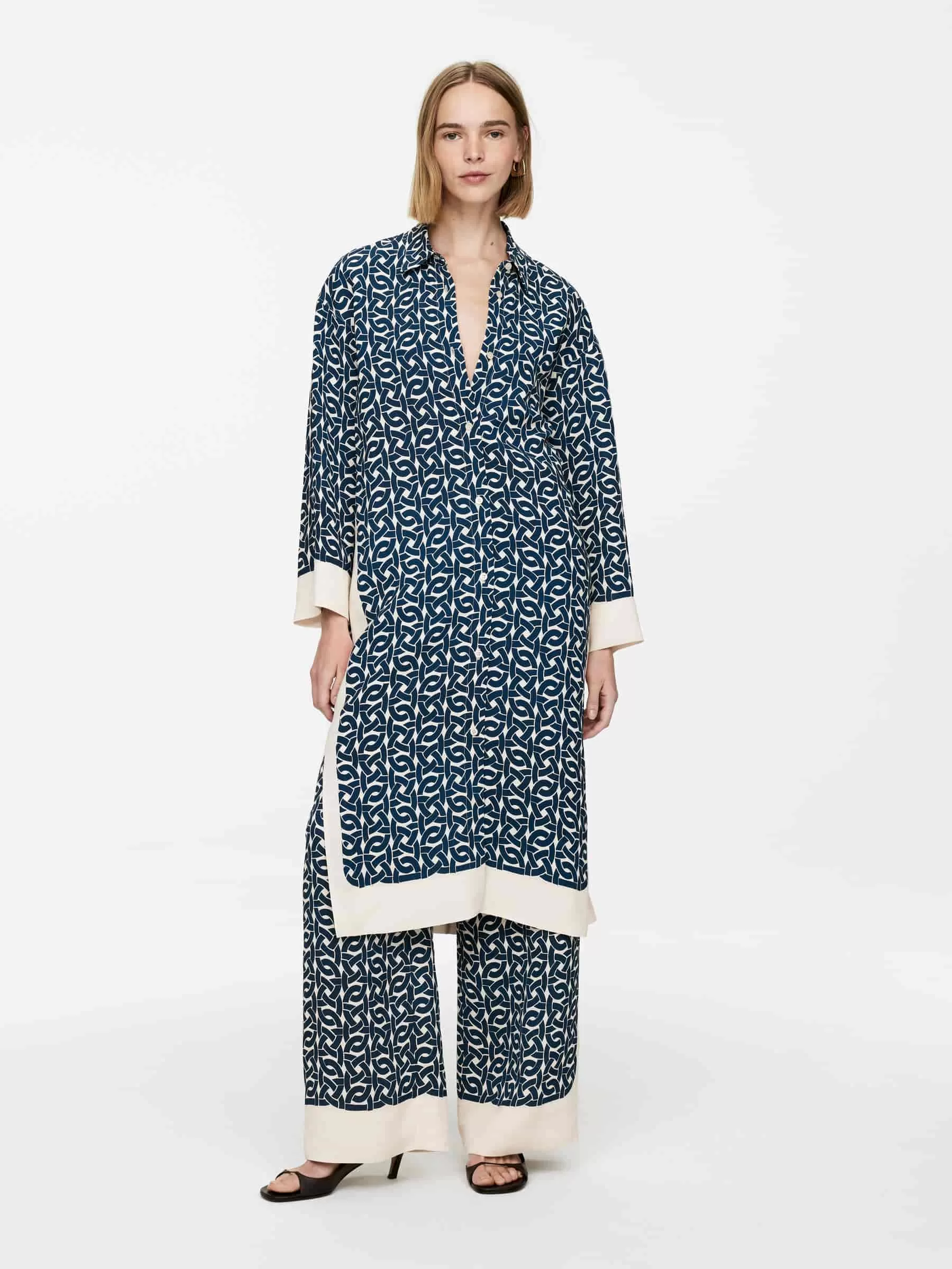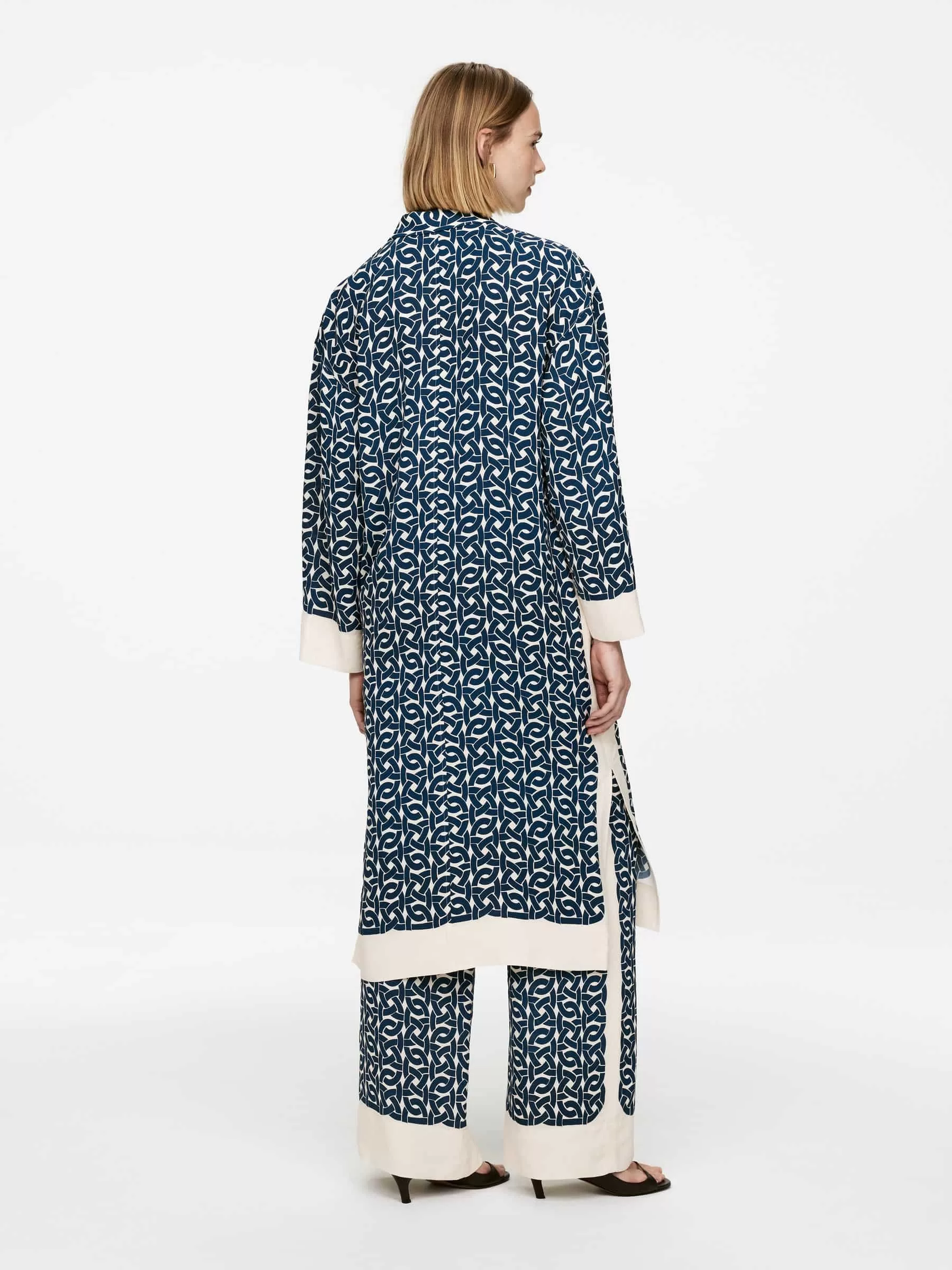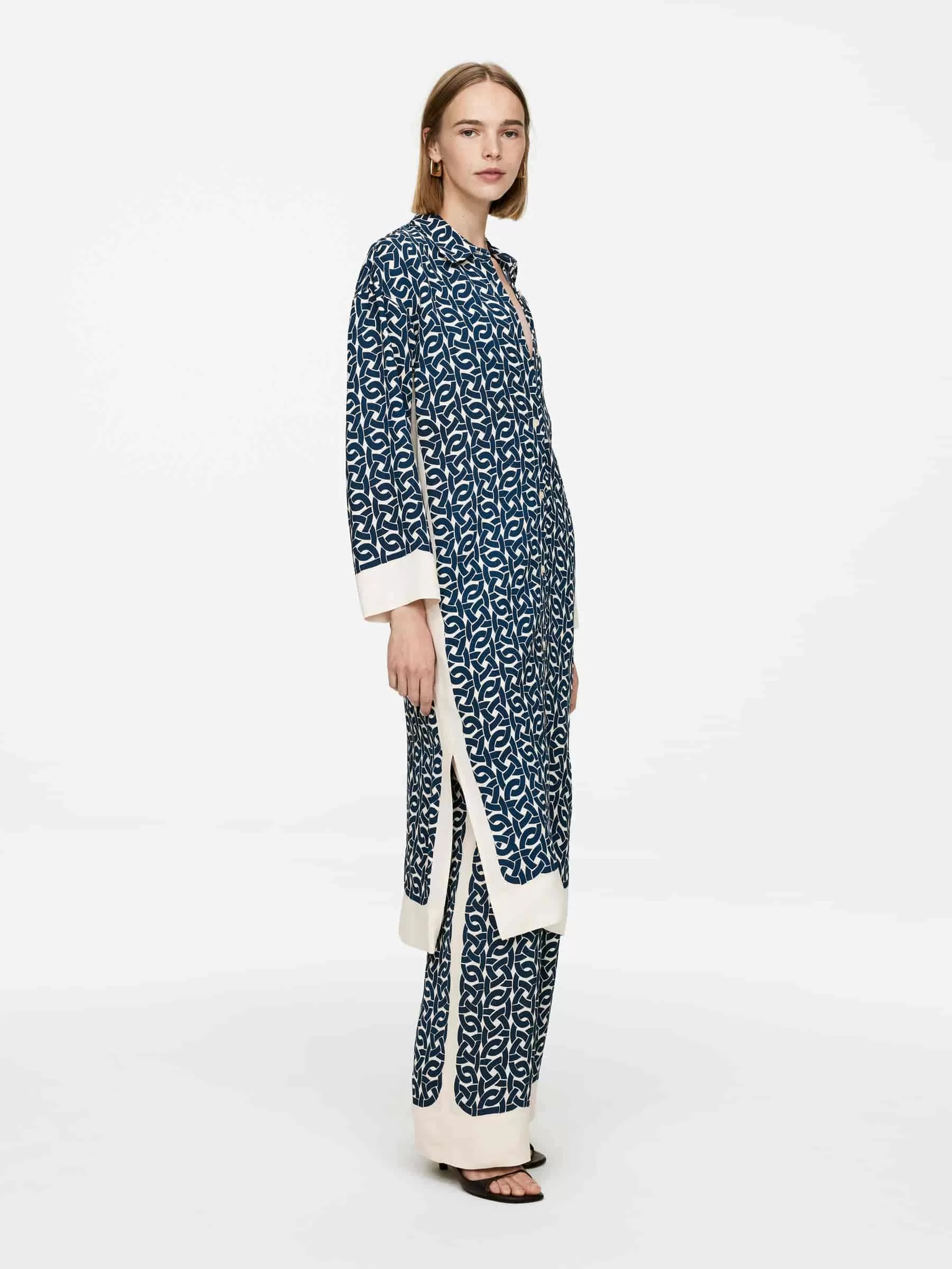 Bedrucktes Kleid aus einer Viskose-Hanf-Mischung. Ein langer, geknöpfter Stil mit Seitenschlitzen. Normale Passform.