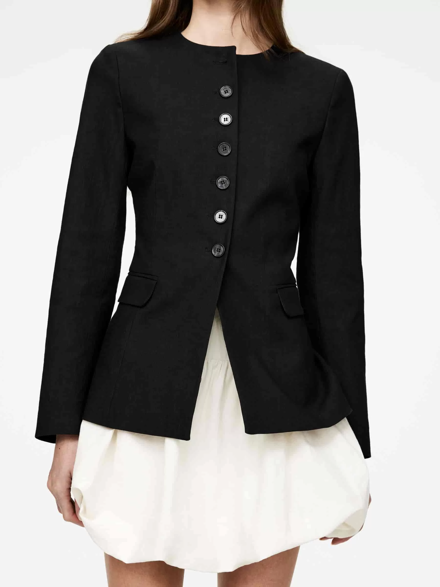 Kragenloser Blazer mit Knopfverschluss, Abnähern und Pattentaschen. Dieses gefütterte Modell ist schmal geschnitten.
