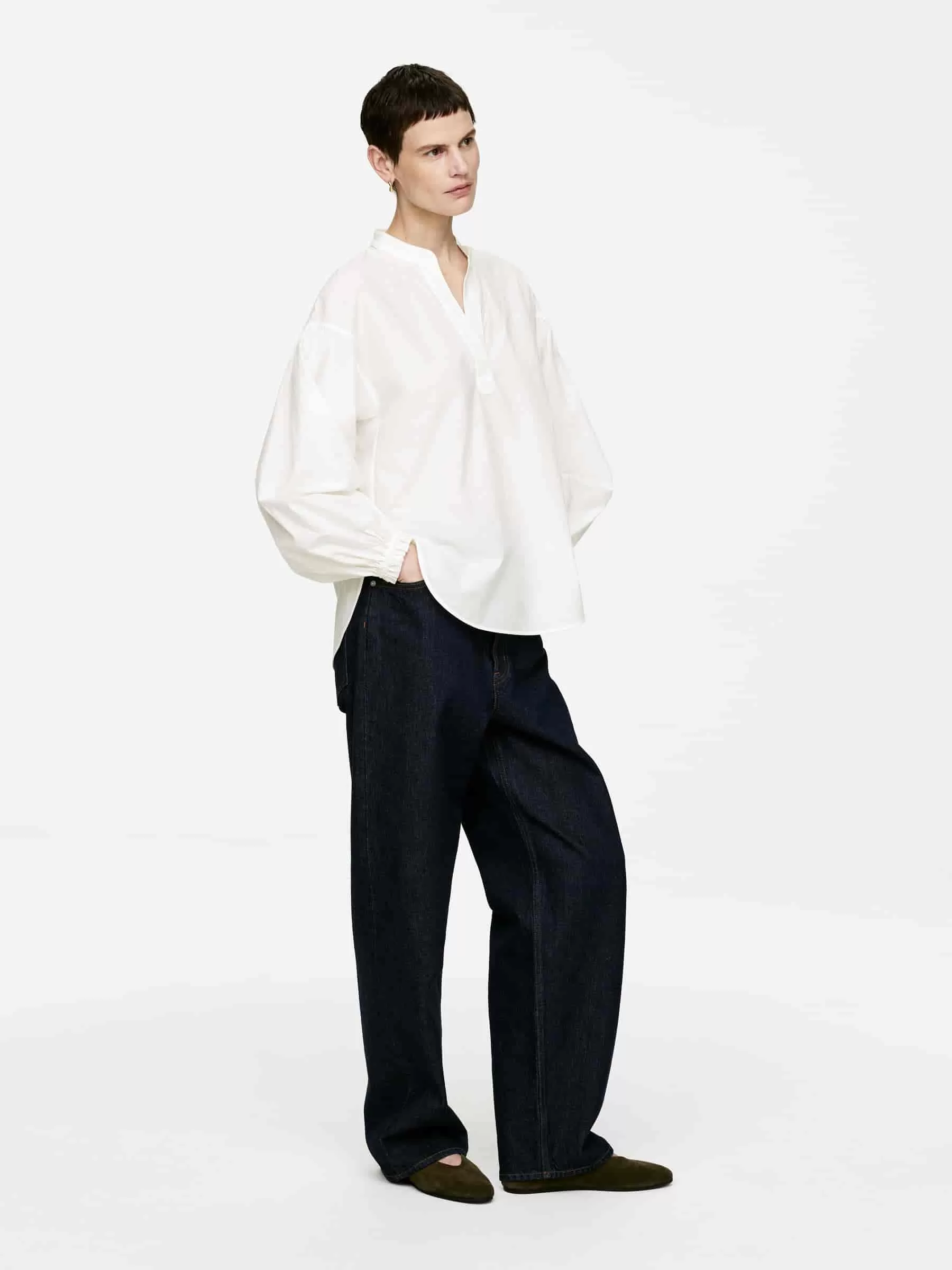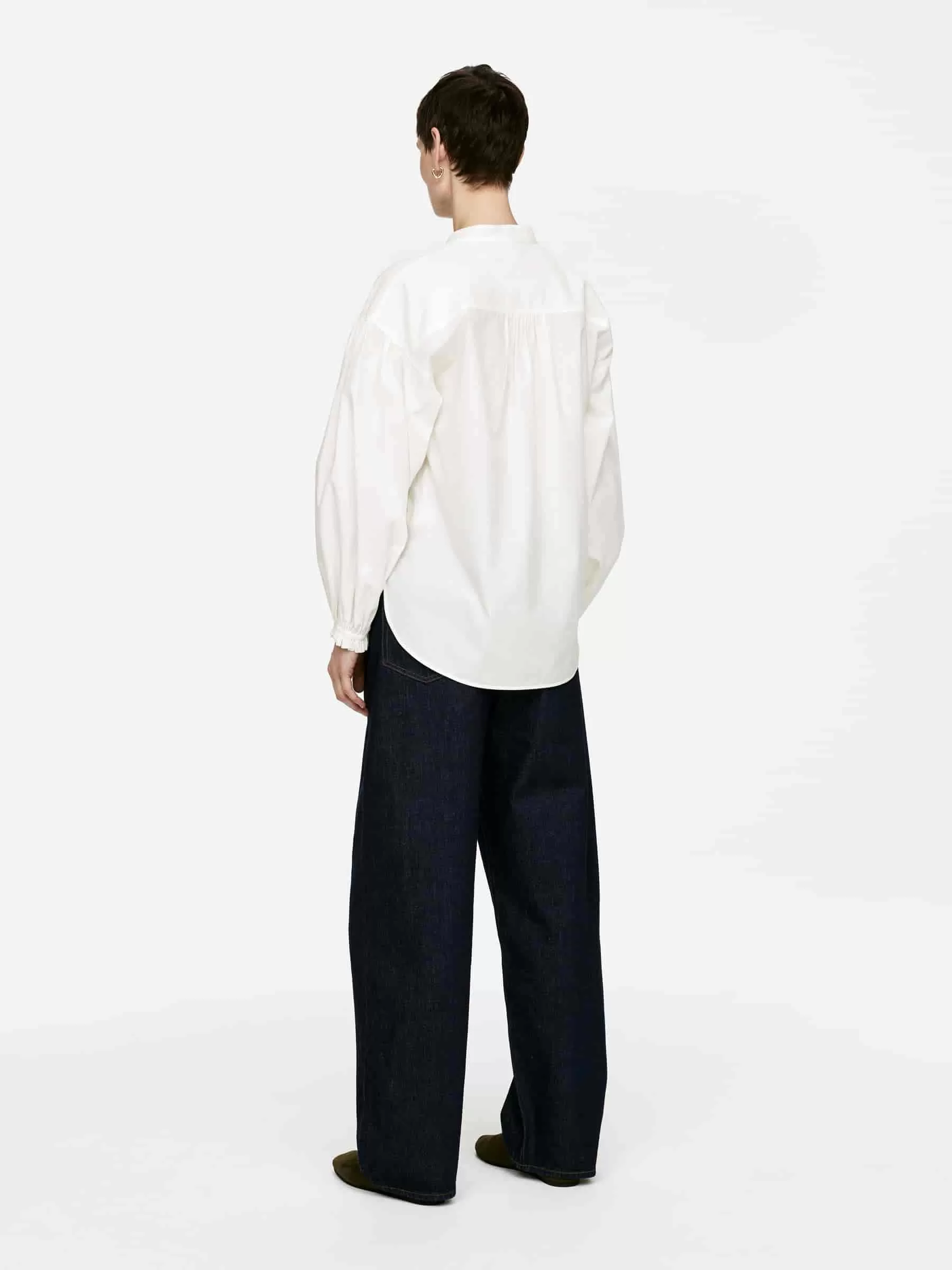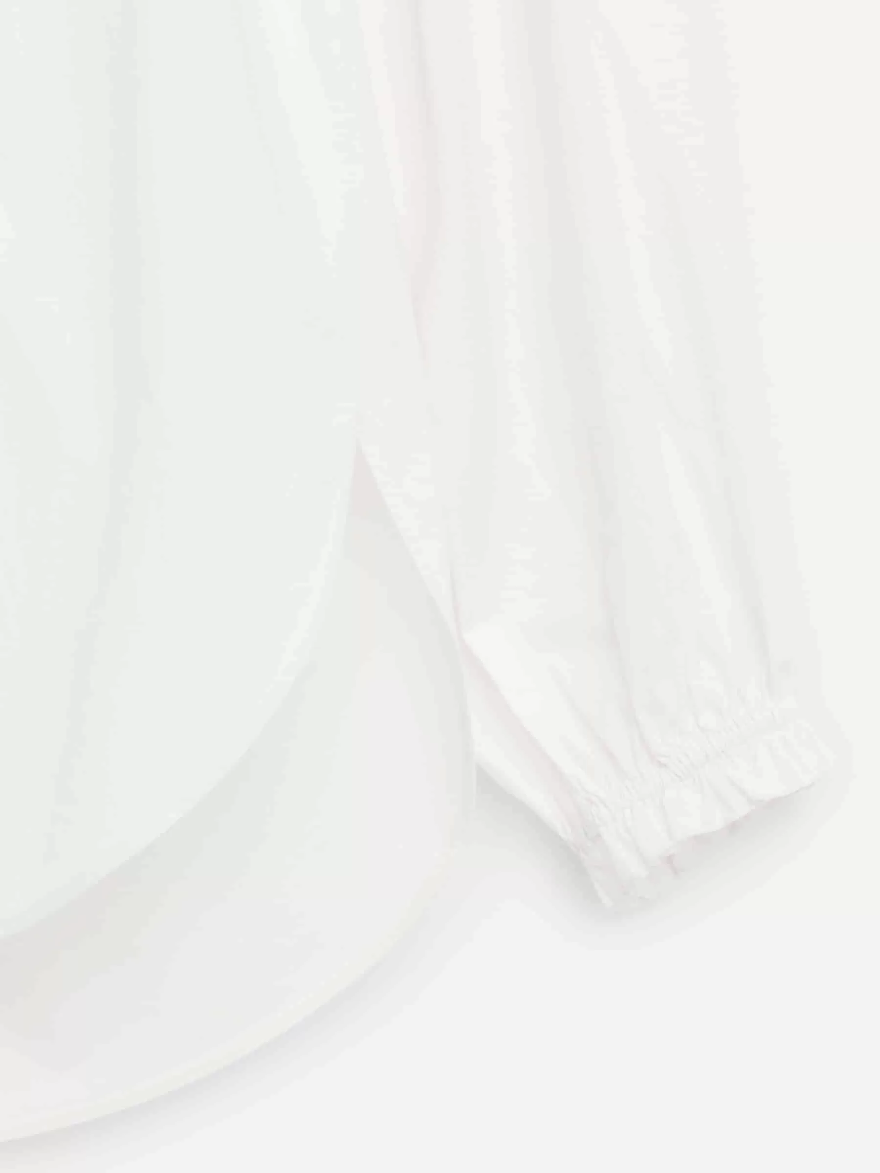 Baumwollbluse mit V-Ausschnitt, voluminösen Ärmeln und Raffungen an den Manschetten. Normale Passform.