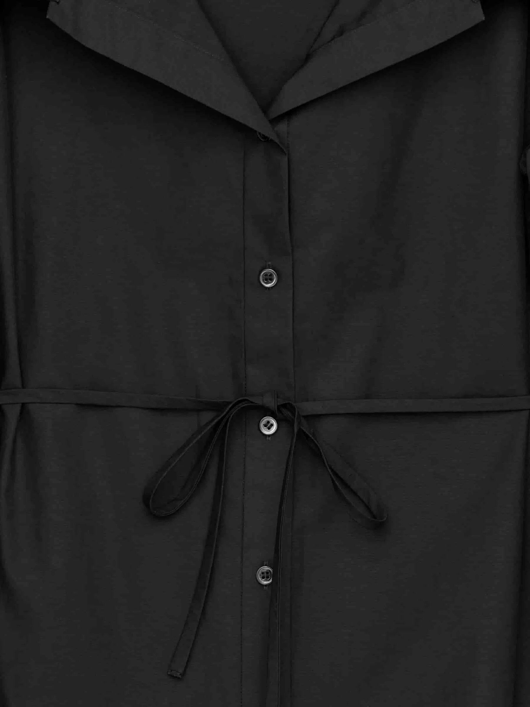 Blusenstil mit breitem, offenem Kragen, Knopfverschluss und Bindeband in der Taille. Überschnittene Schulter und normale Passform.