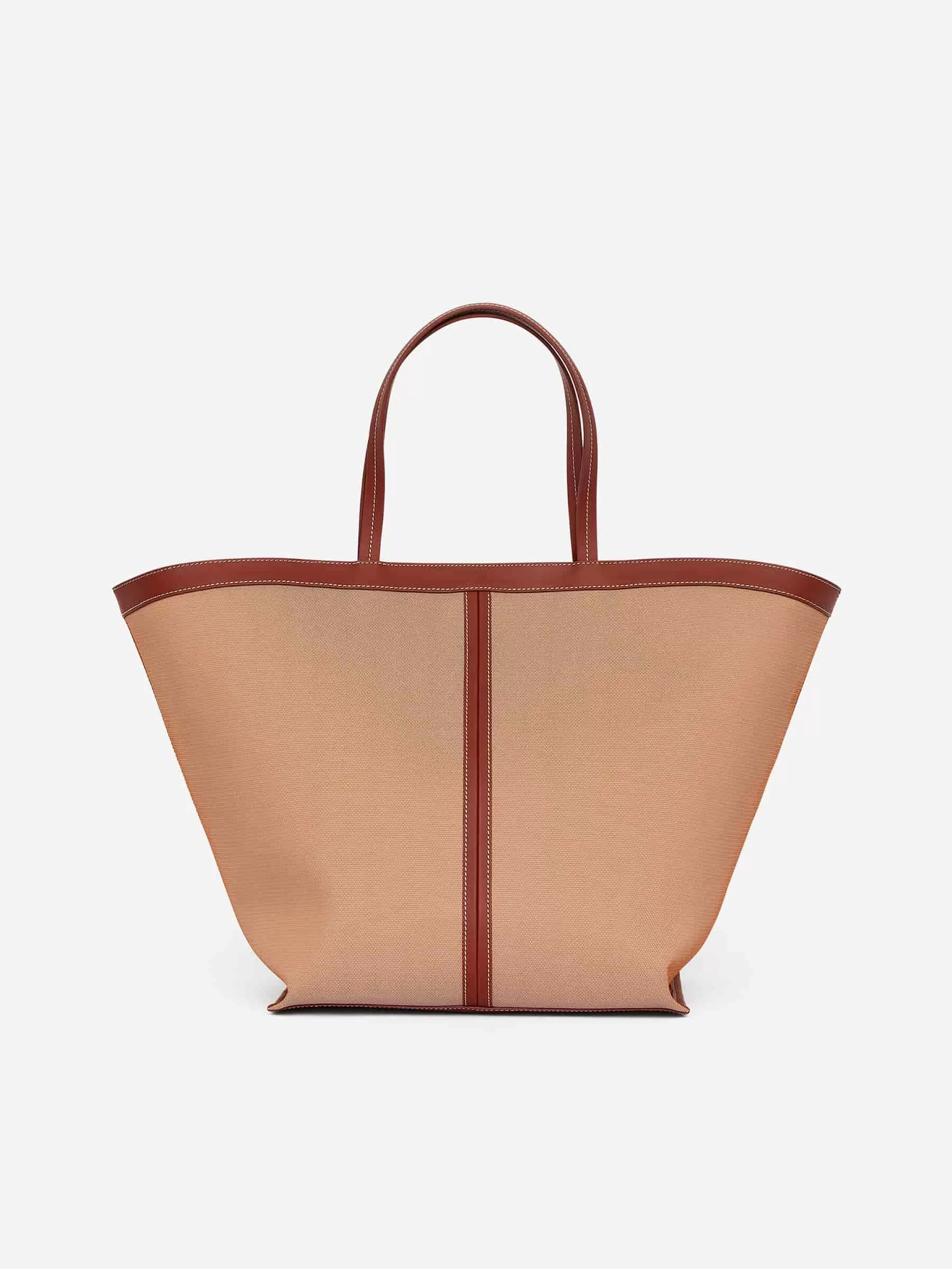 Canvas-Einkaufstasche mit Lederboden, Magnetverschluss und Innentasche mit Reißverschluss. Bodenbreite 30,5 cm, Bodentiefe 23,5 cm. Obere Breite 58 cm, Höhe 35,5 cm. Grifftiefe 23 cm.