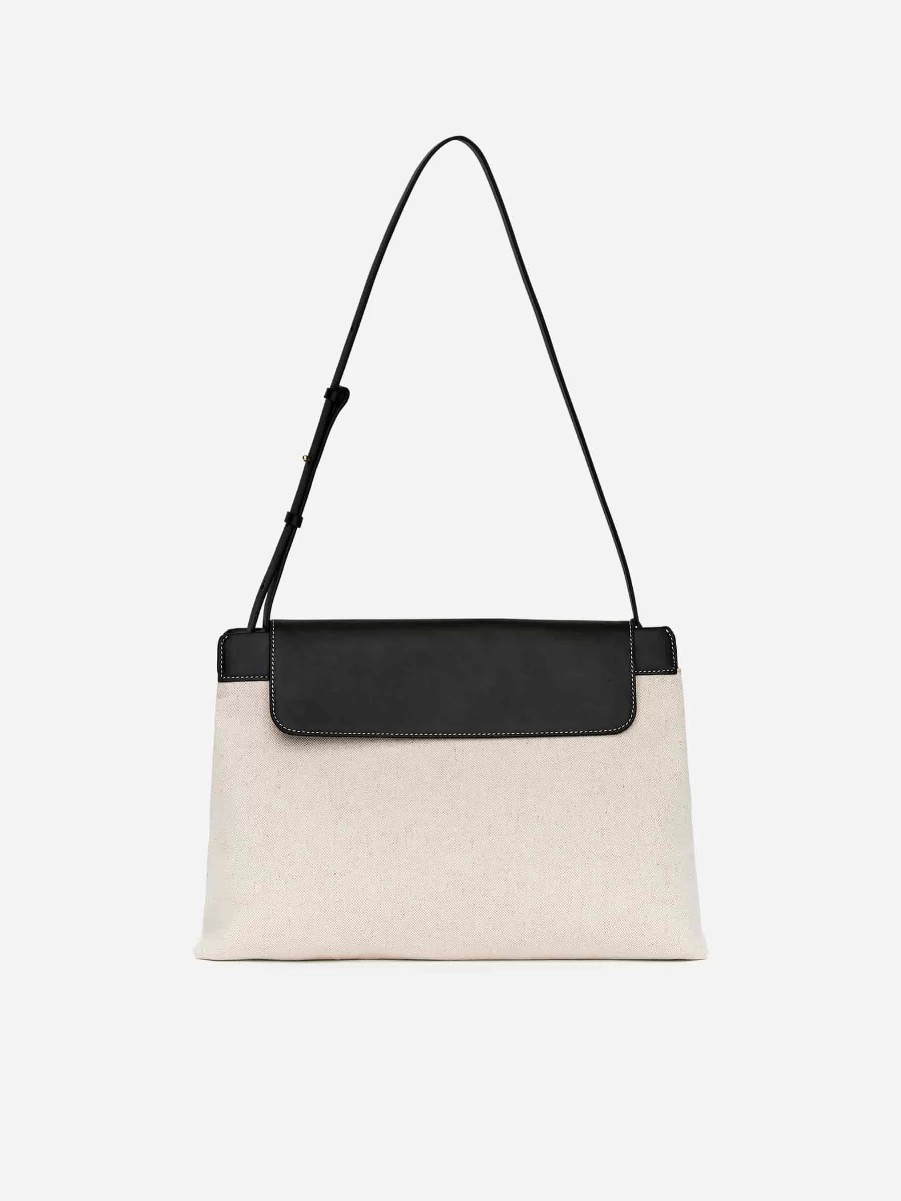 Umhängetasche aus Baumwoll-Leinen-Canvas und Leder. Detailliert mit Doppelfächern, einer Innentasche und einem verstellbaren Schultergurt. Breite 39 cm, Höhe 25,5 cm, Tiefe 13 cm. Riemenlänge 37 cm.