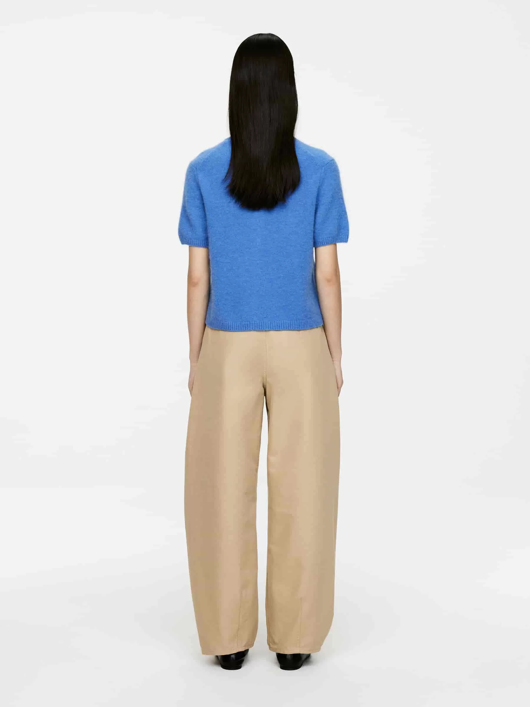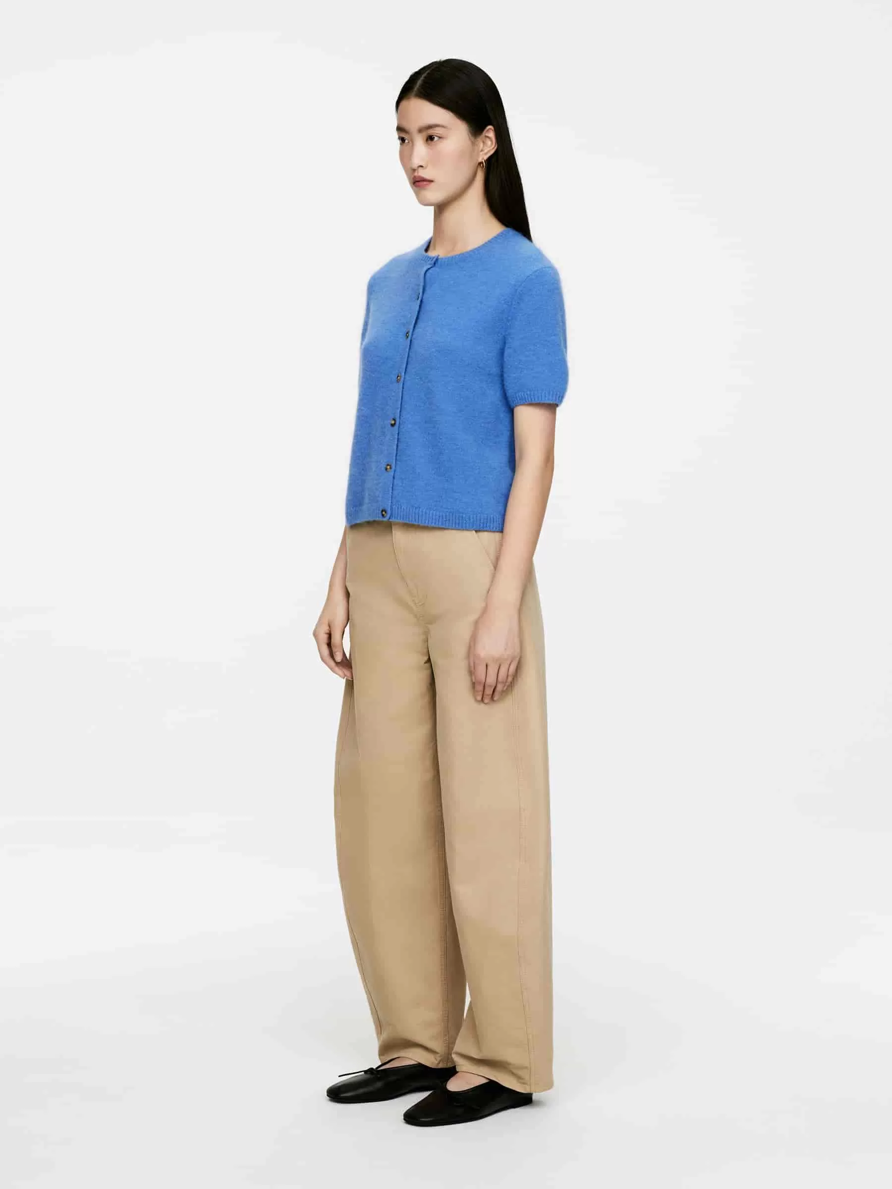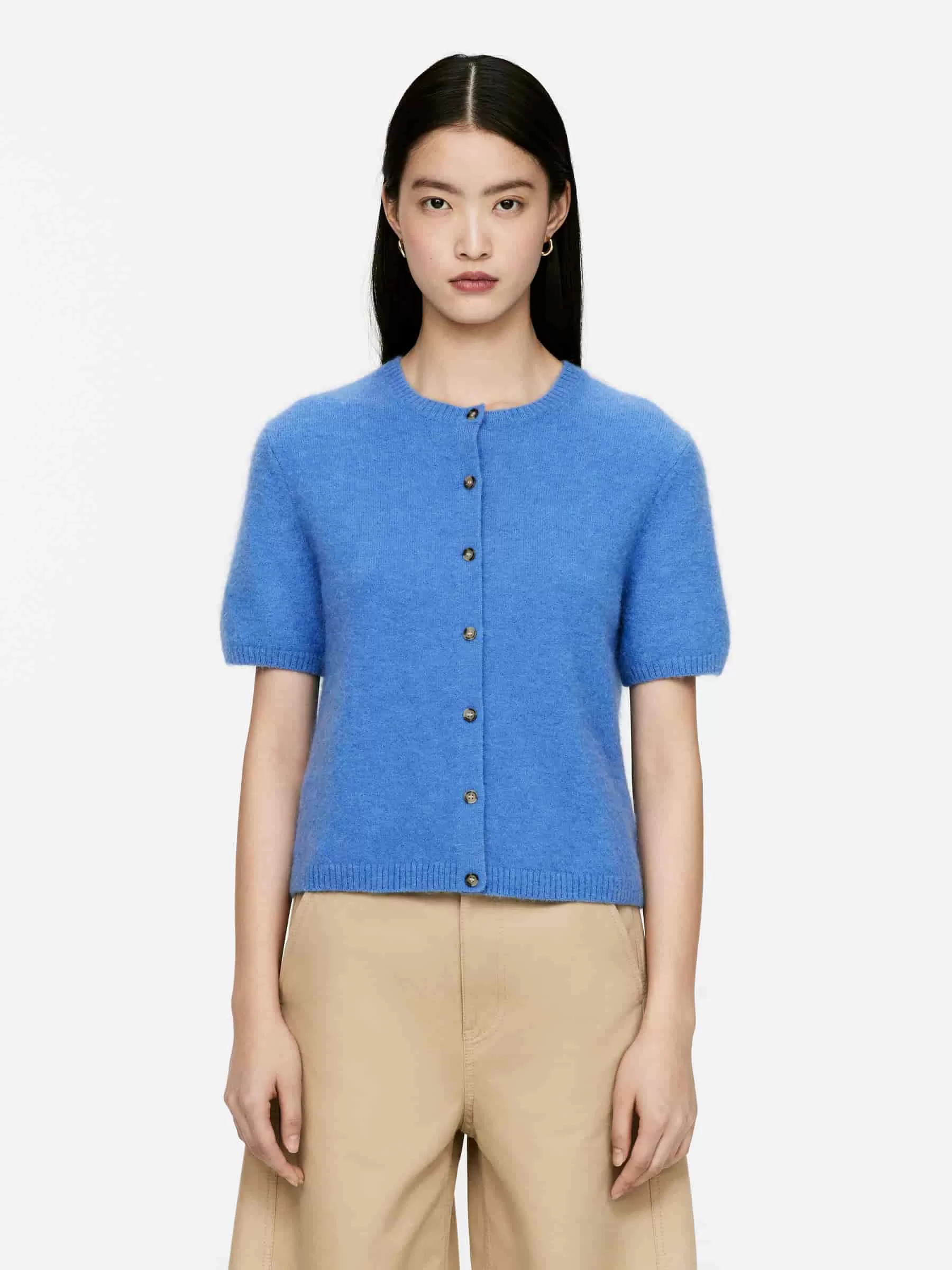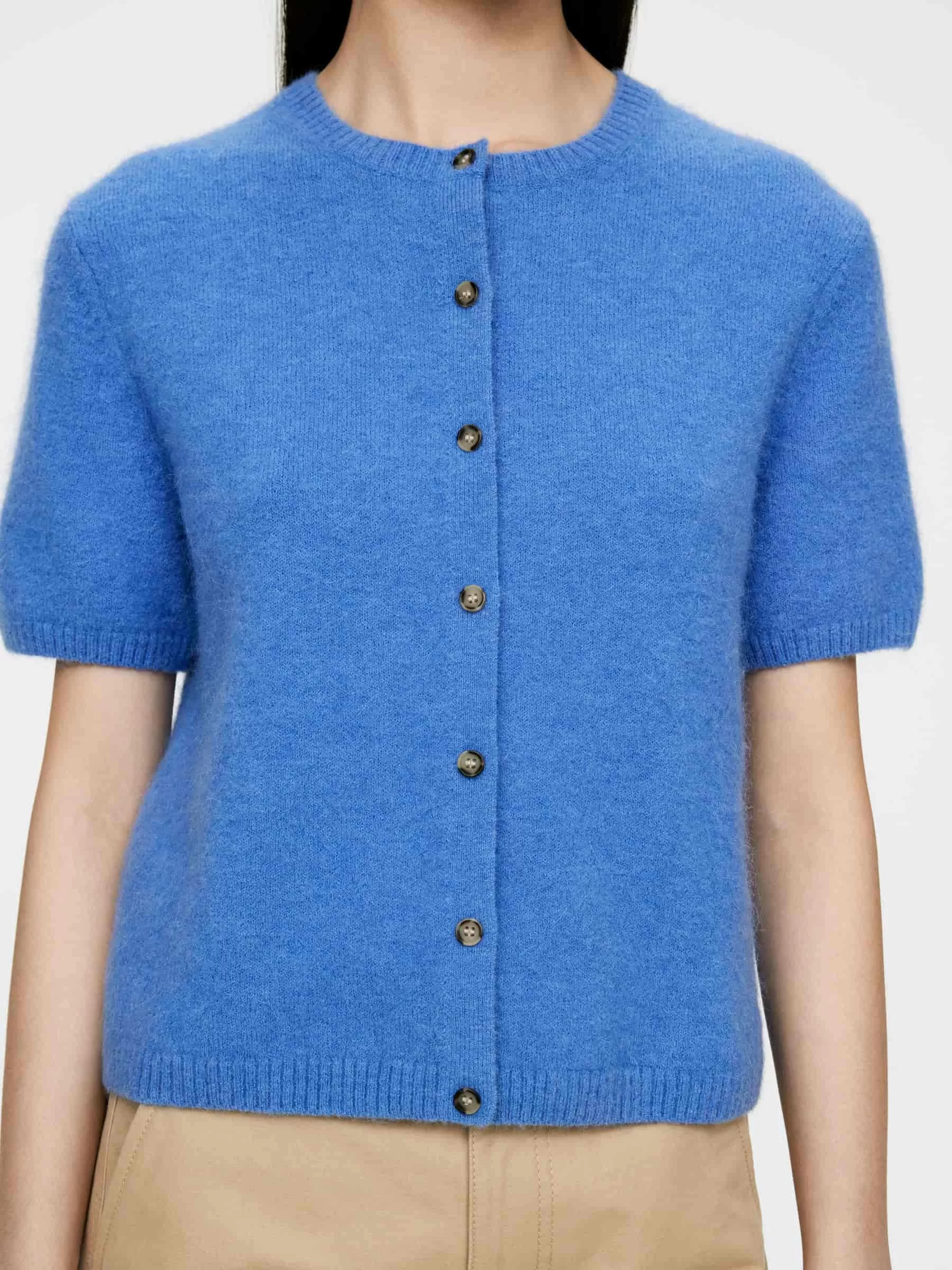 Kurzärmeliger Cardigan, gestrickt aus einer Woll-Alpaka-Mischung. Mit Knopfverschluss und normaler Passform. Dieser Stil enthält 31 % RAS-Alpaka und 31 % RWS-Wolle (TE-00047206). Produkte, die nach dem Responsible Wool Standard (RWS) und dem Responsible Alpaca Standard (RAS) zertifiziert sind, enthalten Wolle und Alpakafasern von Farmen, die unabhängig nach Tierschutz- und Landmanagementanforderungen zertifiziert sind.