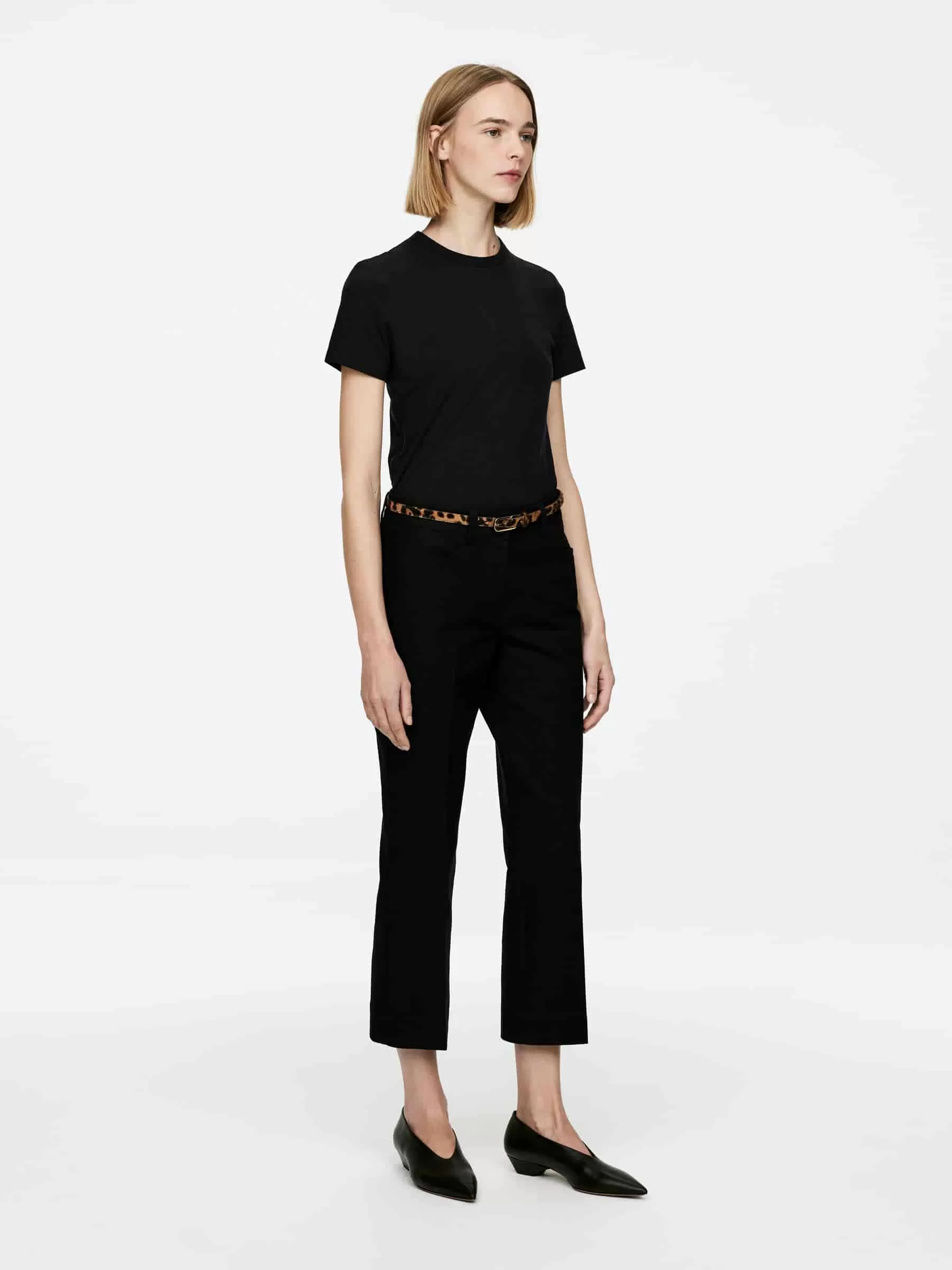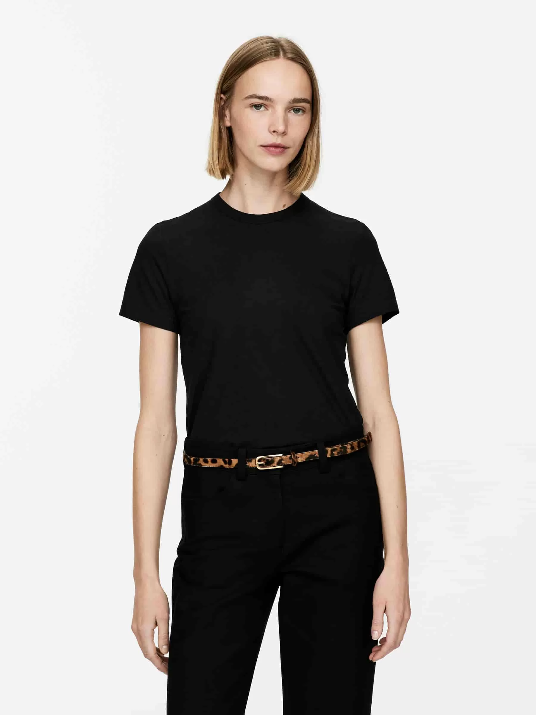 Passgenaues T-Shirt aus Eiskrepp-Strick-Baumwollqualität, die Fließfähigkeit mit einem einzigartigen, frischen Griffgefühl verbindet. Detailliert mit Bambusstichen am Ende der Ärmel und am unteren Saum sowie einer breiten Einfassung am Hals.