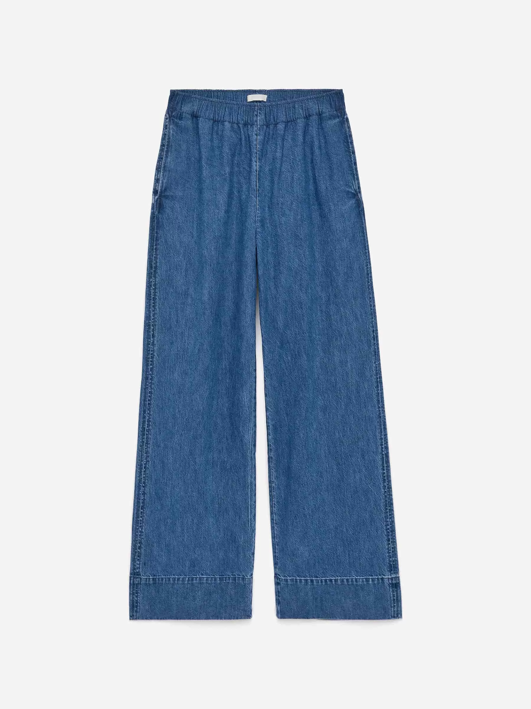 Jeans aus weichem Denimstoff mit mittelhohem Bund, Gummizügen und Seitentaschen. Entspannte Passform.
