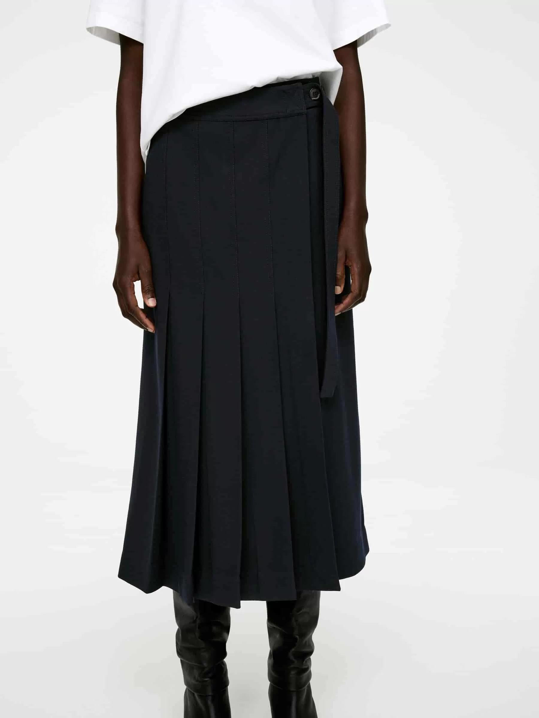 Mittellanger Rock mit Faltendetails und Wickelfront. Dies ist ein gerade geschnittener Rock mit einem Gürteldetail an der Taille. Der Rock besteht zu 50 % aus RWS-Wolle (TE-00047206). Produkte, die nach dem Responsible Wool Standard (RWS) zertifiziert sind, enthalten Wollfasern von Farmen, die unabhängig nach Tierschutz- und Landbewirtschaftungsanforderungen zertifiziert sind.