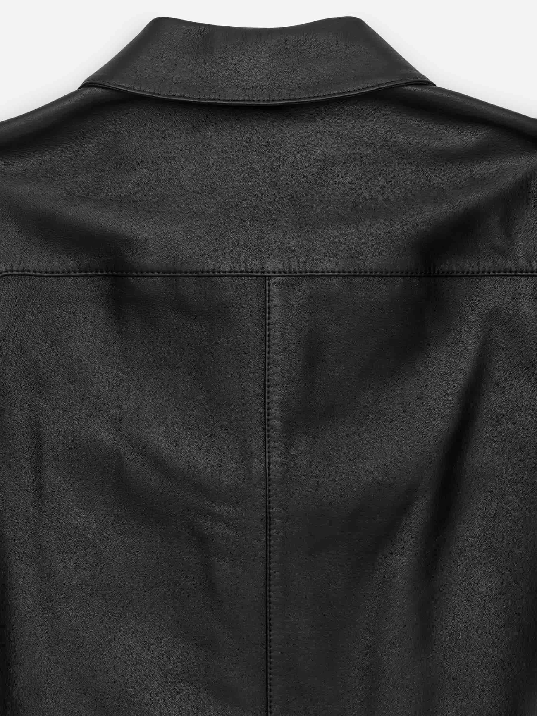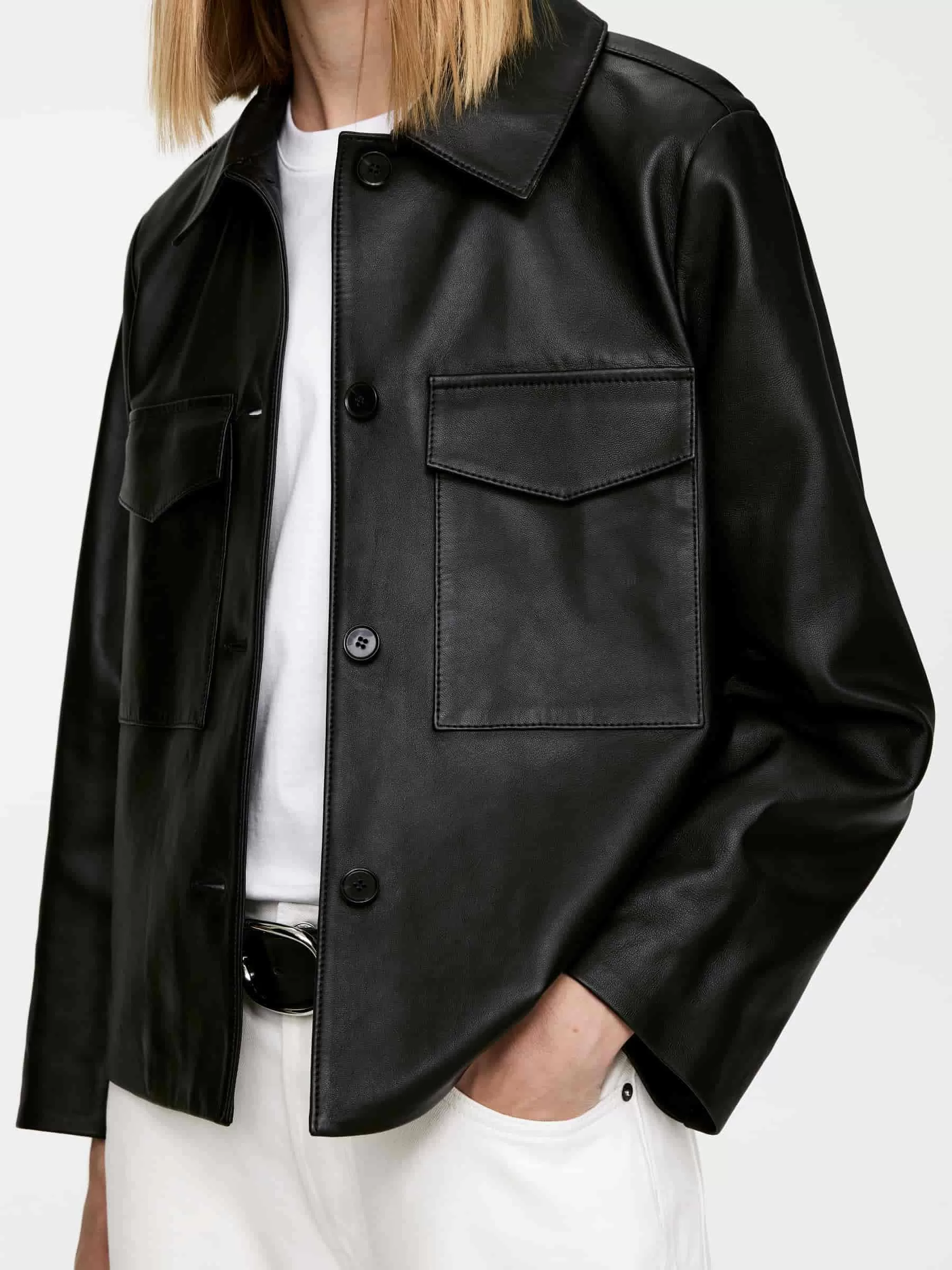 Jacke aus chromfreiem Leder. Ein gefütterter Stil mit Knopfverschluss und aufgesetzten Taschen mit Patte auf der Brust.