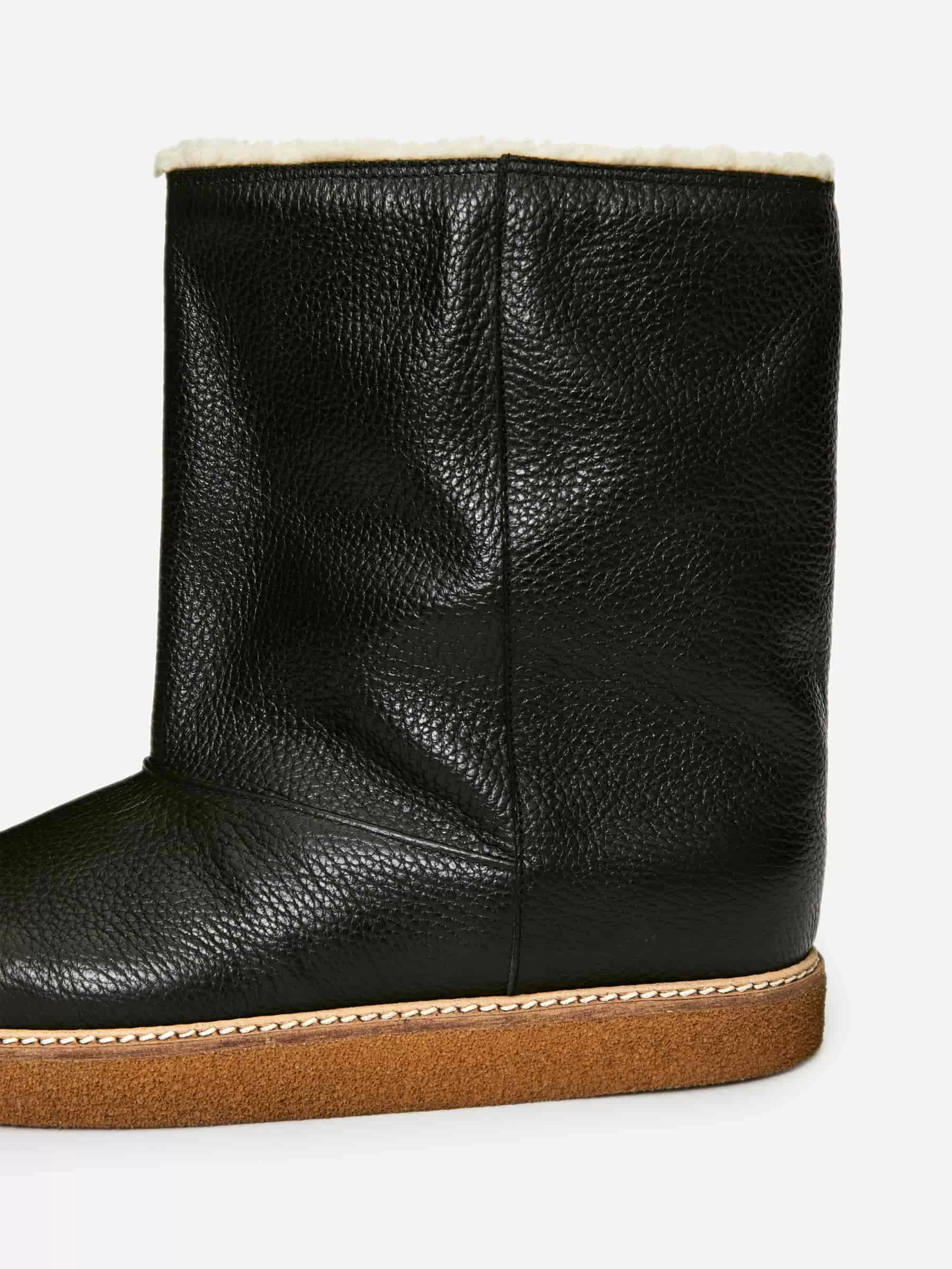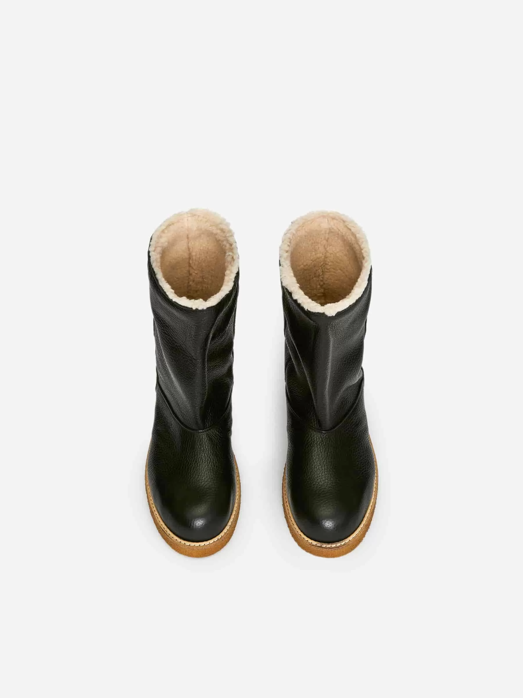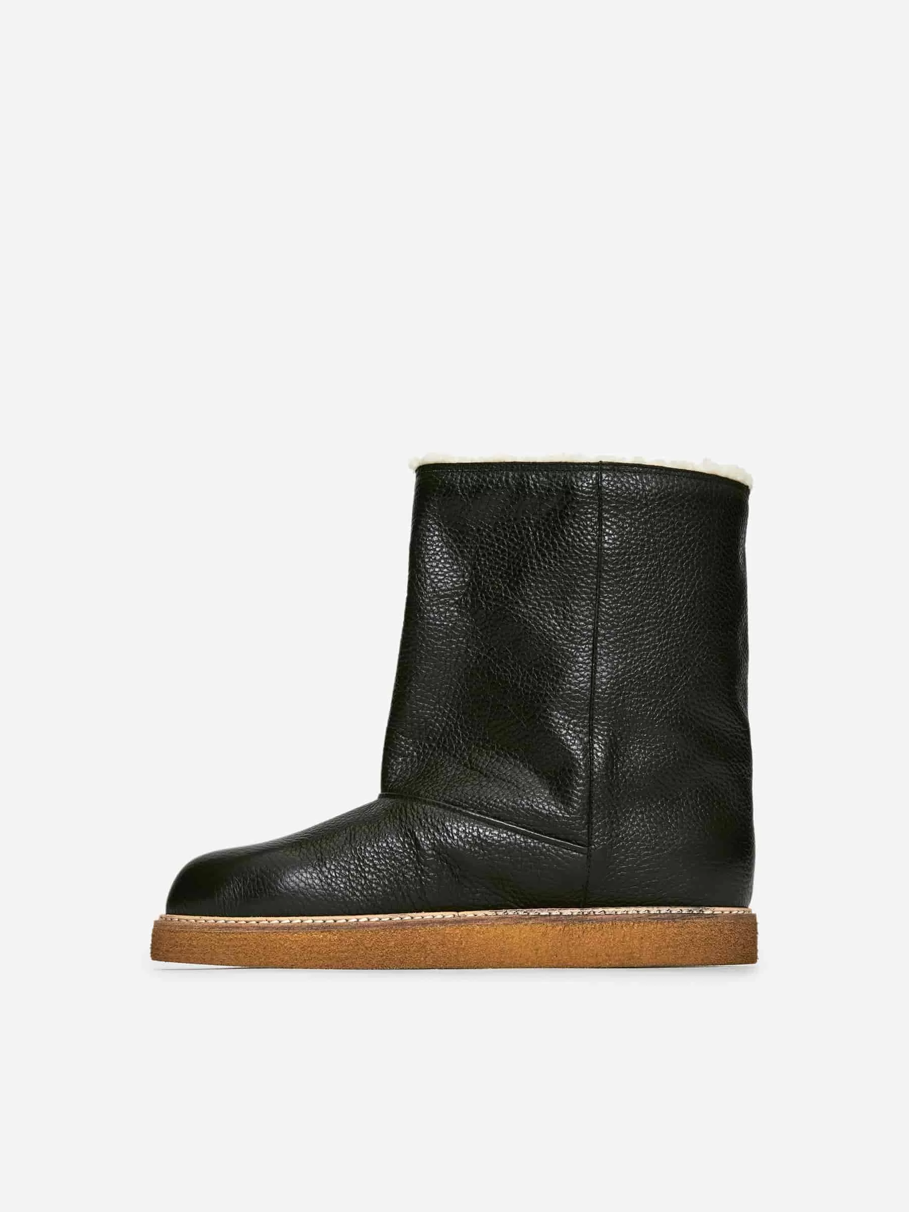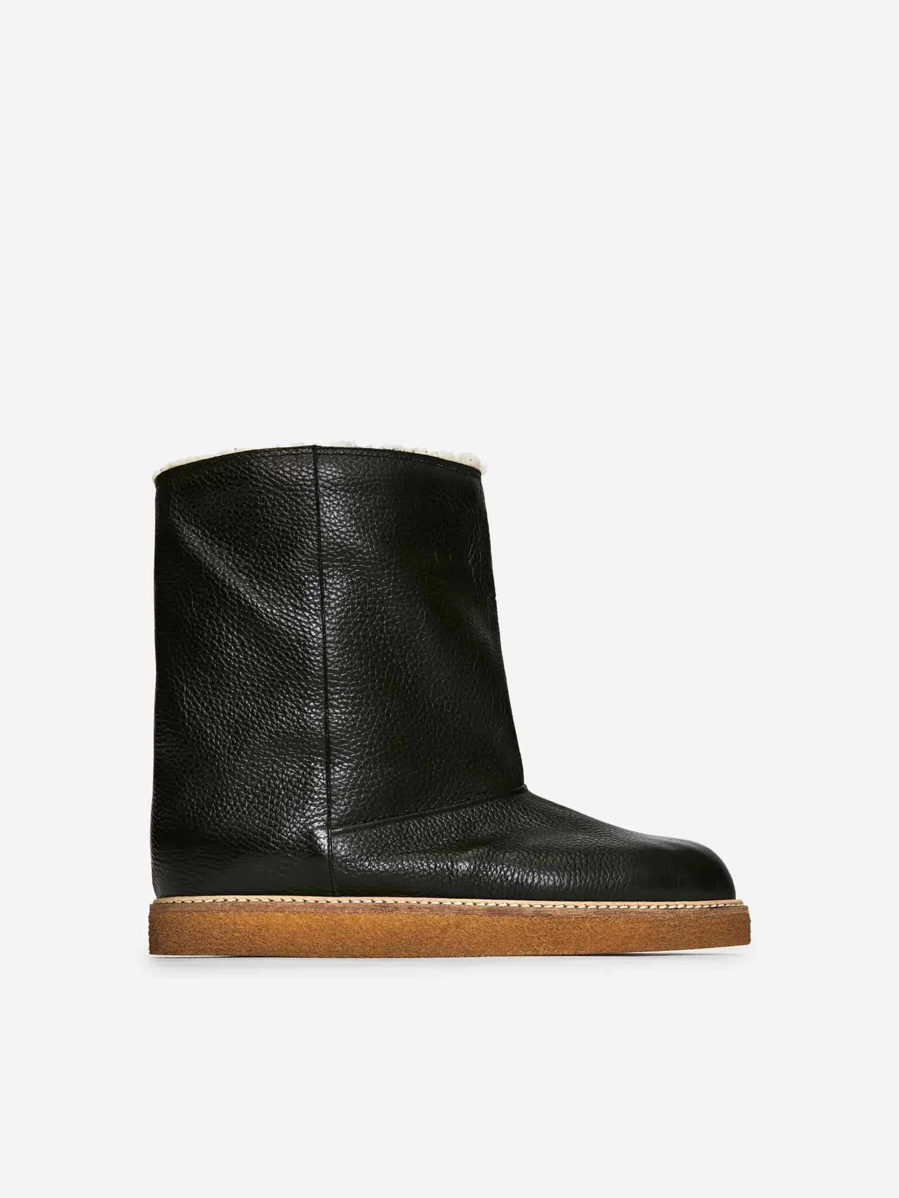 Lederstiefel mit Futter aus Lammfellimitat. Ein wärmender Stil mit einem Rahmen und dekorativen Nahtdetails.