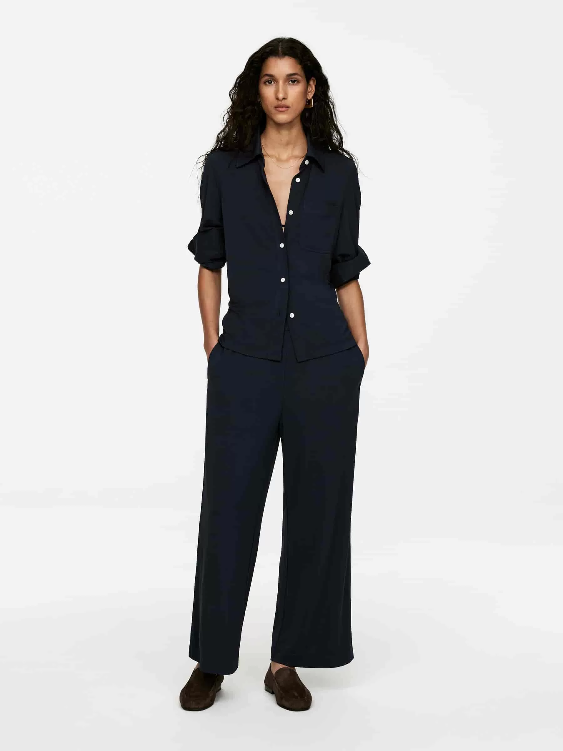 Hose mit wunderschönem Fall aus Jerseystoff aus Viskose und einem Hauch Elastan für Dehnbarkeit. Ein hoch taillierter, verkürzter Stil mit Seitentaschen und Raffungen hinten am Bund.