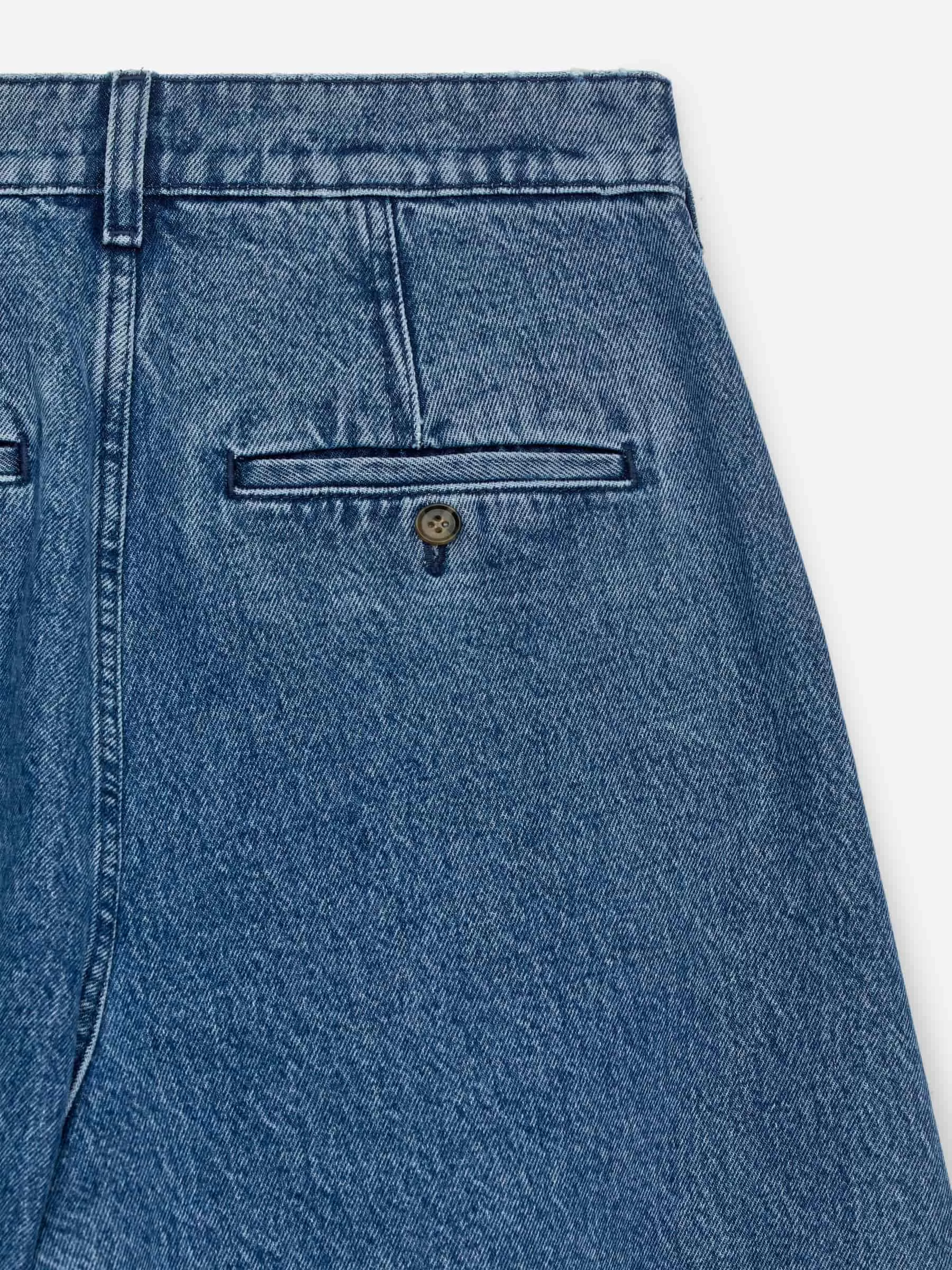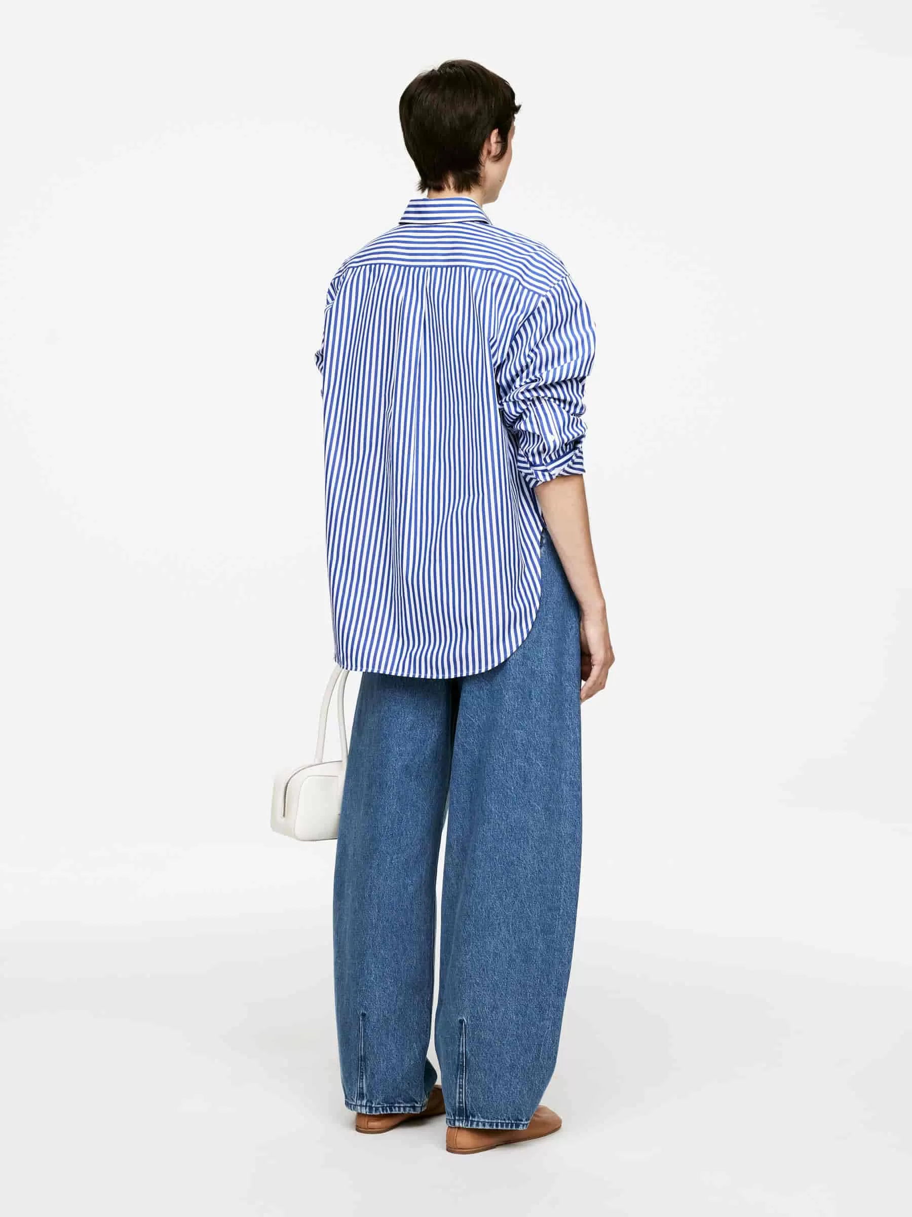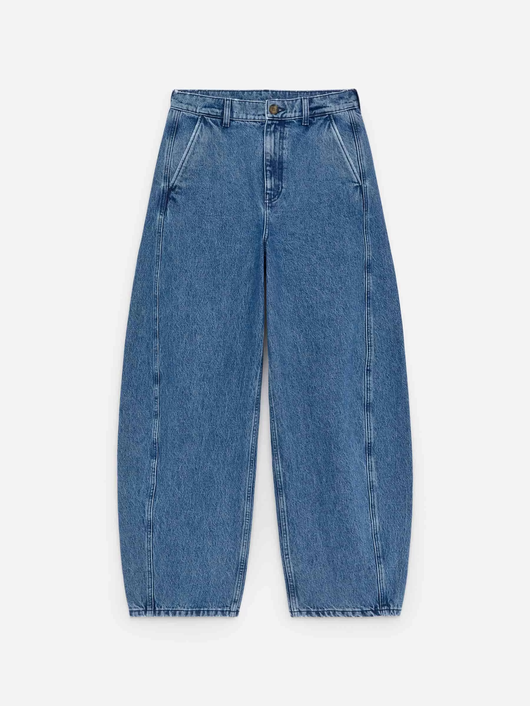Fassförmige Jeanshose aus Baumwolle. Ein Modell mit mittlerer Taille, schrägen Seitentaschen, geknöpften Leistentaschen hinten und Reißverschluss.