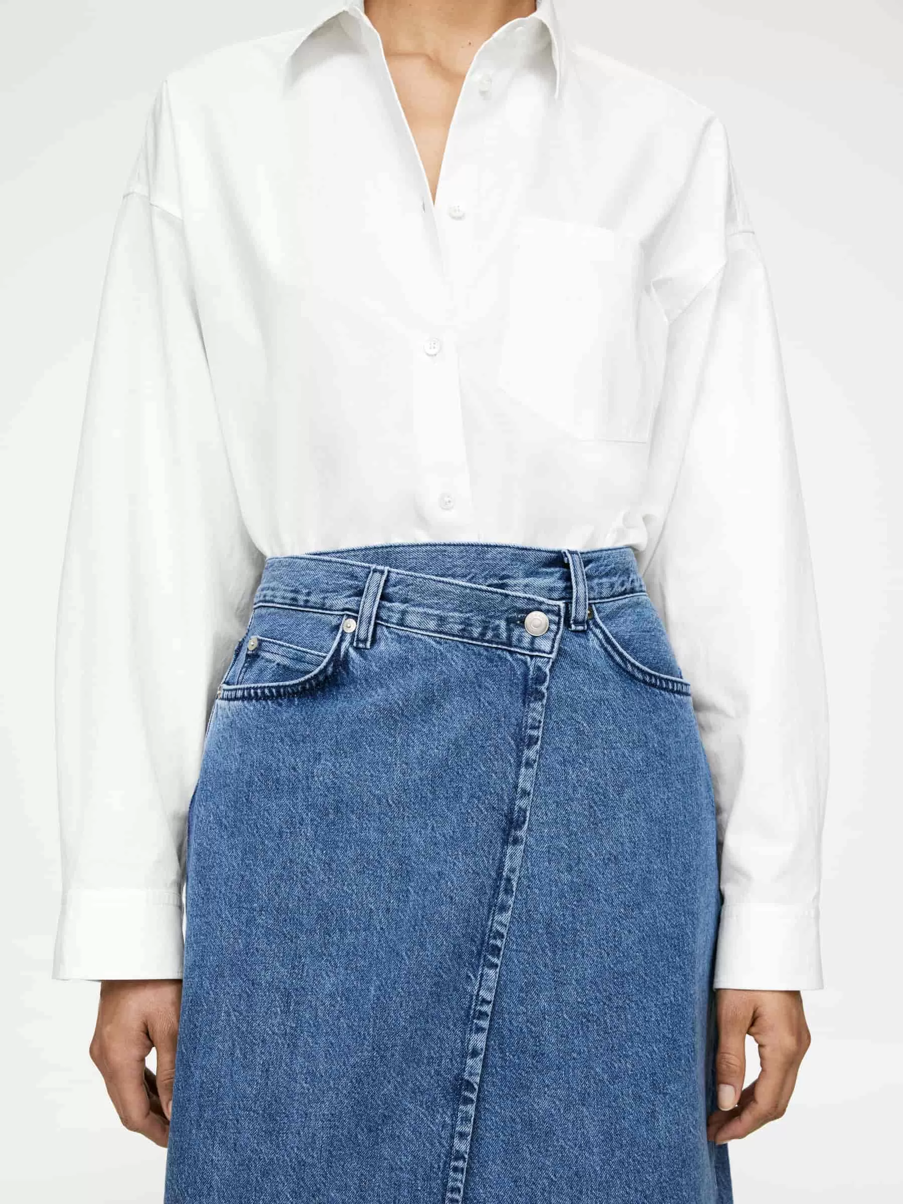 Wickelrock mit hoher Taille, asymmetrischem Saum und Knopfverschluss. Hergestellt aus mittelschwerem Denim aus Baumwolle.