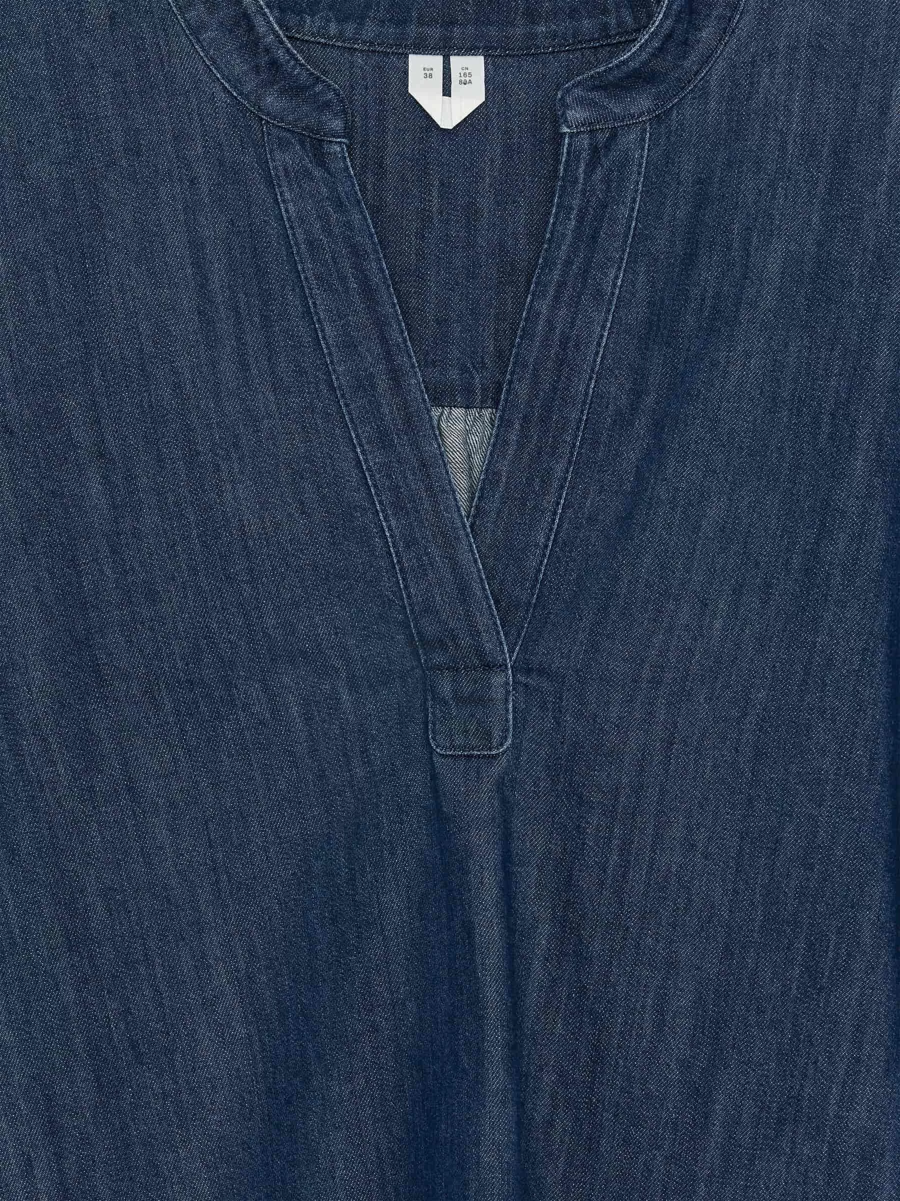 Jeansbluse aus Baumwolle. Ein Modell mit V-Ausschnitt und voluminösen Ärmeln mit Raffungen an den Manschetten. Normale Passform.