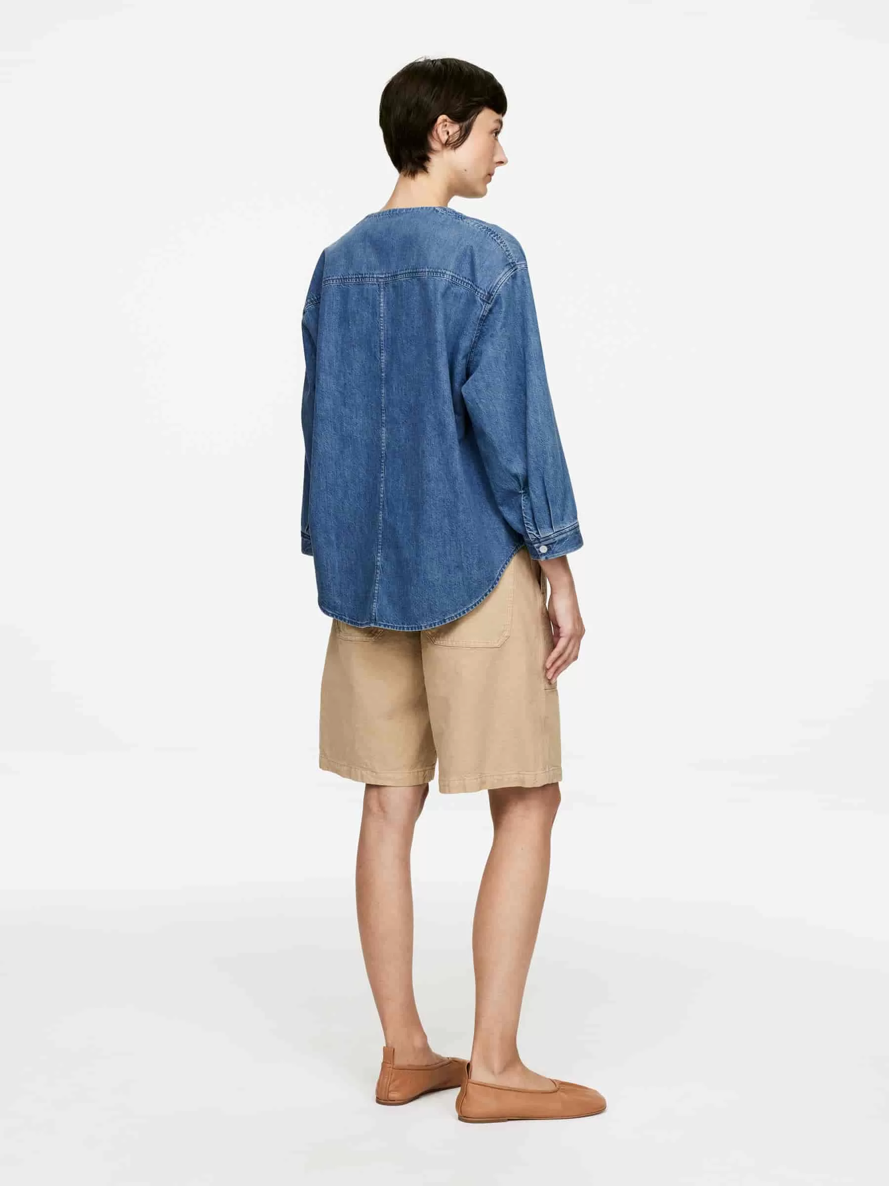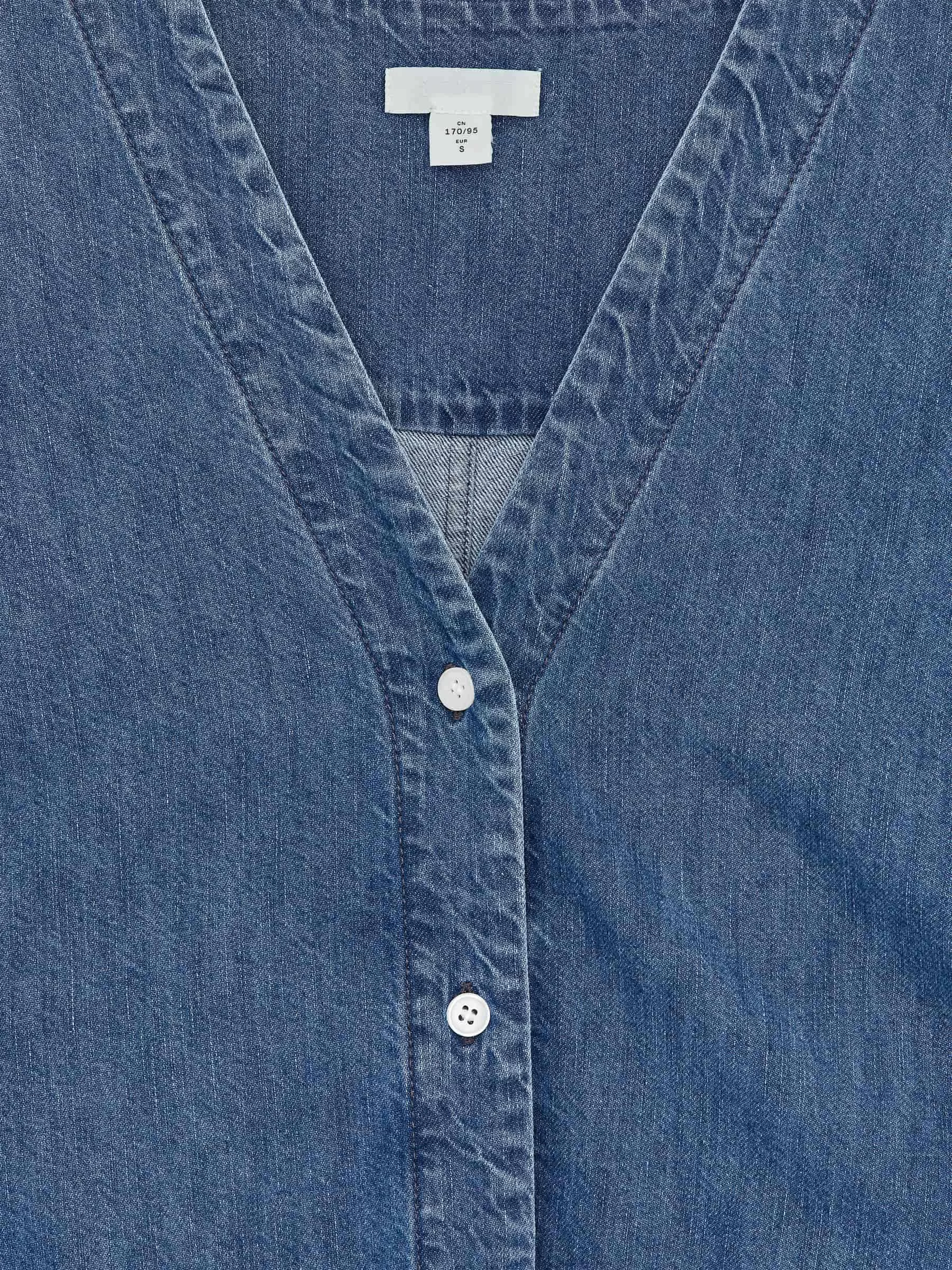 Jeansbluse aus Baumwolle. Mit V-Ausschnitt, Knopfverschluss und 3/4-Ärmeln. Lockere Passform.