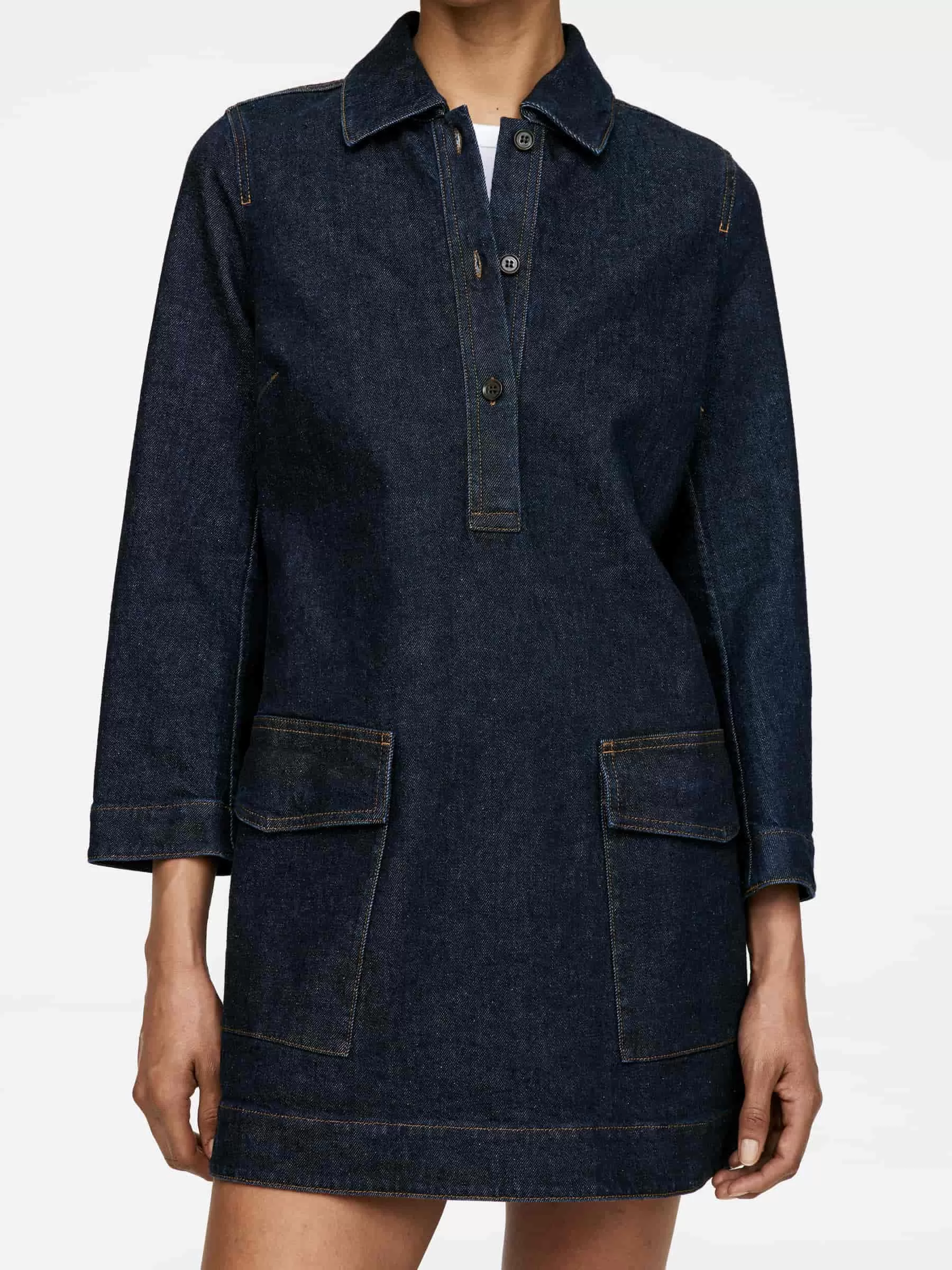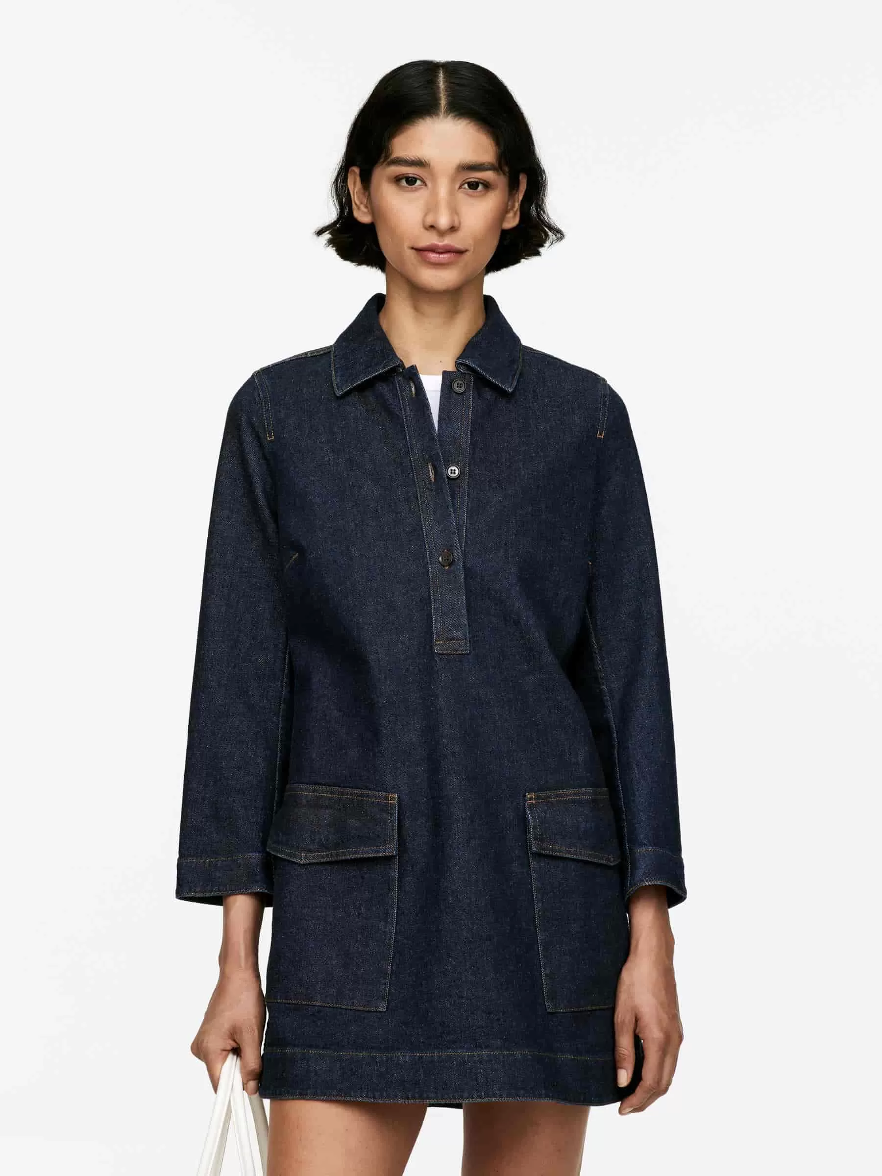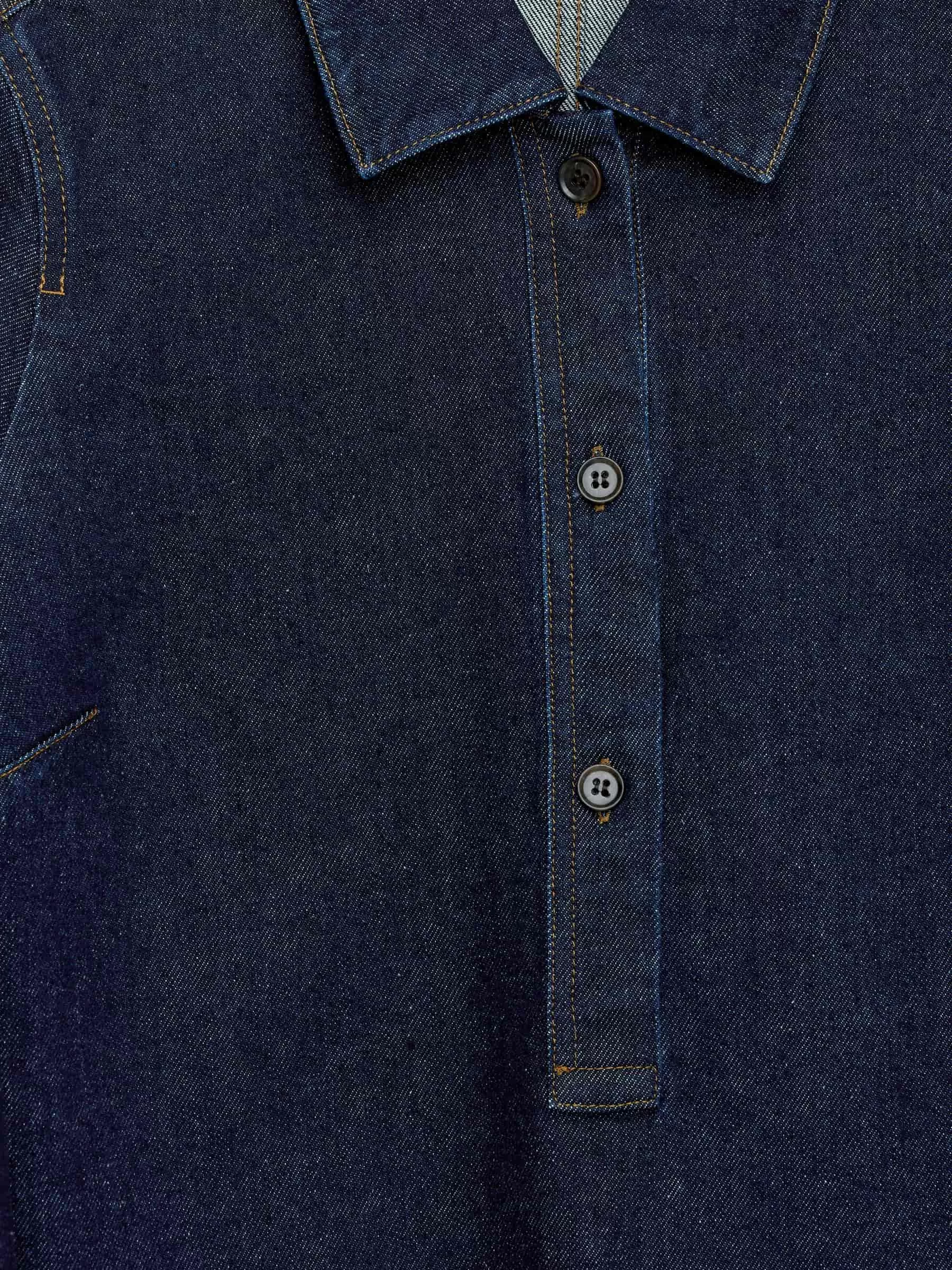 Kurzes Jeanskleid aus Baumwolle mit einem Hauch Elastan für Dehnbarkeit. Mit einer geknöpften halben Knopfleiste und aufgesetzten Taschen.