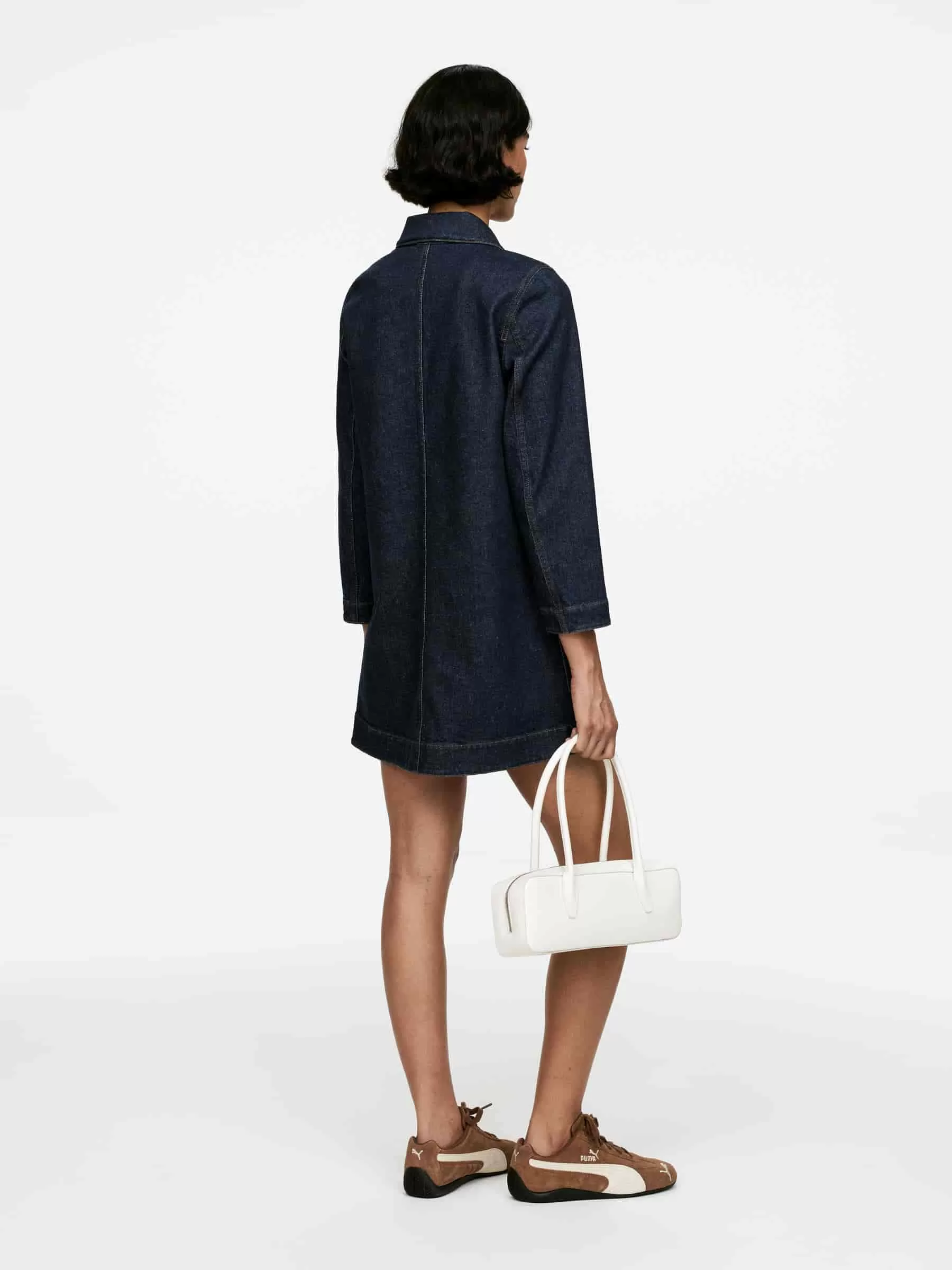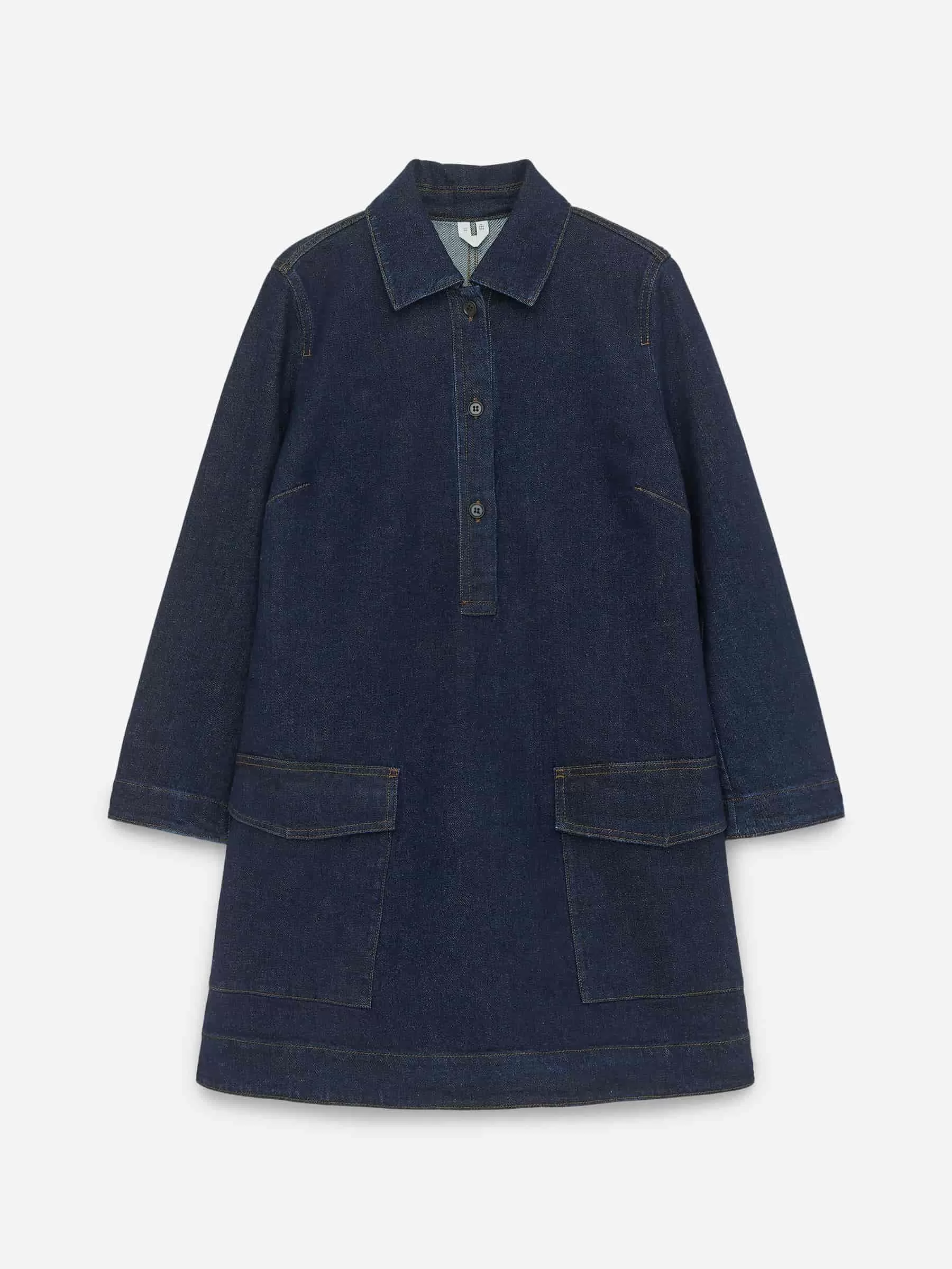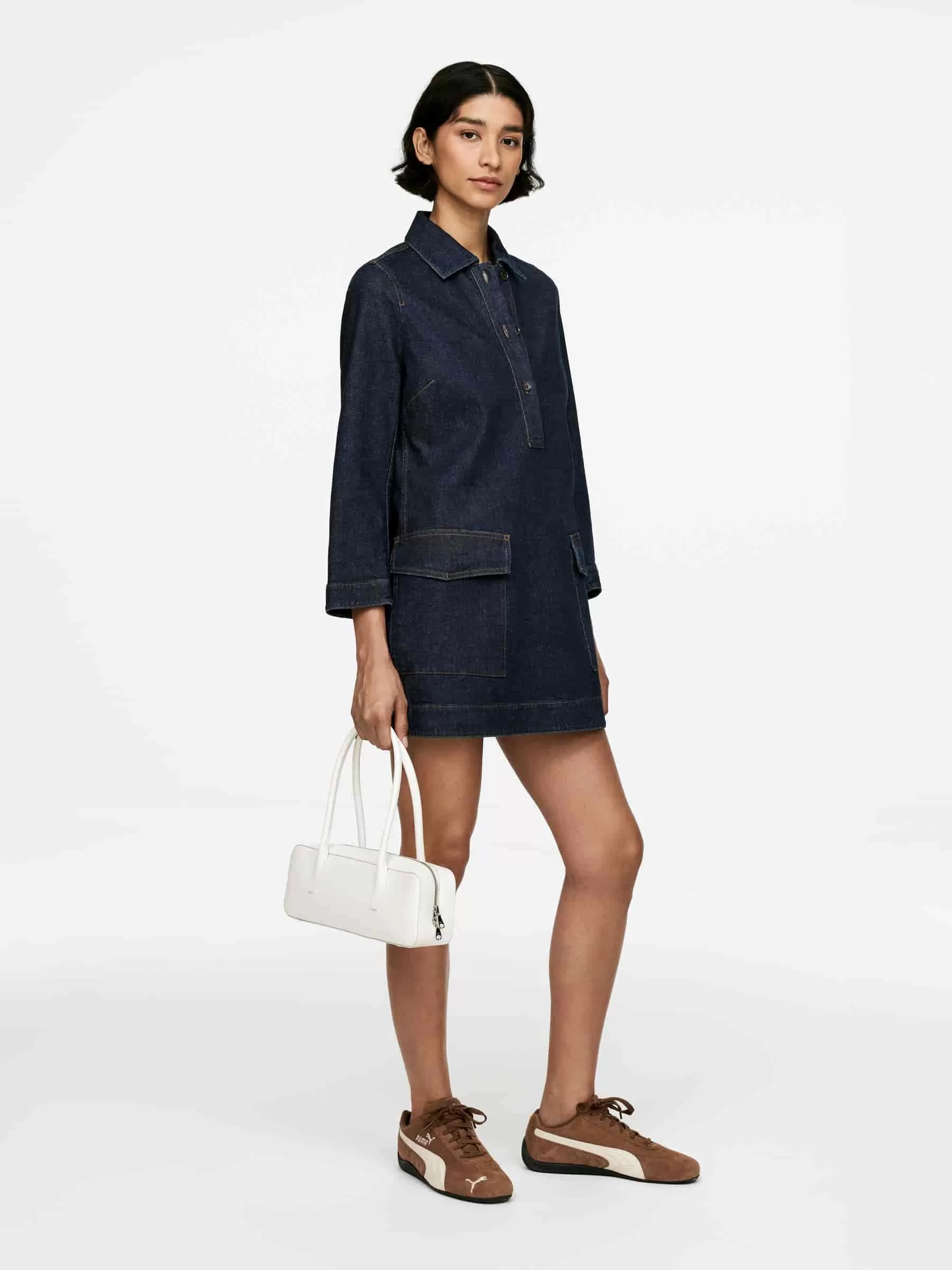 Kurzes Jeanskleid aus Baumwolle mit einem Hauch Elastan für Dehnbarkeit. Mit einer geknöpften halben Knopfleiste und aufgesetzten Taschen.
