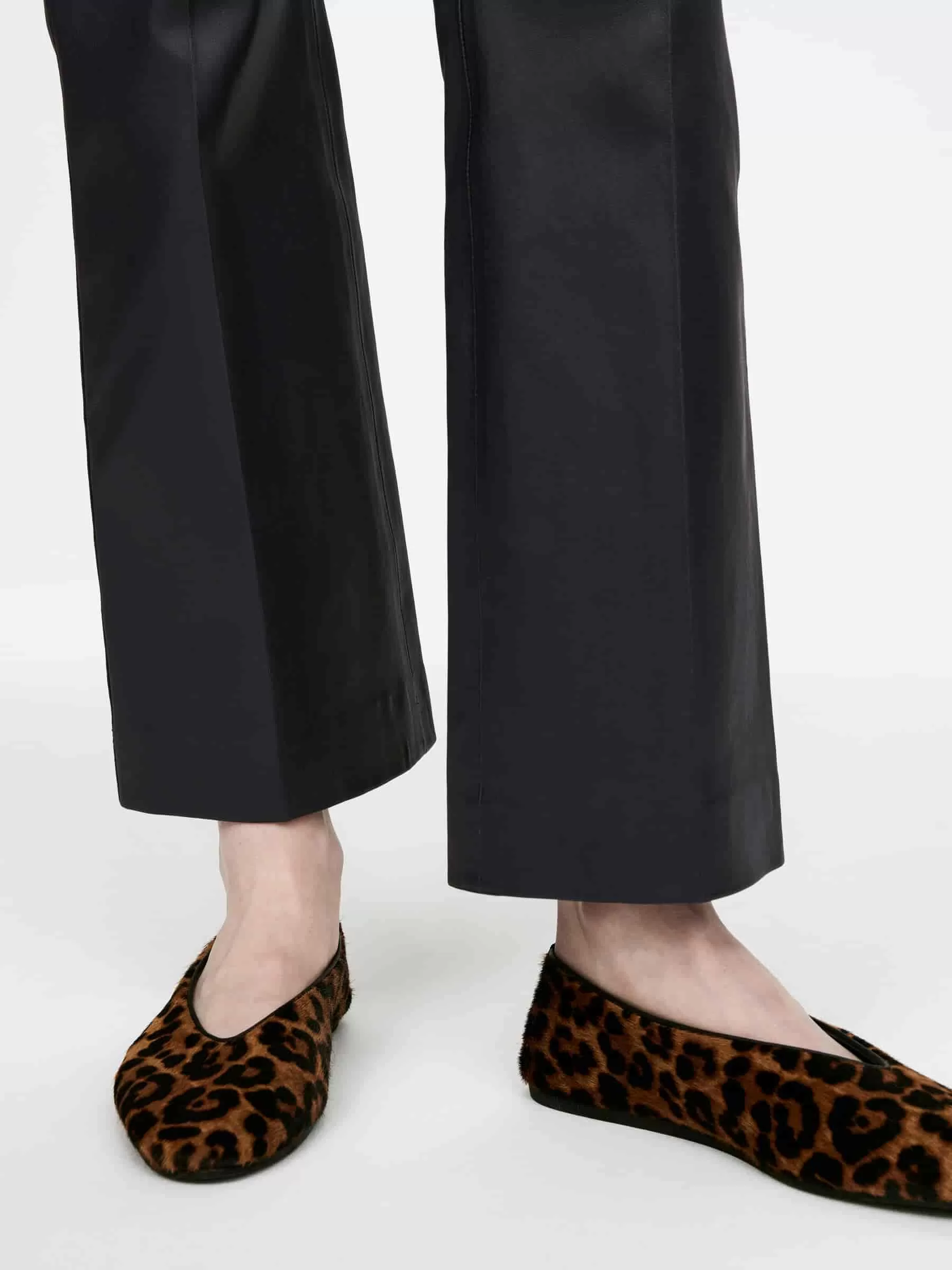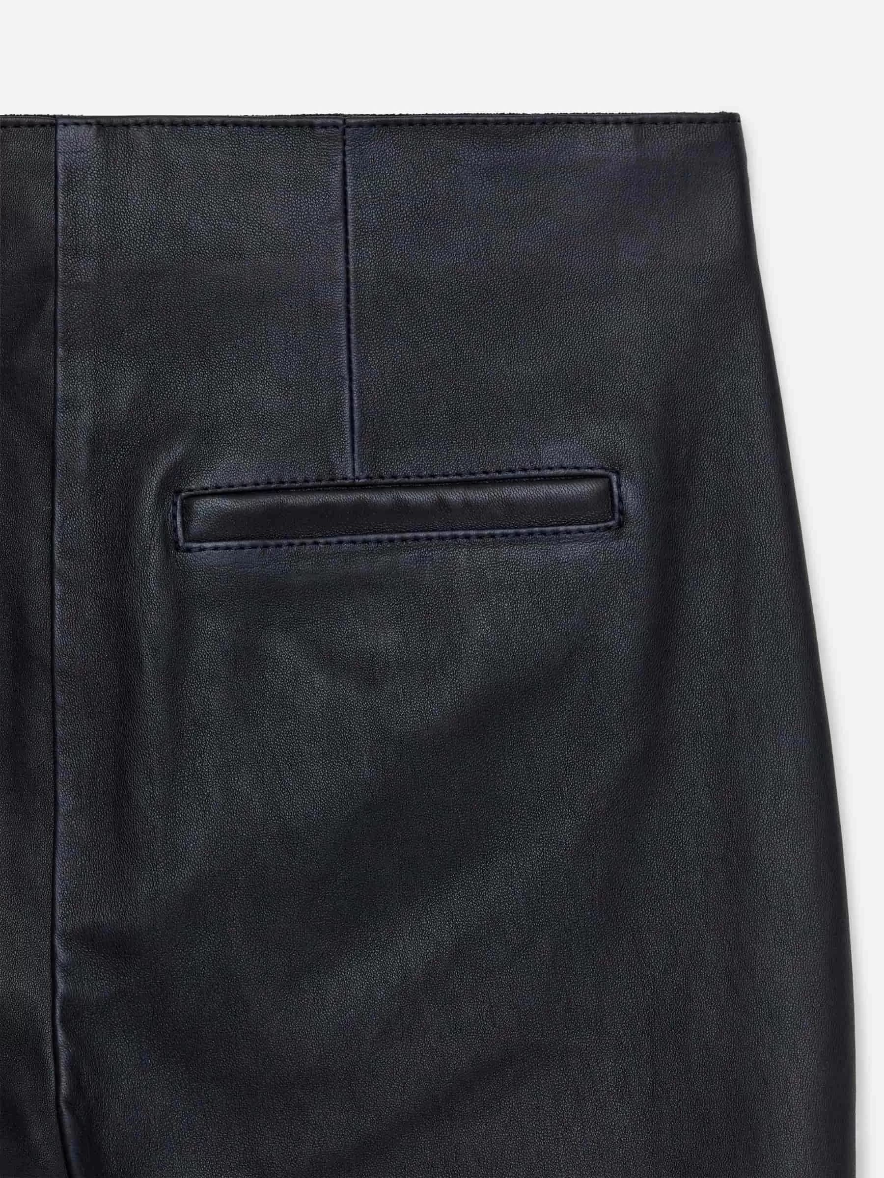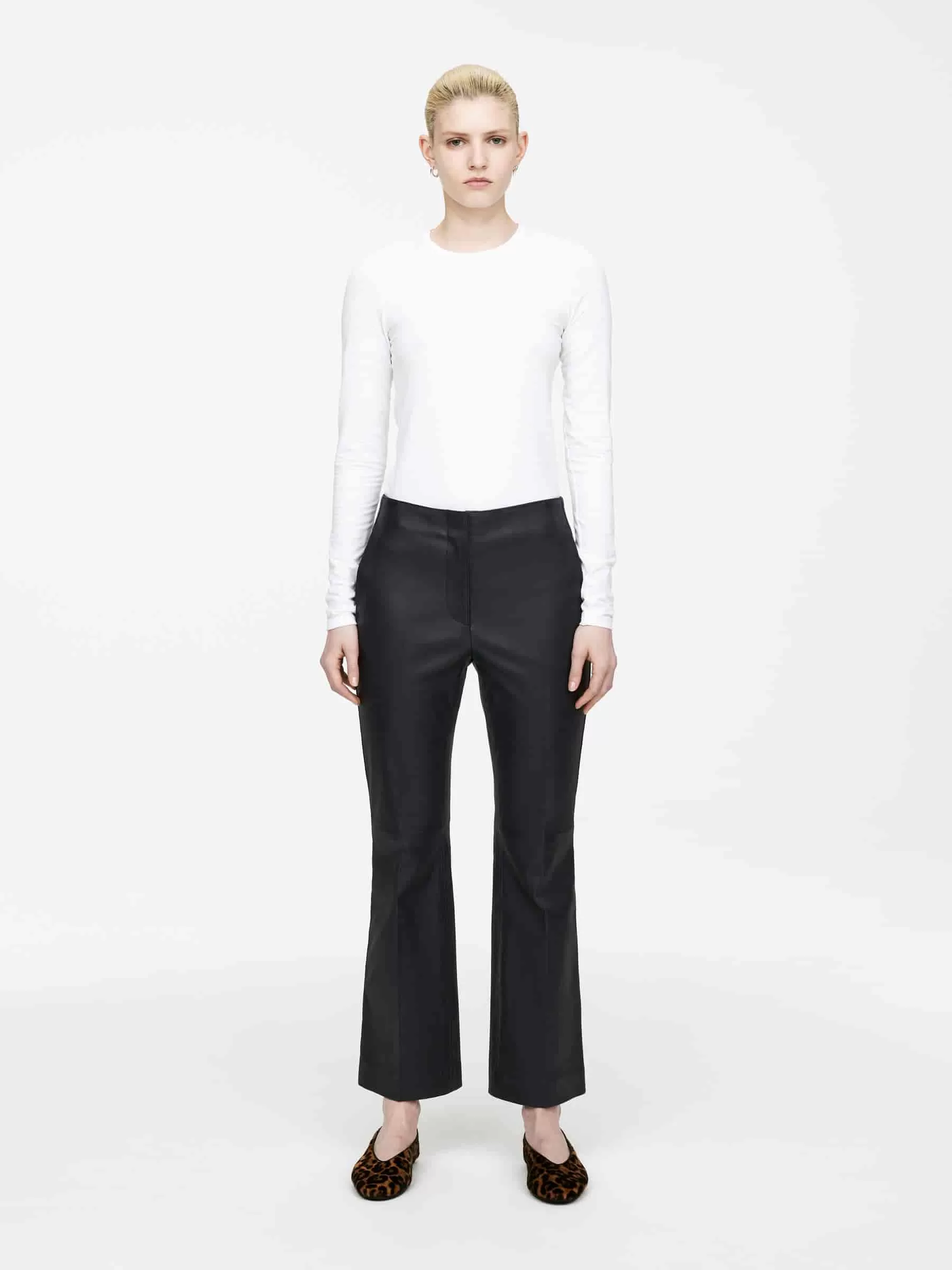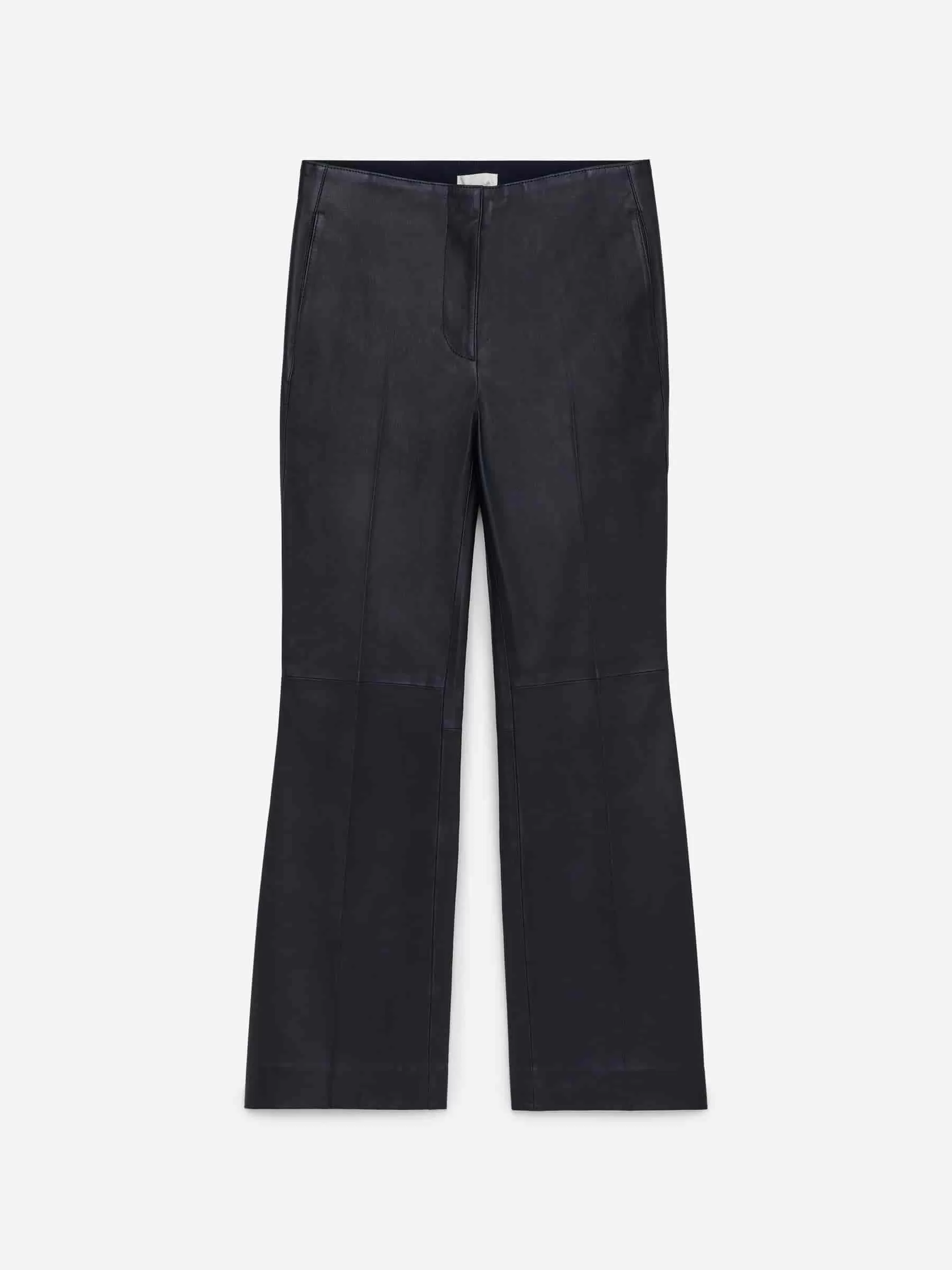 Schmal geschnittene Hose aus chromfreiem Leder mit zusätzlichem Stretchanteil für mehr Komfort. Ein Kick-Flare-Stil mit Bügelfalten vorne und hinten. Ausgeschnittenes und genähtes Detail über dem Knie. Schräge Seitentaschen und Leistentaschen hinten.