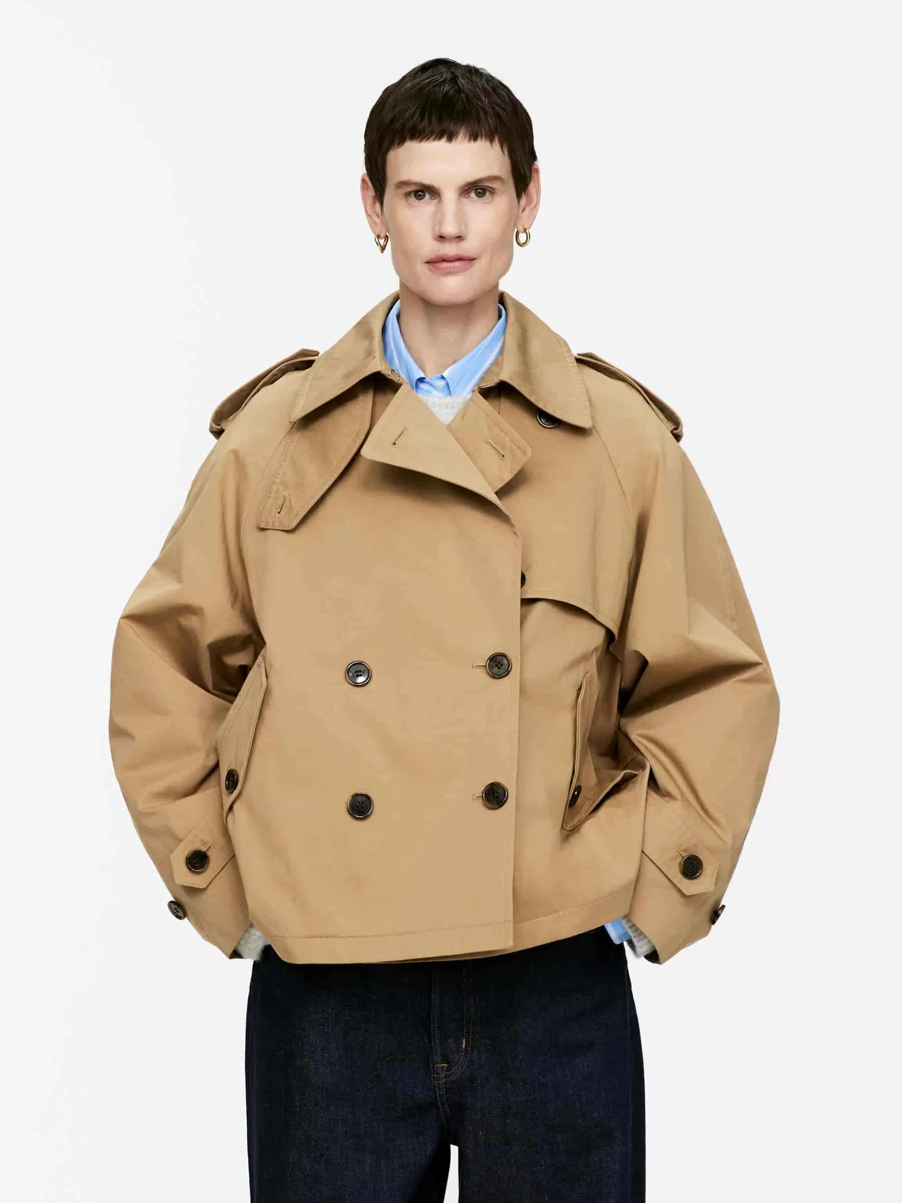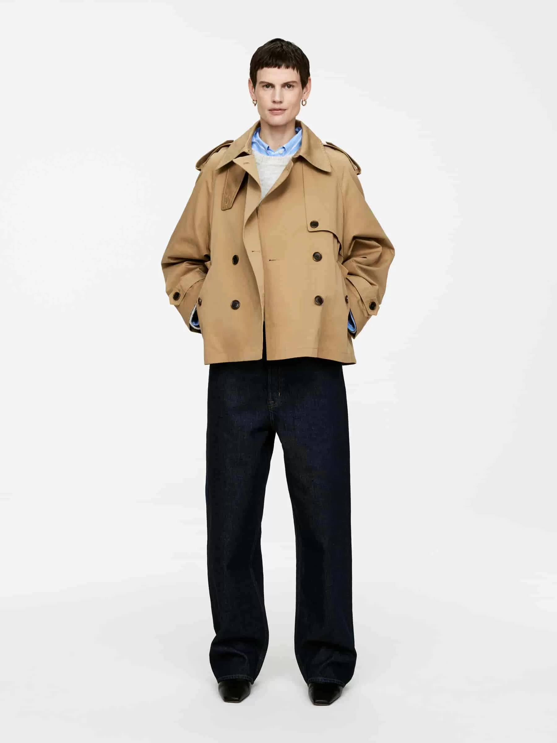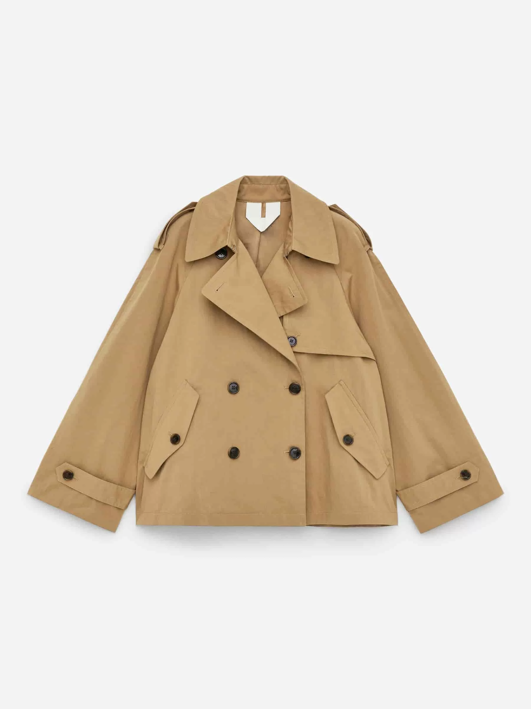 Kurze Trenchjacke. Ein zweireihiges Modell mit Knopfverschluss und schrägen Pattentaschen. Verfügt über klassische Trenchcoat-Details wie Schulterklappen, Ärmelriemen, einen Regenschutz und eine Pistolenklappe.
