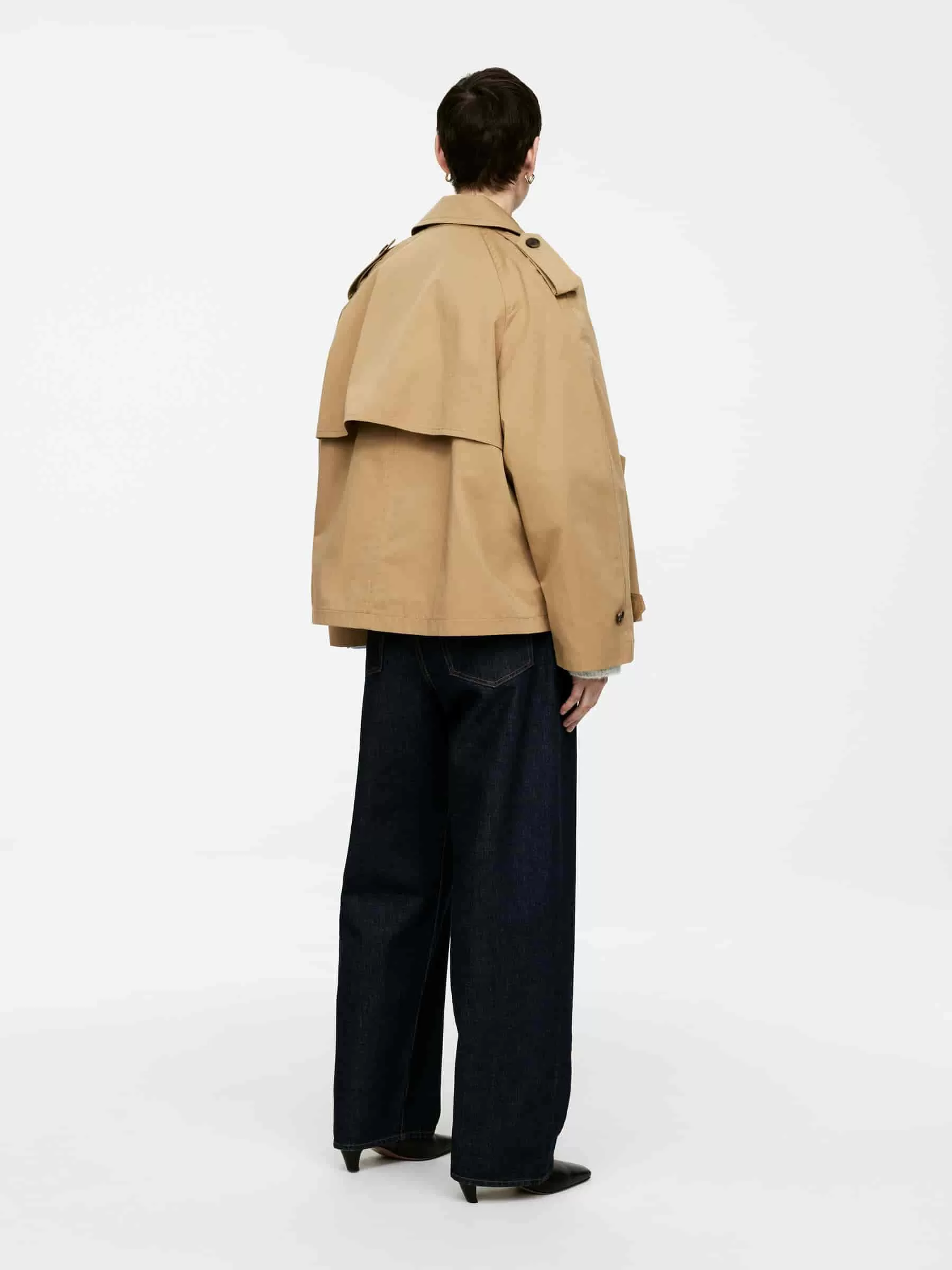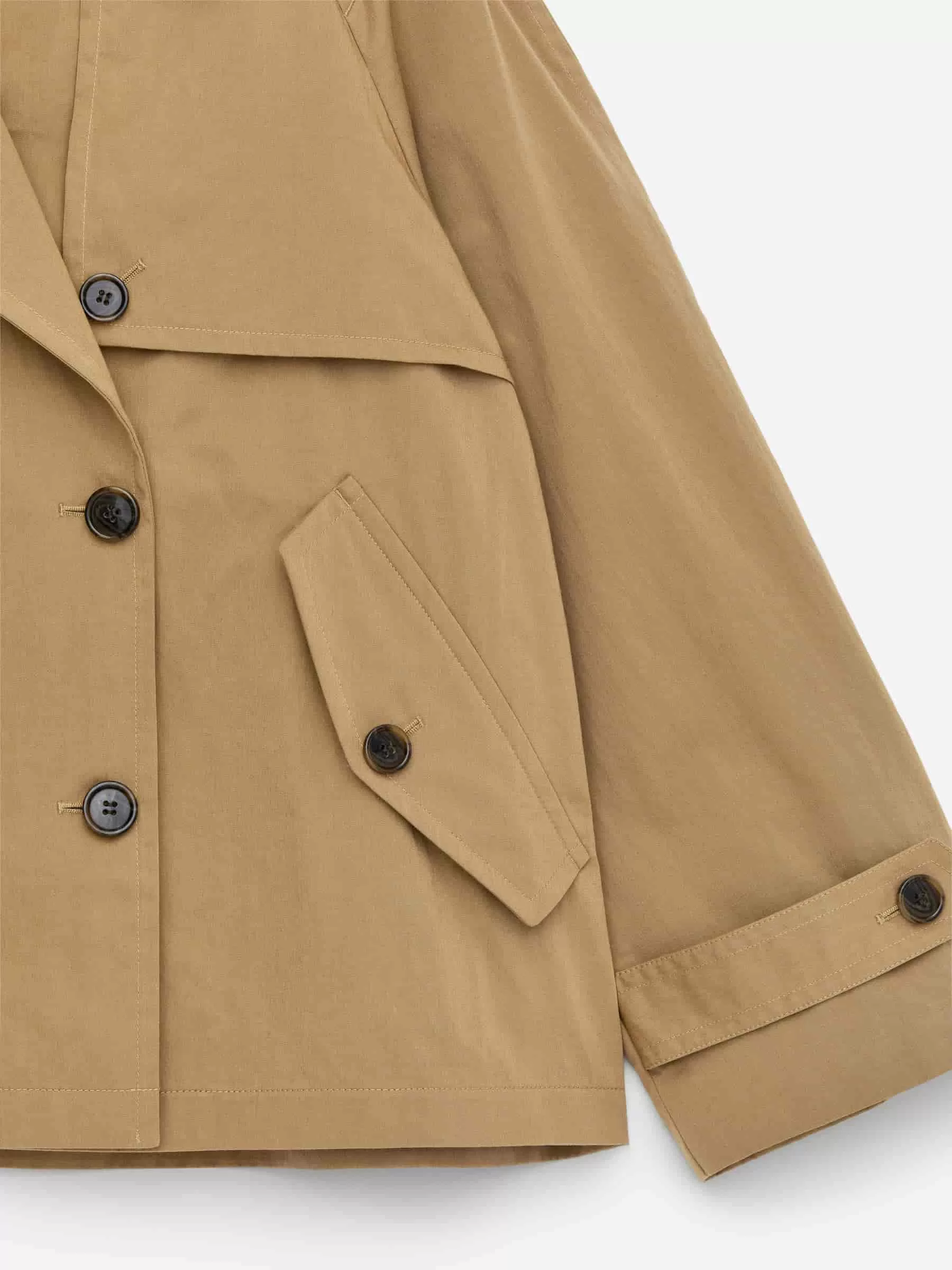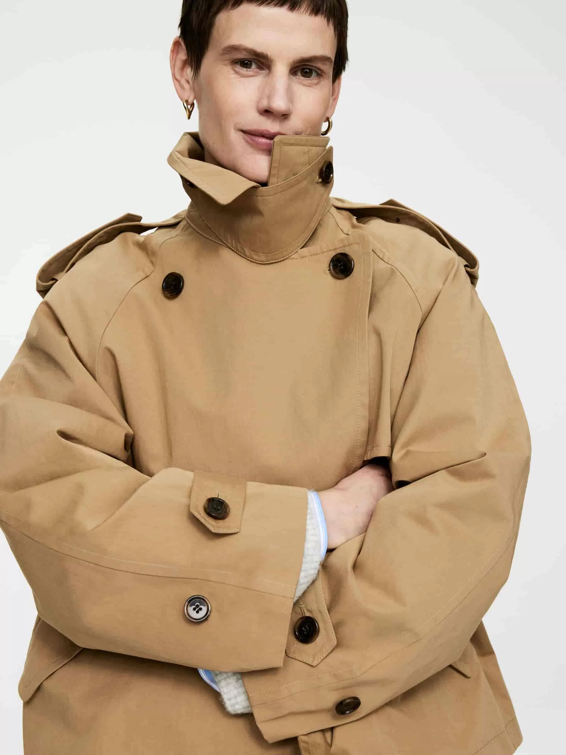 Kurze Trenchjacke. Ein zweireihiges Modell mit Knopfverschluss und schrägen Pattentaschen. Verfügt über klassische Trenchcoat-Details wie Schulterklappen, Ärmelriemen, einen Regenschutz und eine Pistolenklappe.