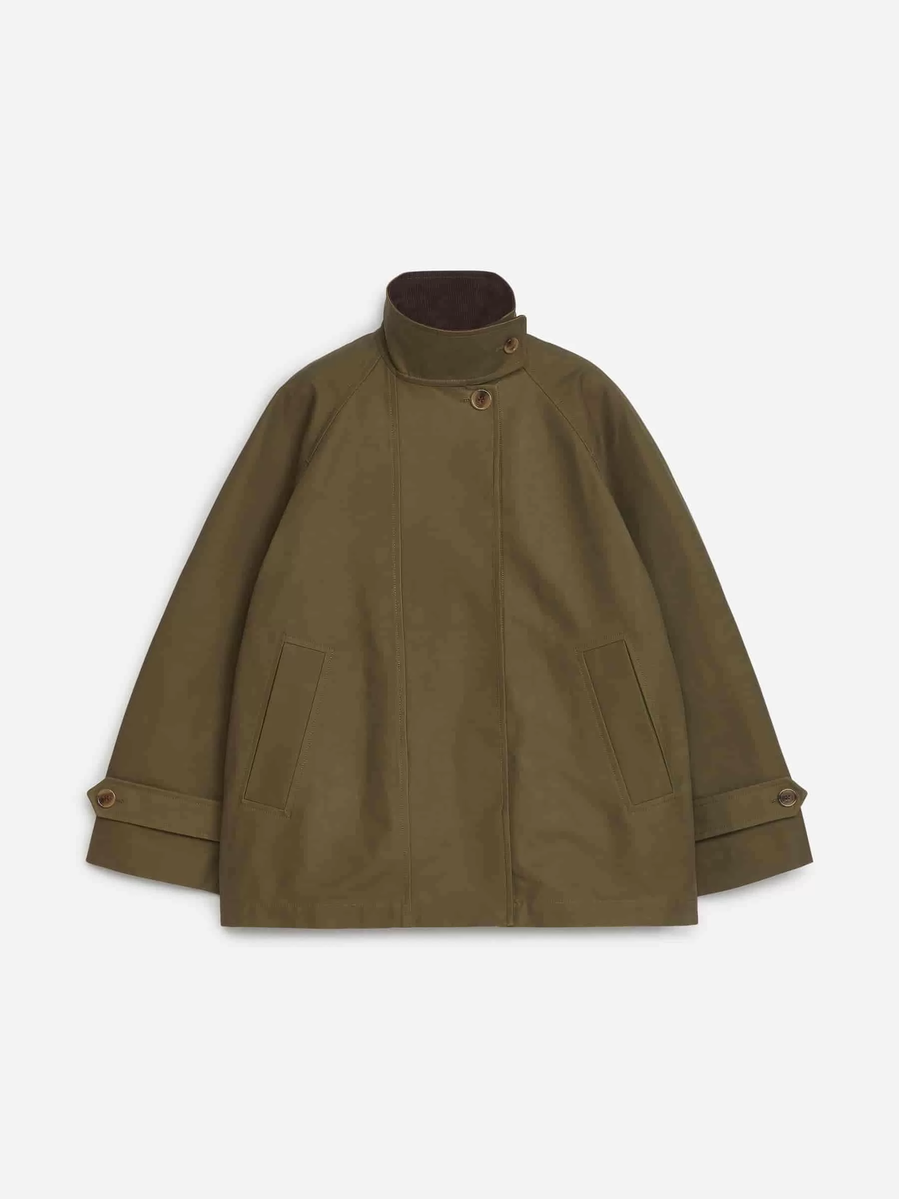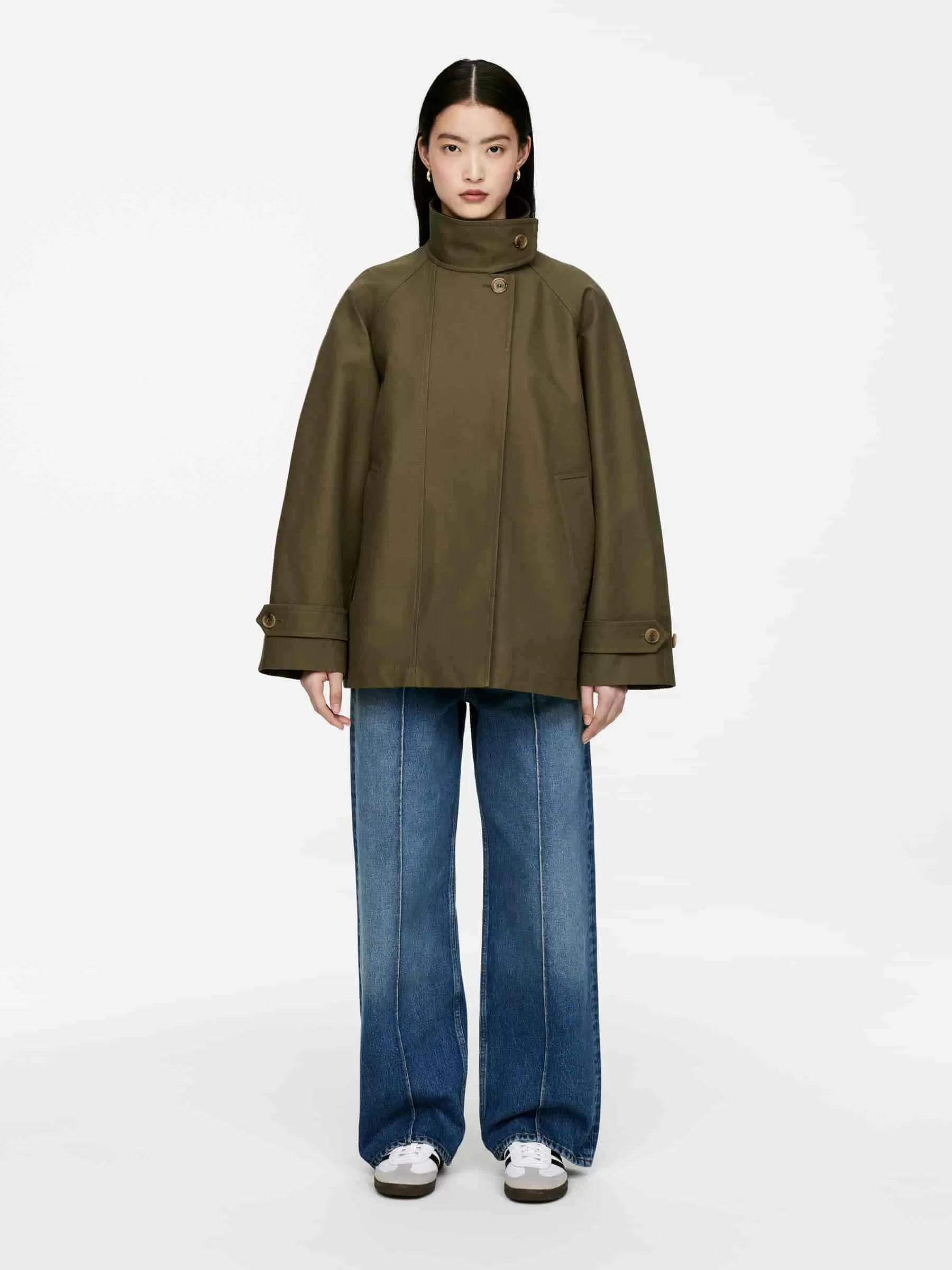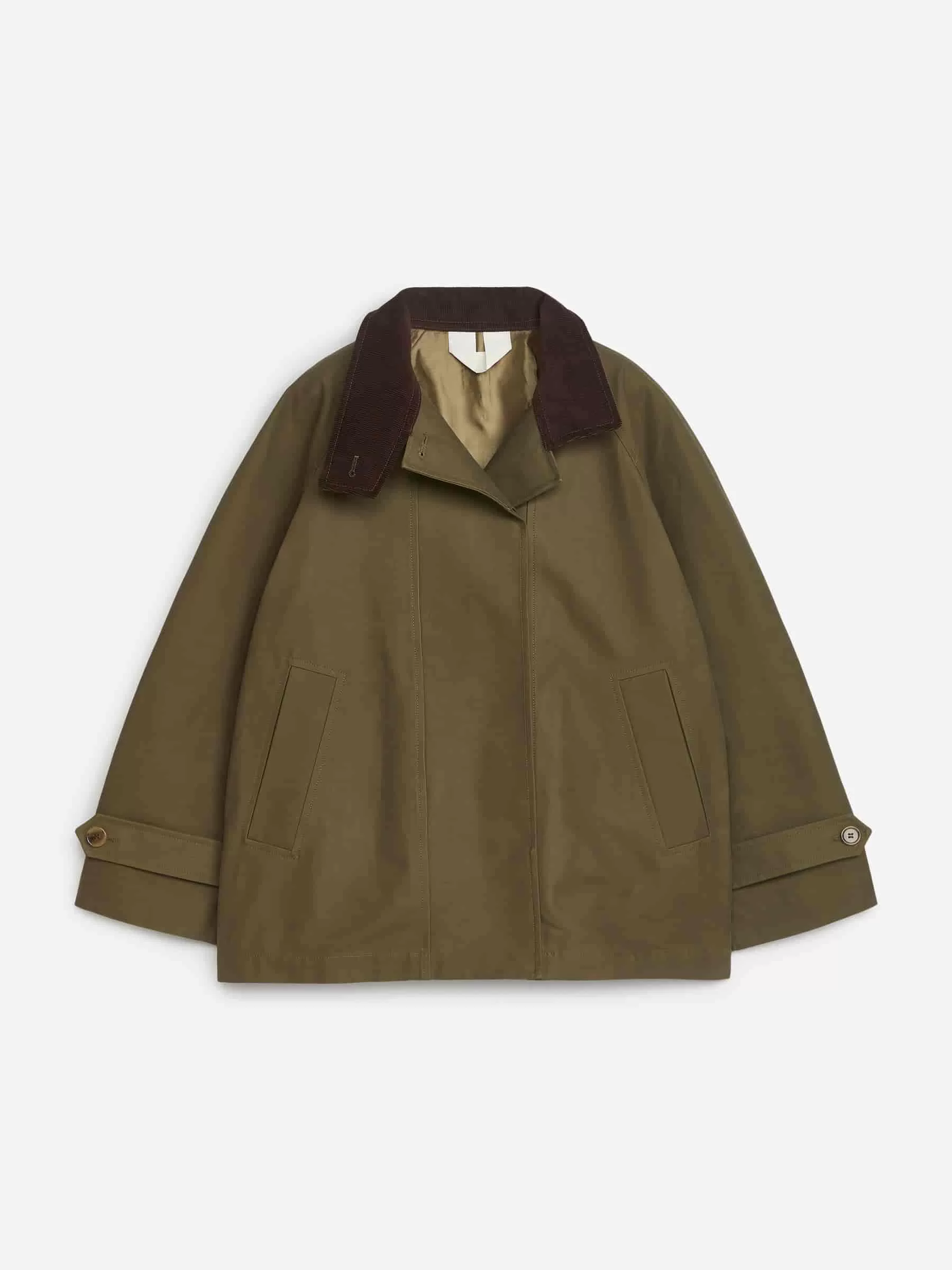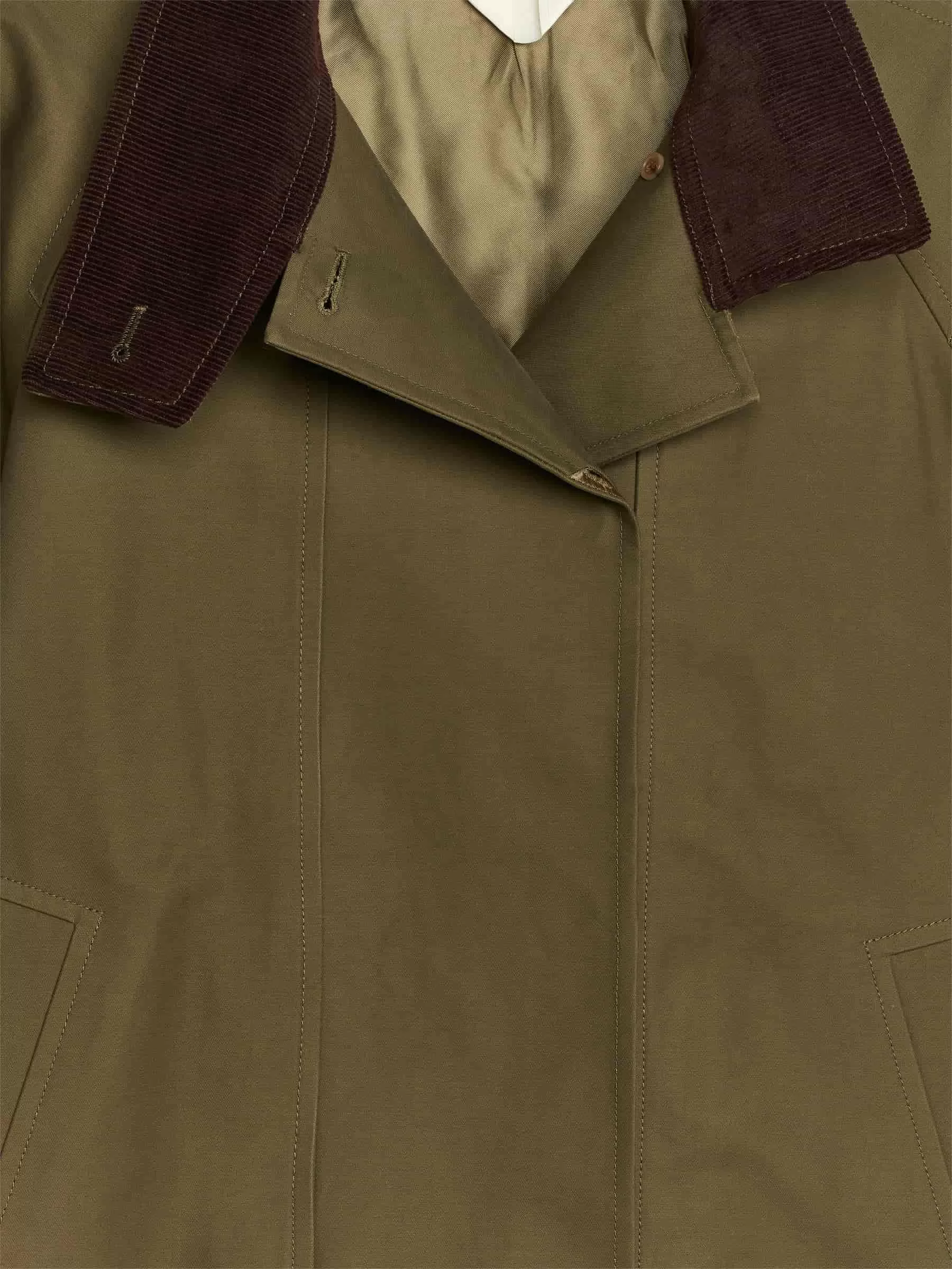 Kurzer Trenchcoat aus Baumwolle mit Cordkragen und Knopfverschluss. Ein einreihiger, gefütterter Stil mit Raglanärmeln und verdecktem Knopfverschluss. Ärmel mit Riegel- und Knopfdetails.