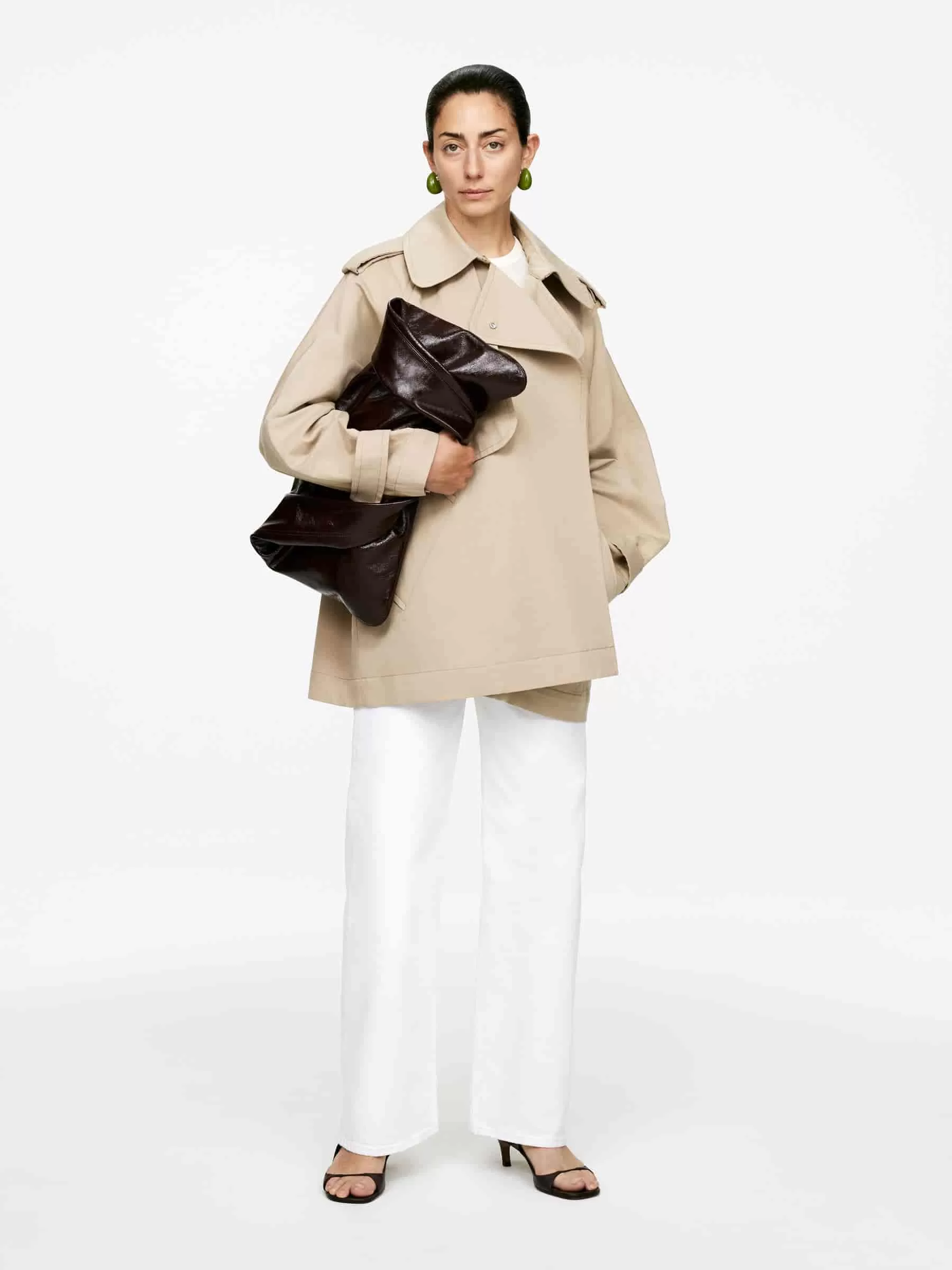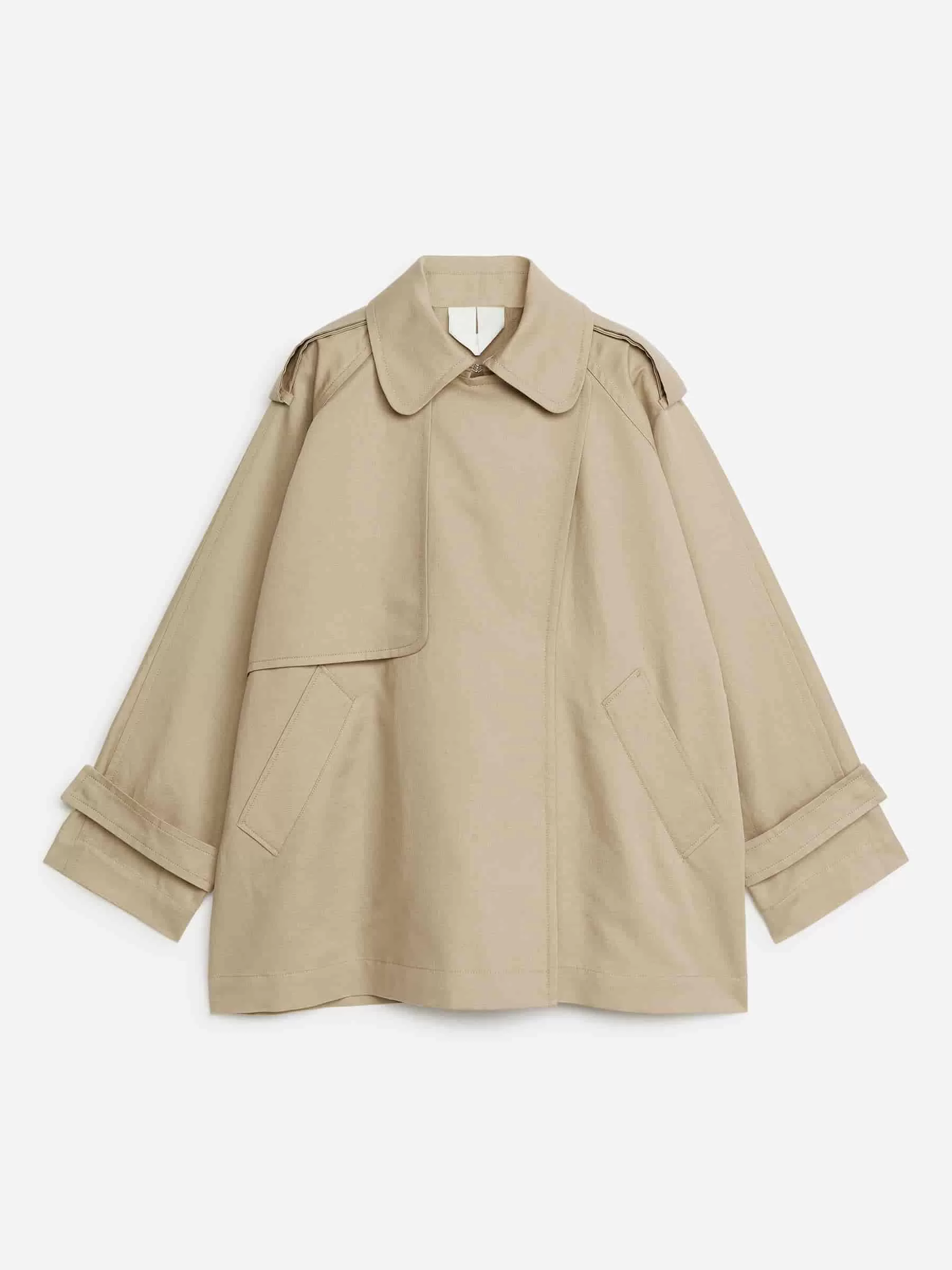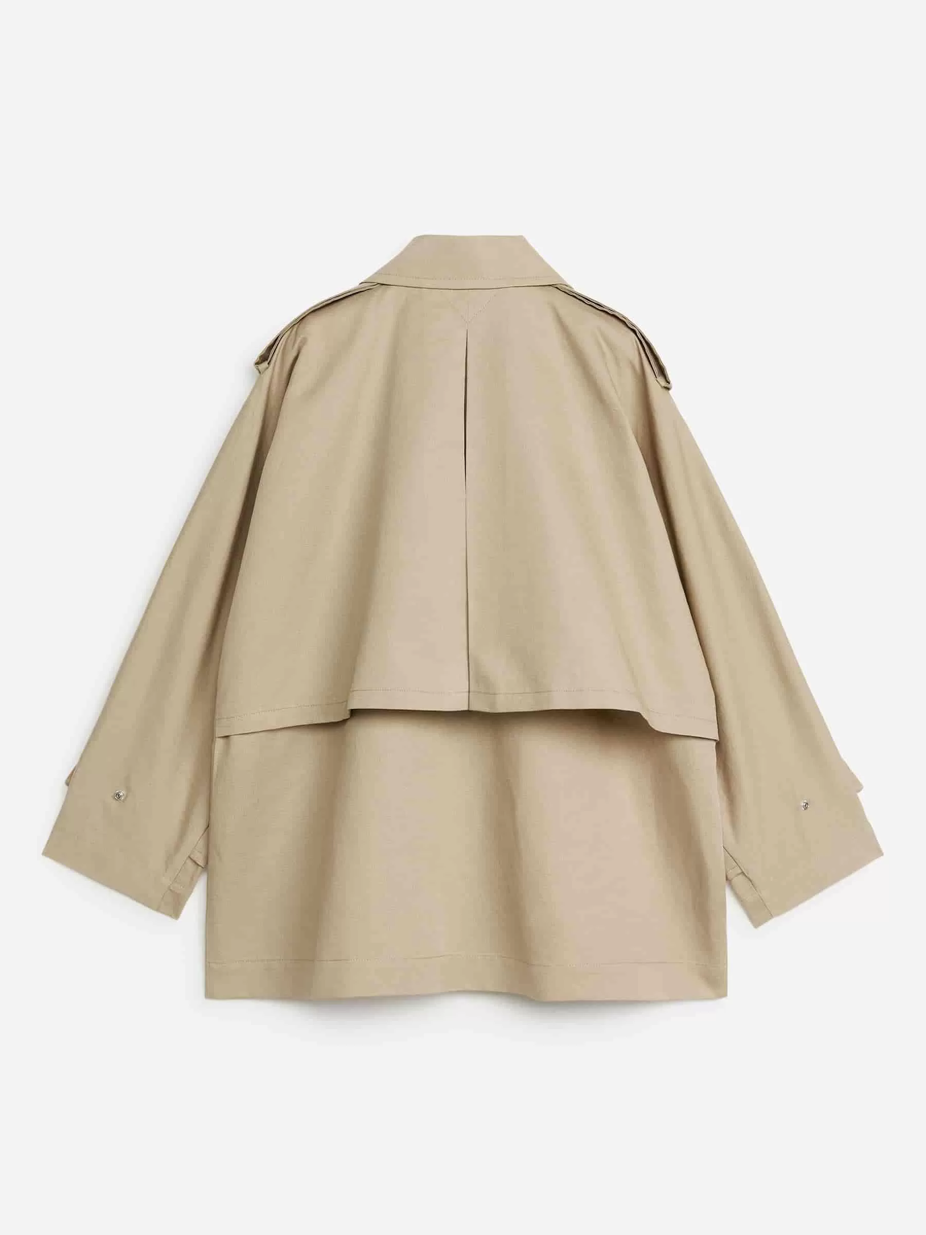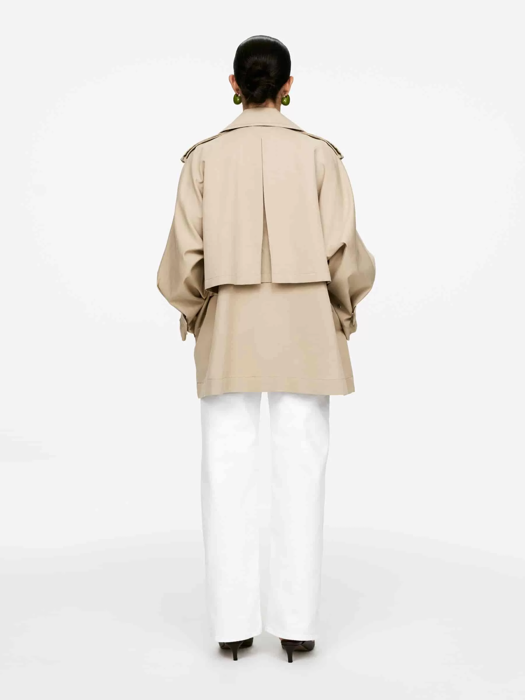 Diese kurze Version ist eine neue Interpretation des legendären Trenchcoats und besteht aus einer Twill-Mischung aus Leinen und Baumwolle. Der Mantel bietet eine voluminöse Silhouette mit verdecktem Druckknopfverschluss und verfügt über klassische Details wie Schulterklappen, Ärmelriemen, einen Regenschutz und eine Pistolenklappe.