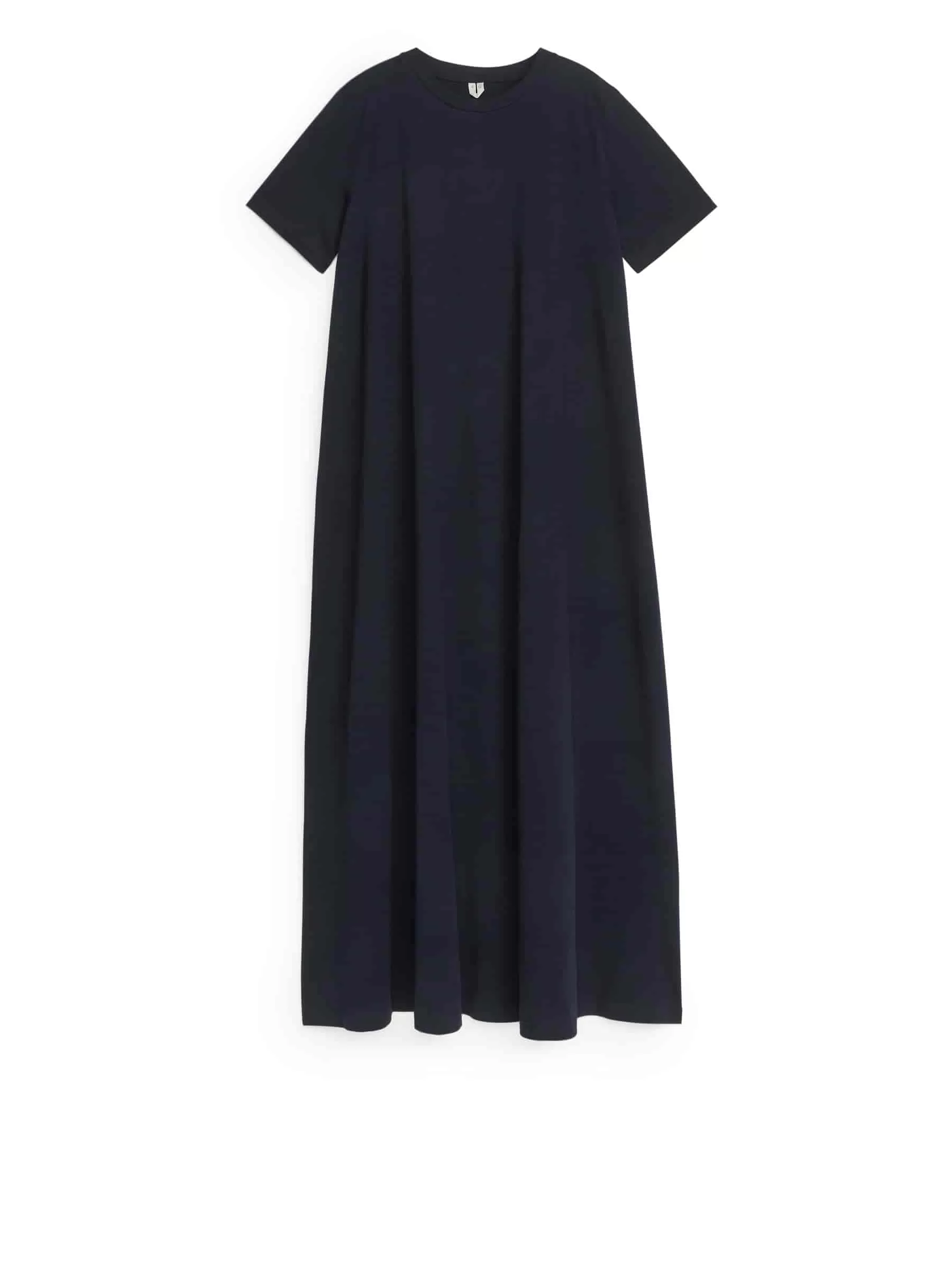 Weitläufiges T-Shirt-Kleid aus Single-Jersey-Stoff aus Baumwolle. Dies ist ein bodenlanges Kleid mit Rundhalsausschnitt und einer Schnittnaht in der Mitte des Rückens.