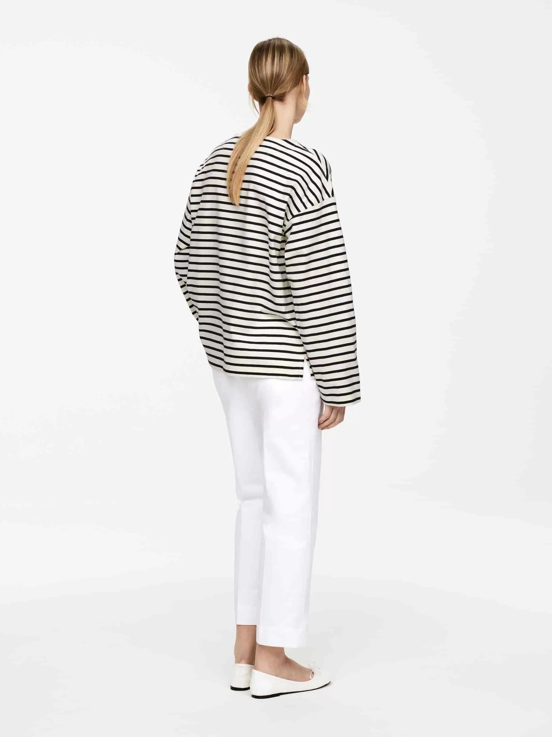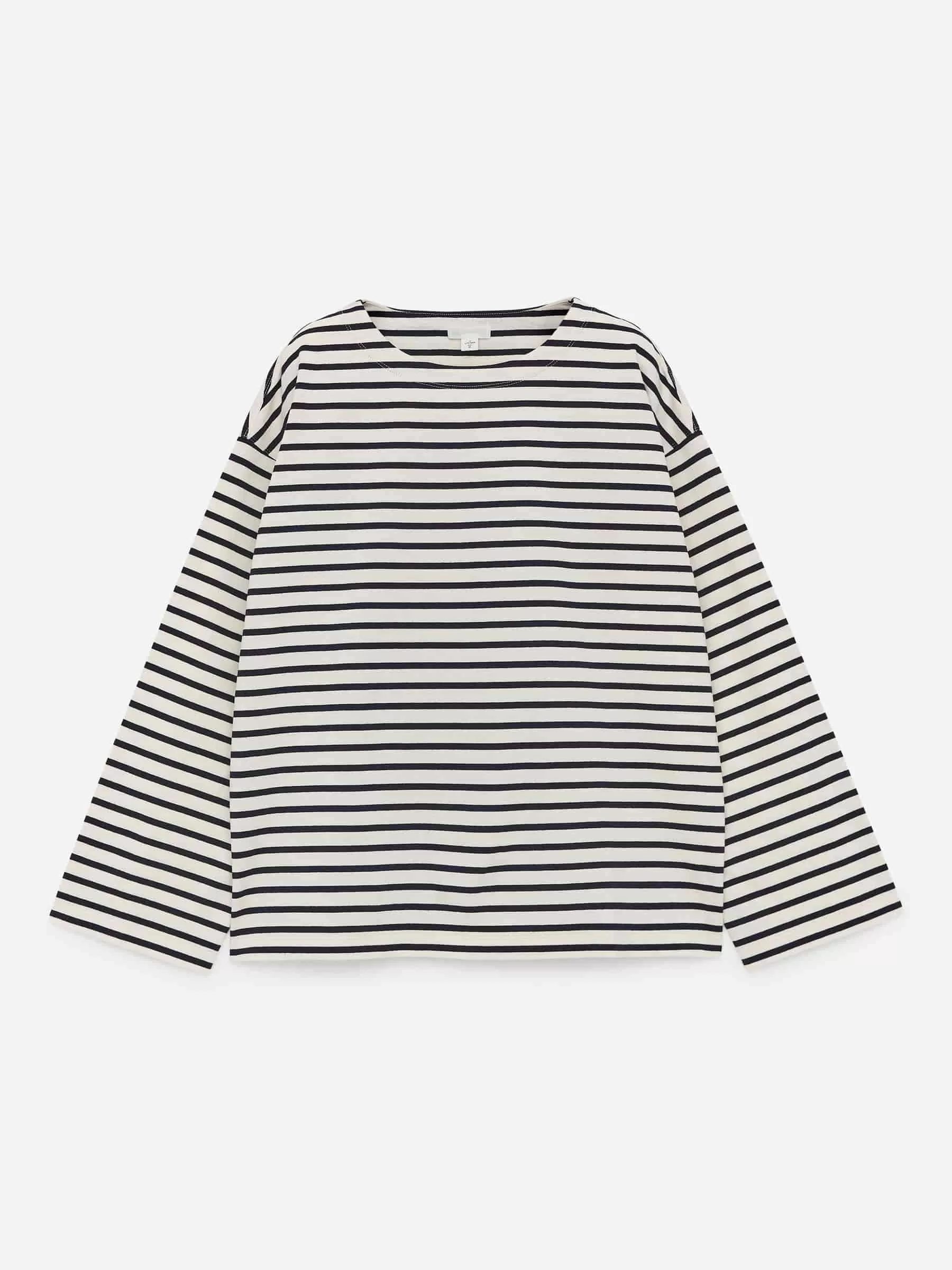 Langärmliges T-Shirt aus weichem, garngefärbtem Baumwolljersey. Entworfen mit überschnittenen Schultern und einem belüfteten unteren Saum.
