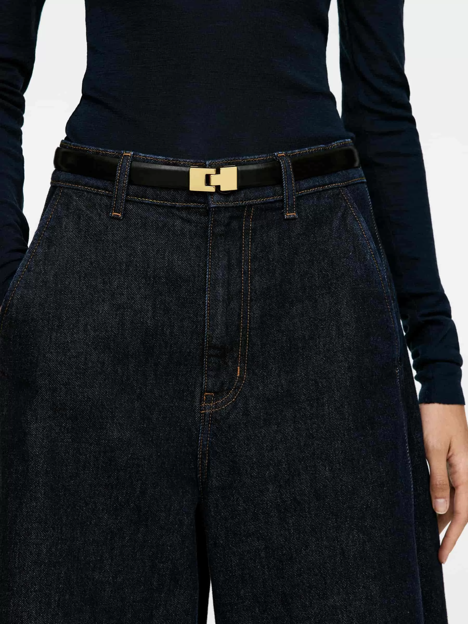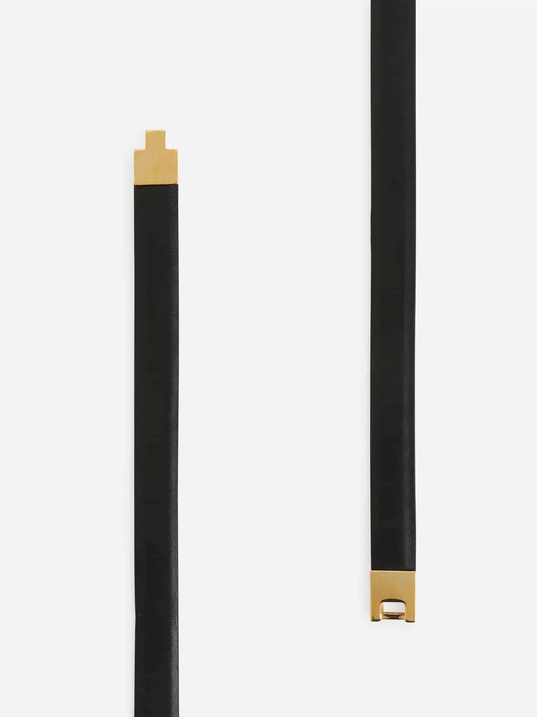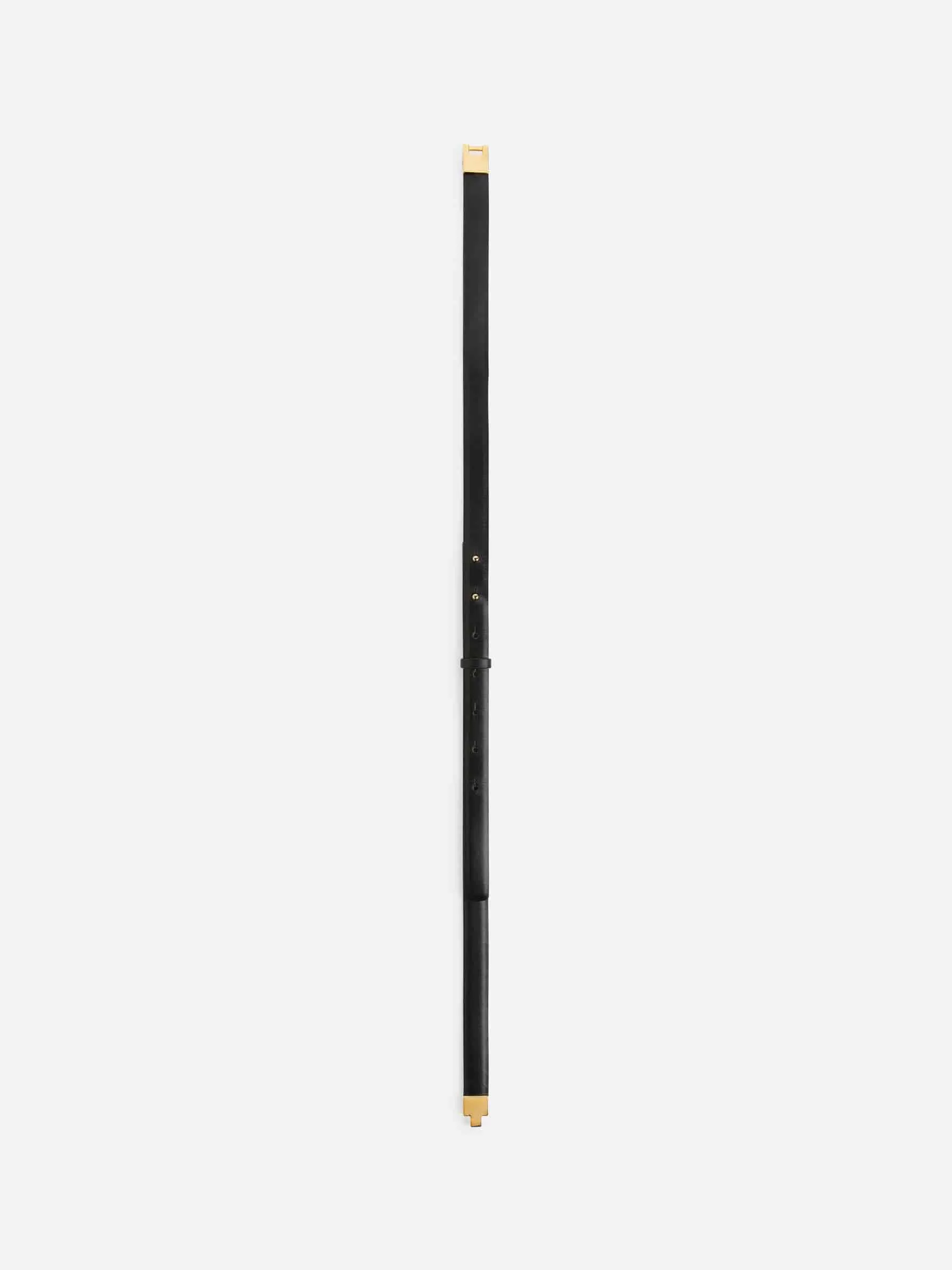 Schmaler Hüftgürtel mit dekorativer vergoldeter quadratischer Schnalle vorne. Verstellbarer Druckknopfverschluss hinten. XS/S 105,5 cm, M/L 116,5 cm.
