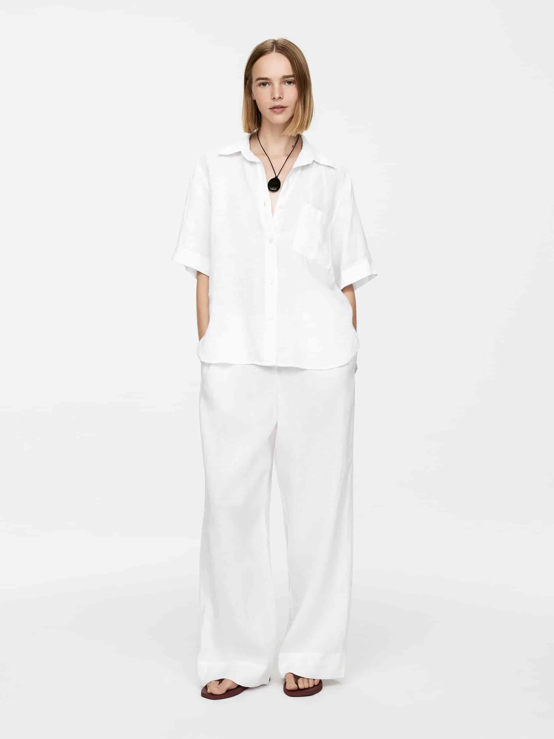 Entspanntes Leinenhemd aus reinem Leinen. Ein Kurzarmmodell mit Resort-Kragen und einer einzelnen Brusttasche. Geschwungener Saum. Perlmuttknöpfe, was bedeutet, dass dieses Produkt nichttextile Teile tierischen Ursprungs enthält.