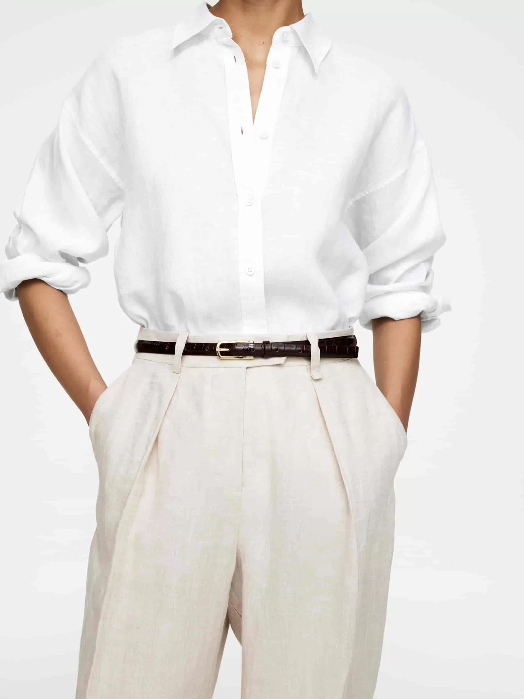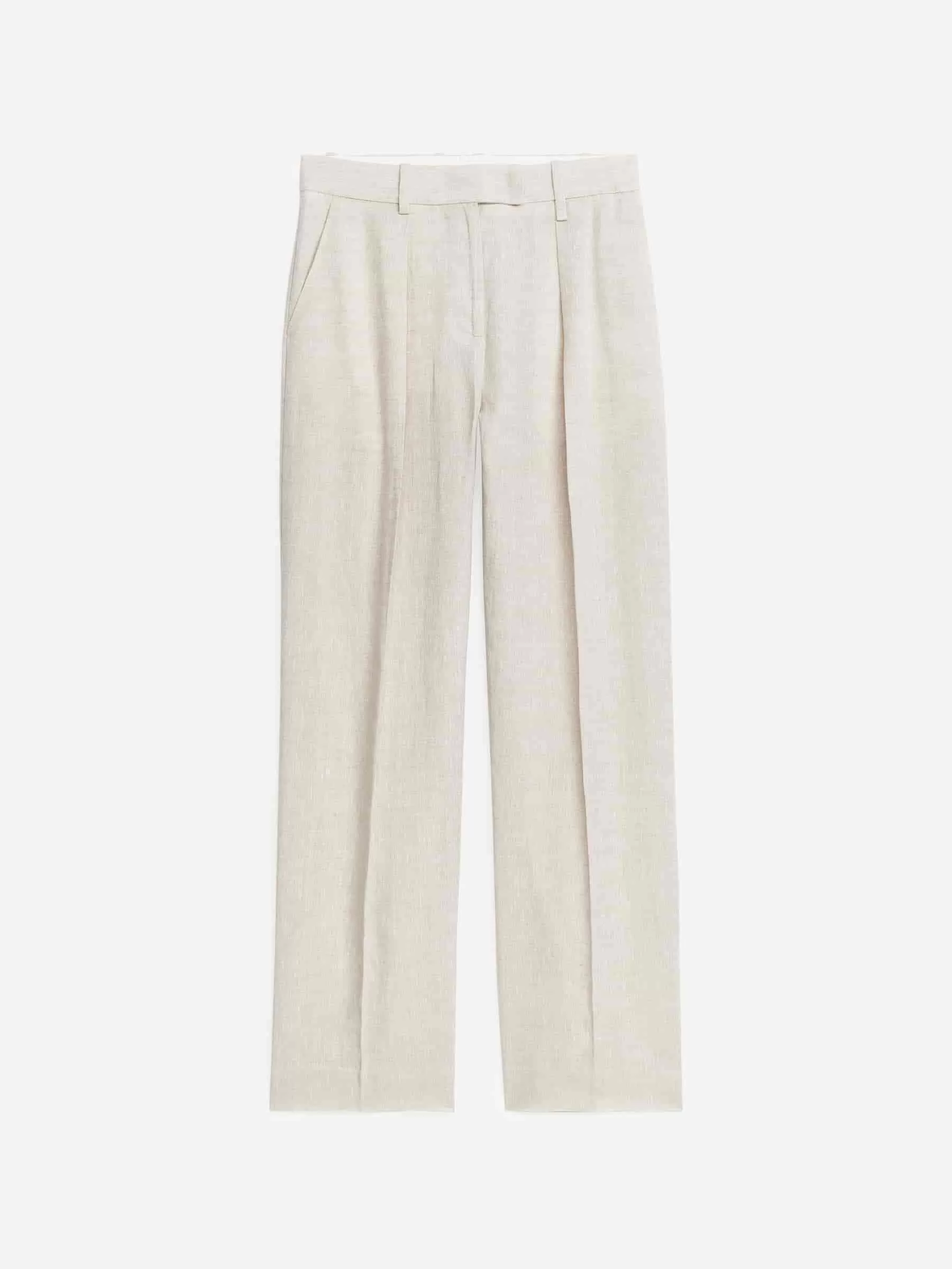 Diese lange Hose mit mittlerer Taille ist aus reinem Leinen gewebt. Eine gerade Passform mit Bügelfalten und Falten vorne, die dem Stil einen anmutigen Fall verleihen.