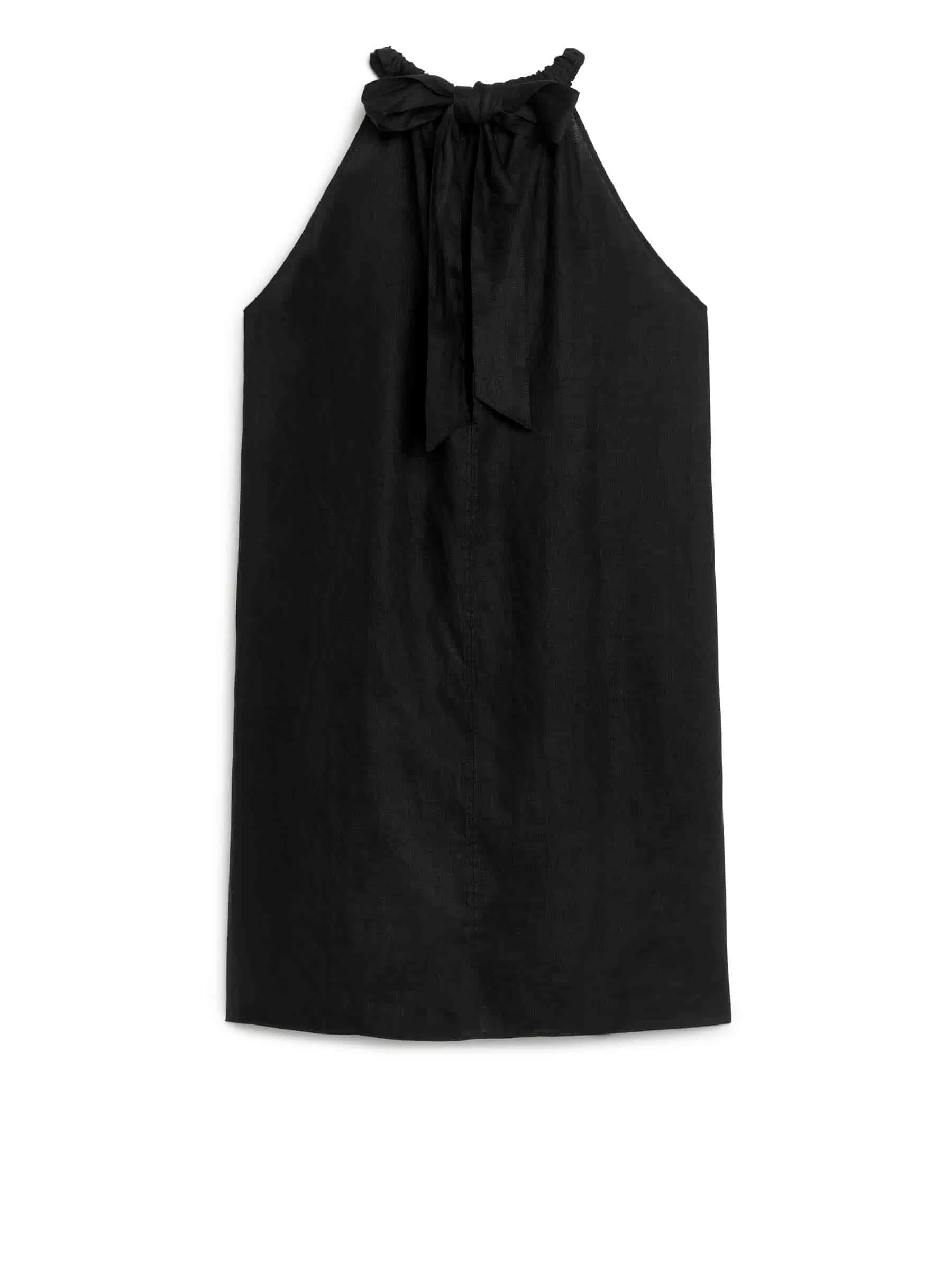 Locker sitzendes Kleid aus Leinengewebe. Mit einer Schleife zum Binden im Nacken.