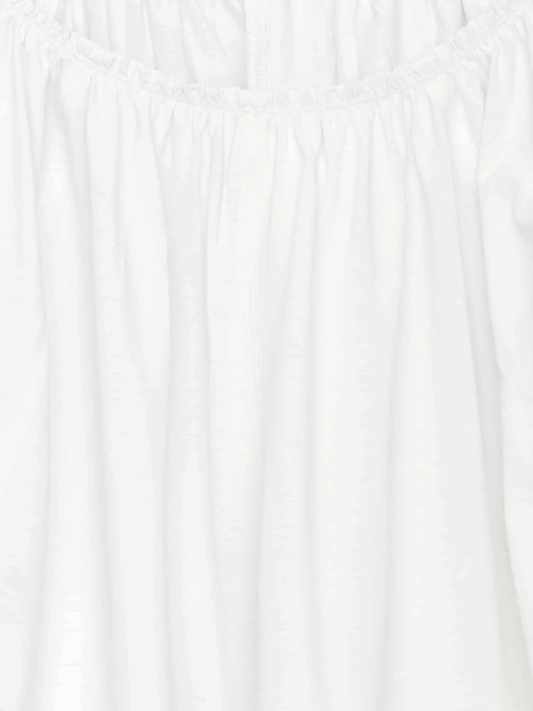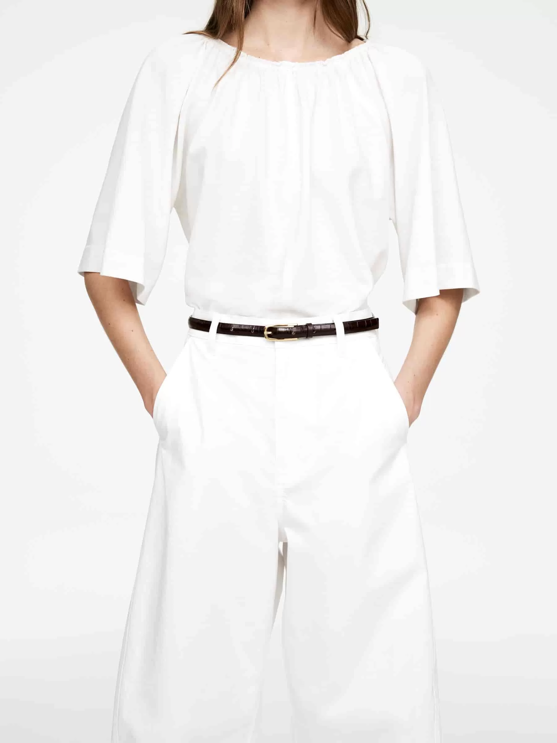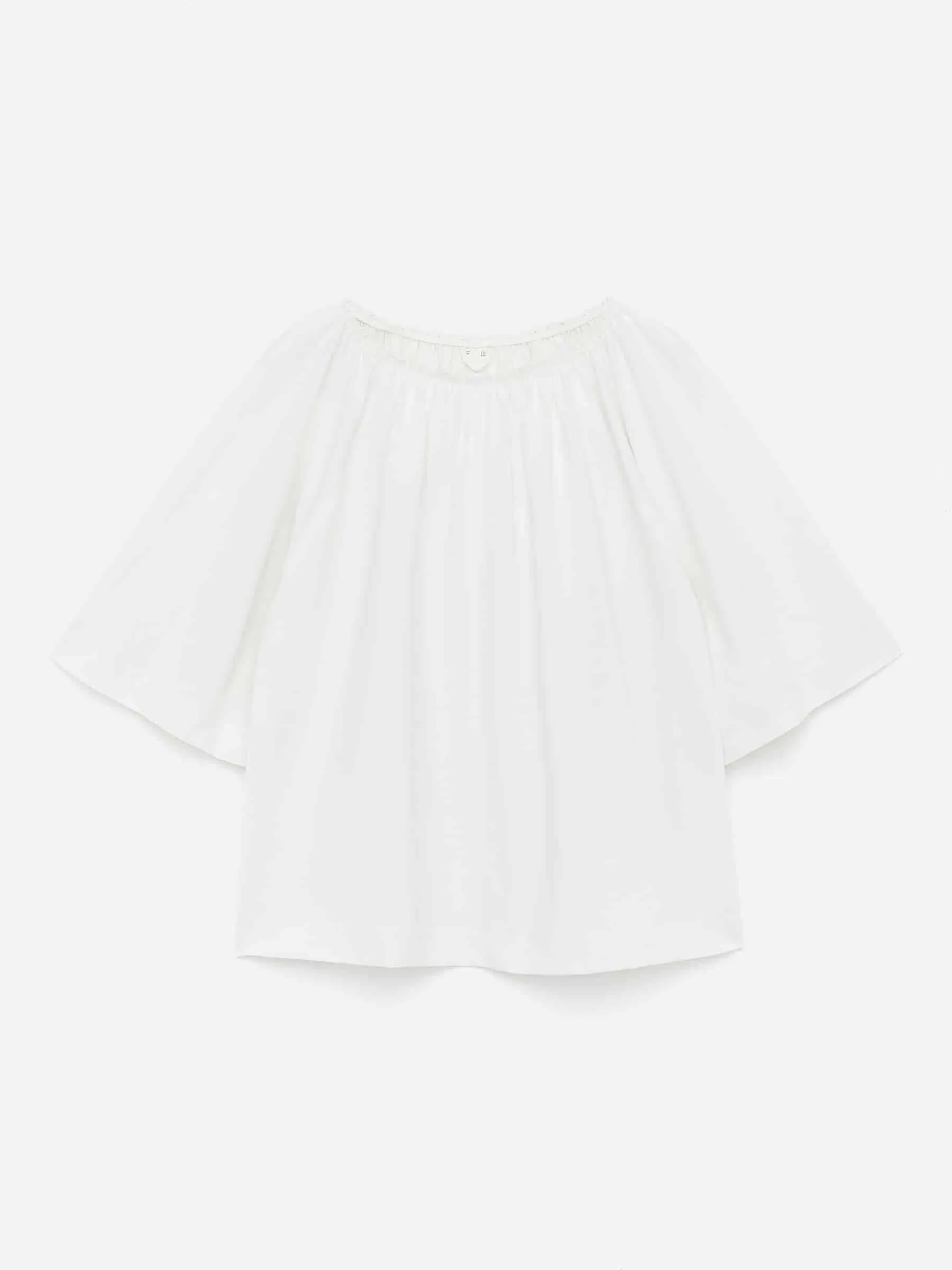 Locker sitzendes, drapiertes Oberteil aus Crêpe-Baumwolljersey. Für eine A-Linien-Silhouette geschnitten, mit offenem Ausschnitt und festen Raffungen. Die weiten Raglanärmel sind auf Ellenbogenlänge verkürzt.