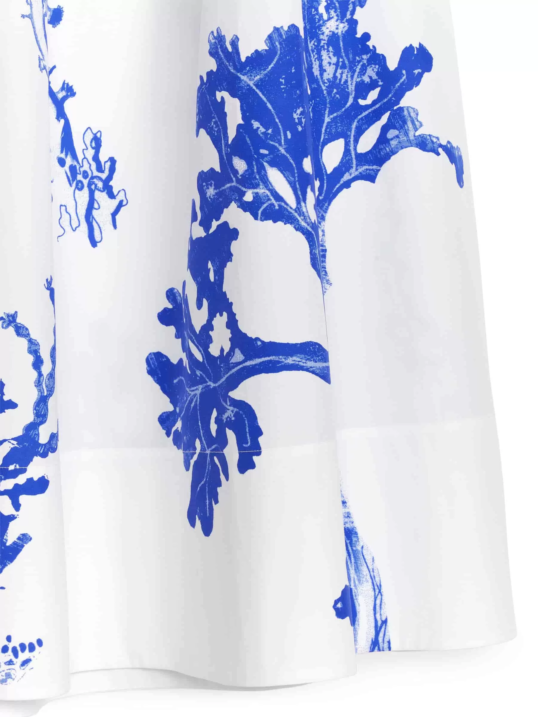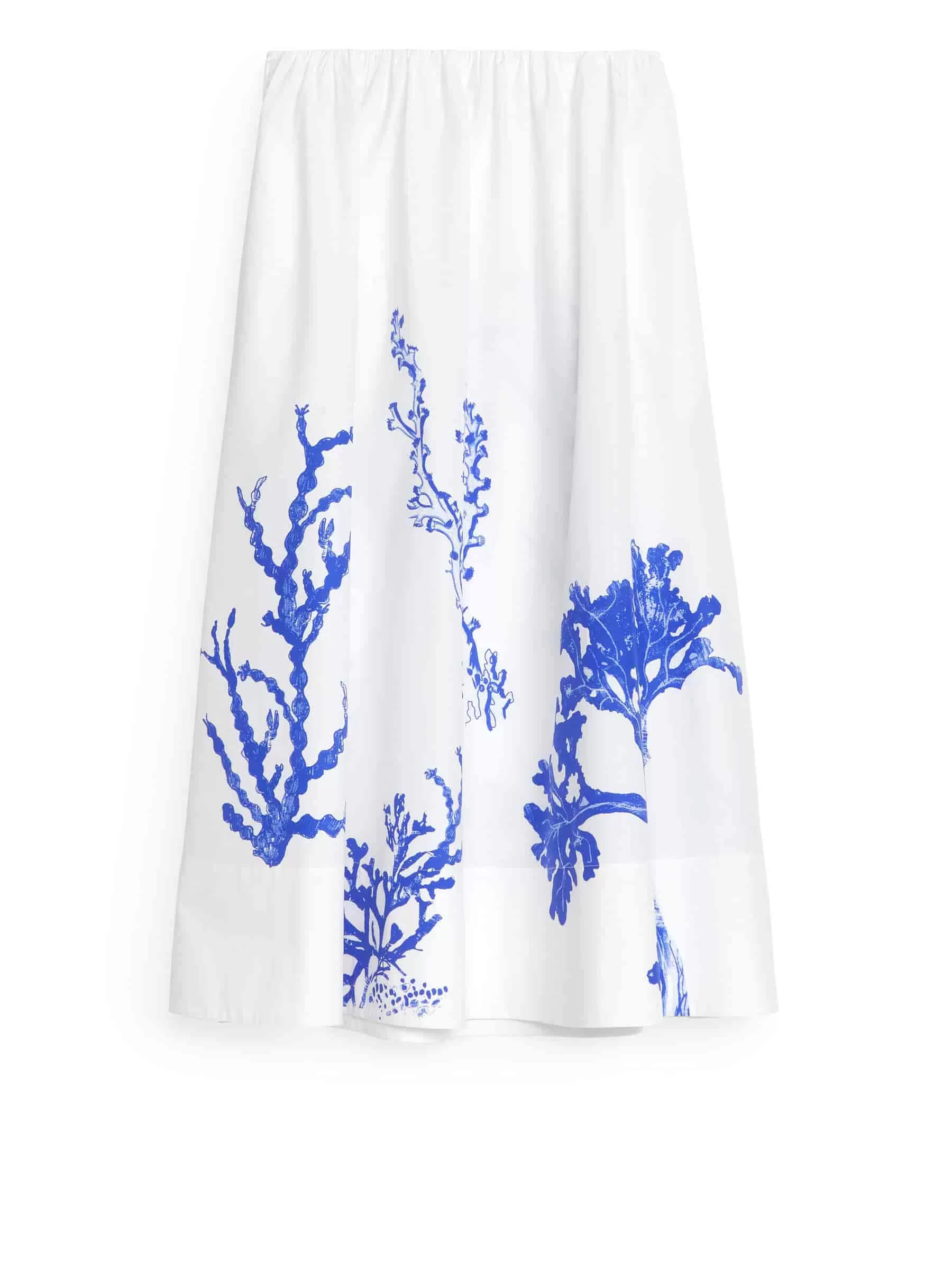 Midirock in A-Linie aus Baumwolle. Versteckte Gummizüge in der Taille und versteckte Seitentaschen. Schlitze an den Seiten. Ungefüttert.