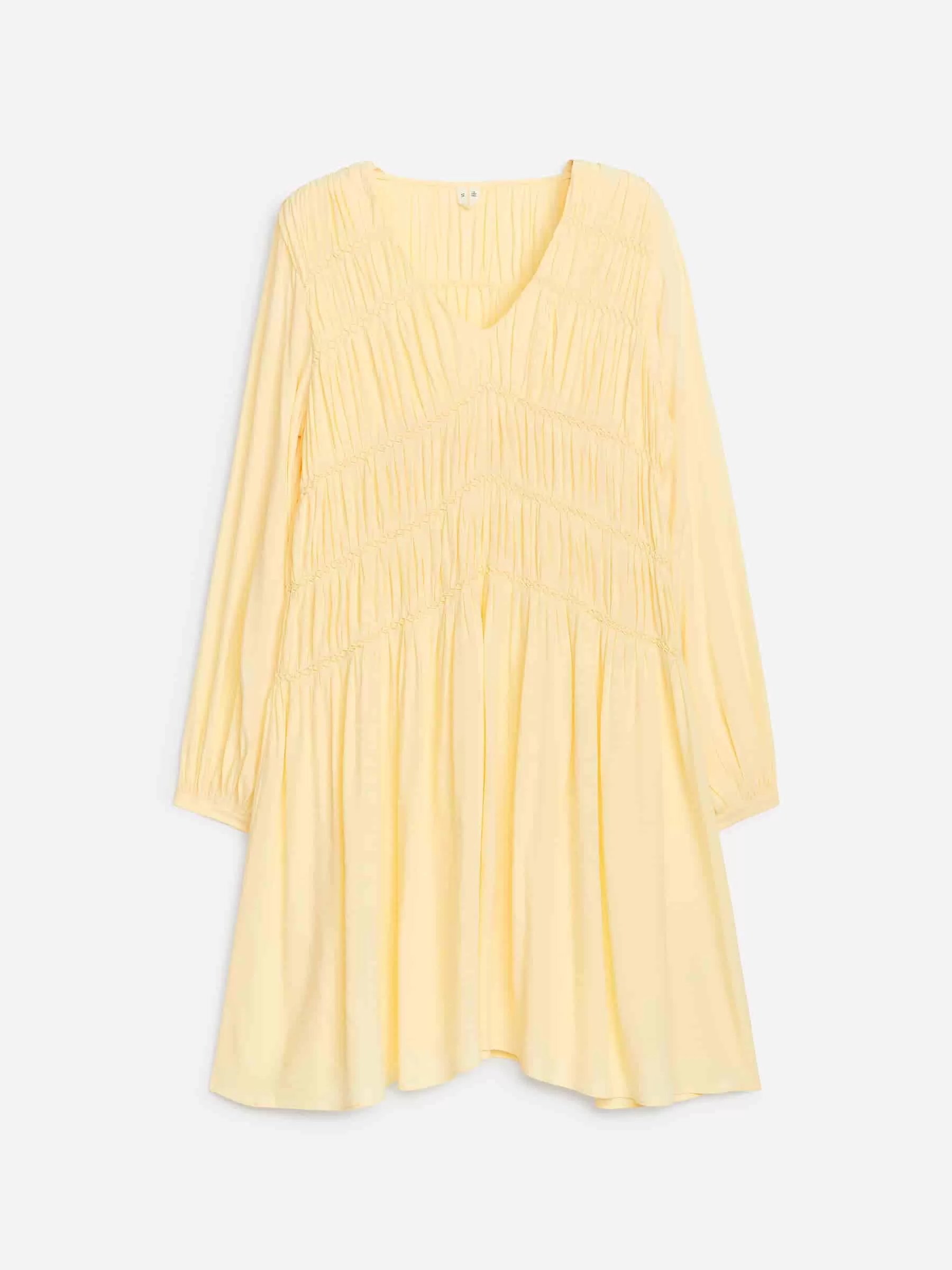 Midikleid aus fließendem Viskosestoff. Mit V-Ausschnitt, ballonförmigen Ärmeln und gesmokten Details mit elastischen Nähten am Körper. Den Saum an der Unterkante feststecken.