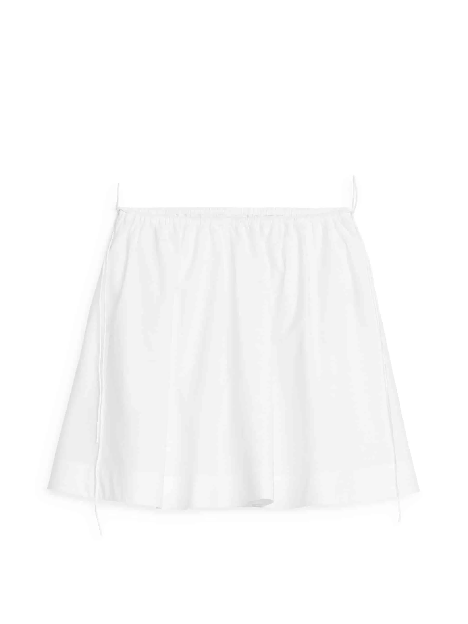 Kurzer Rock in A-Linie mit seitlichen Nahttaschen. Mit weichem Gummizug in der Taille und festen Rouleau-Trägern an den Seiten. Komplett gefüttert.