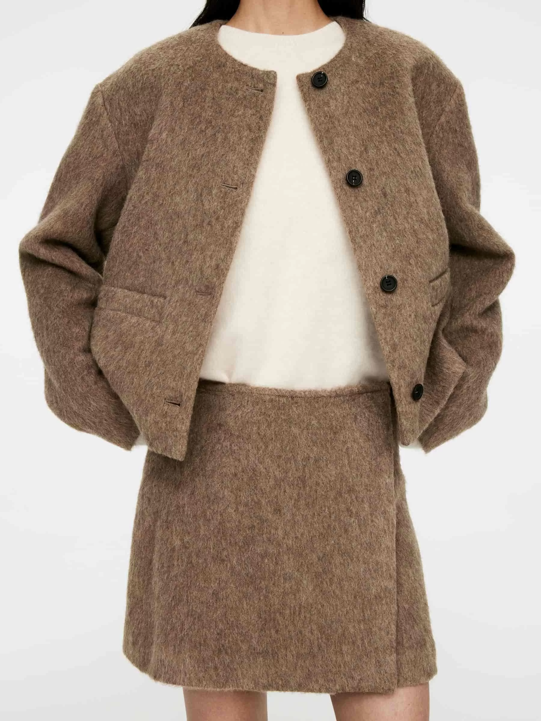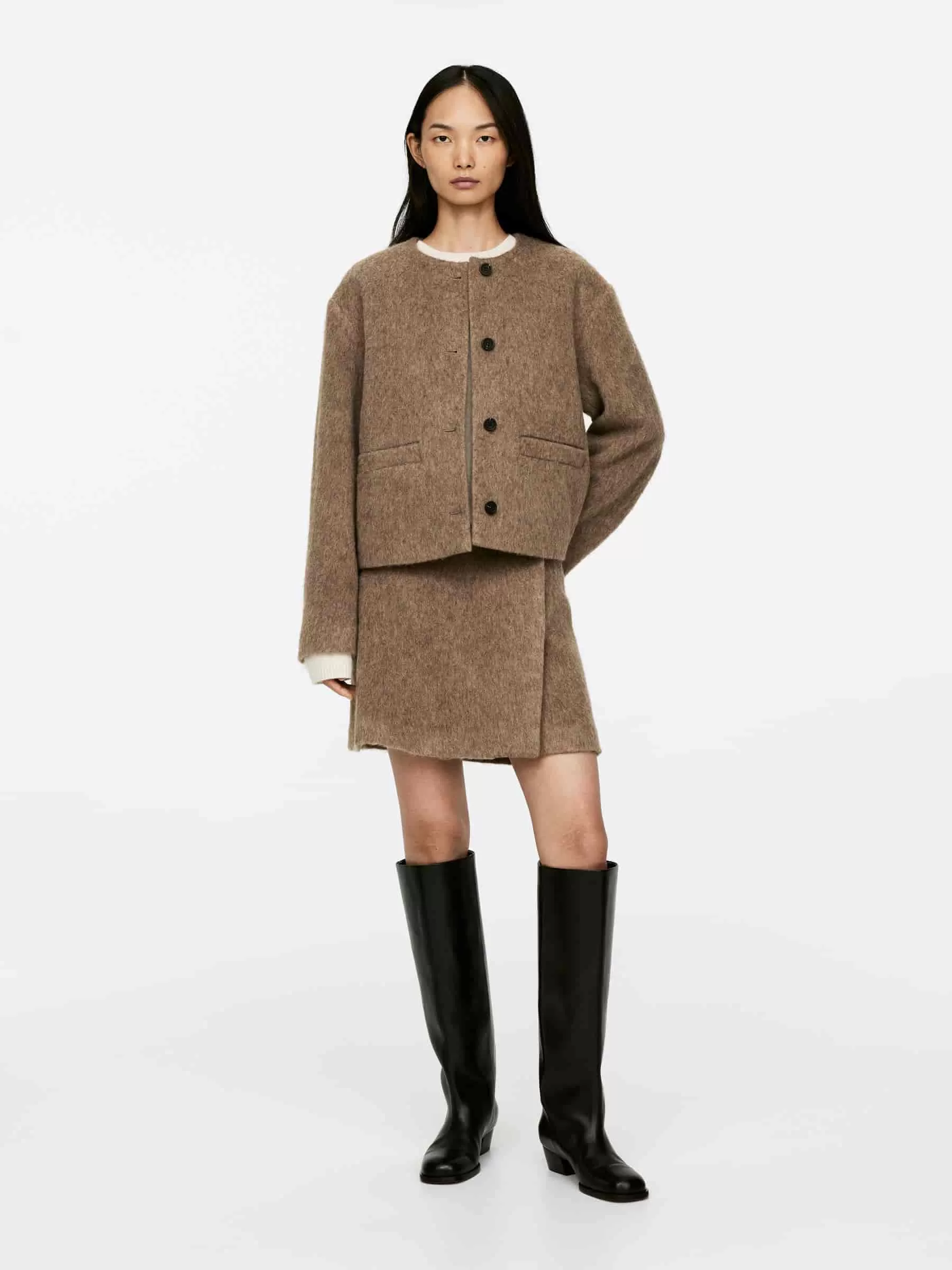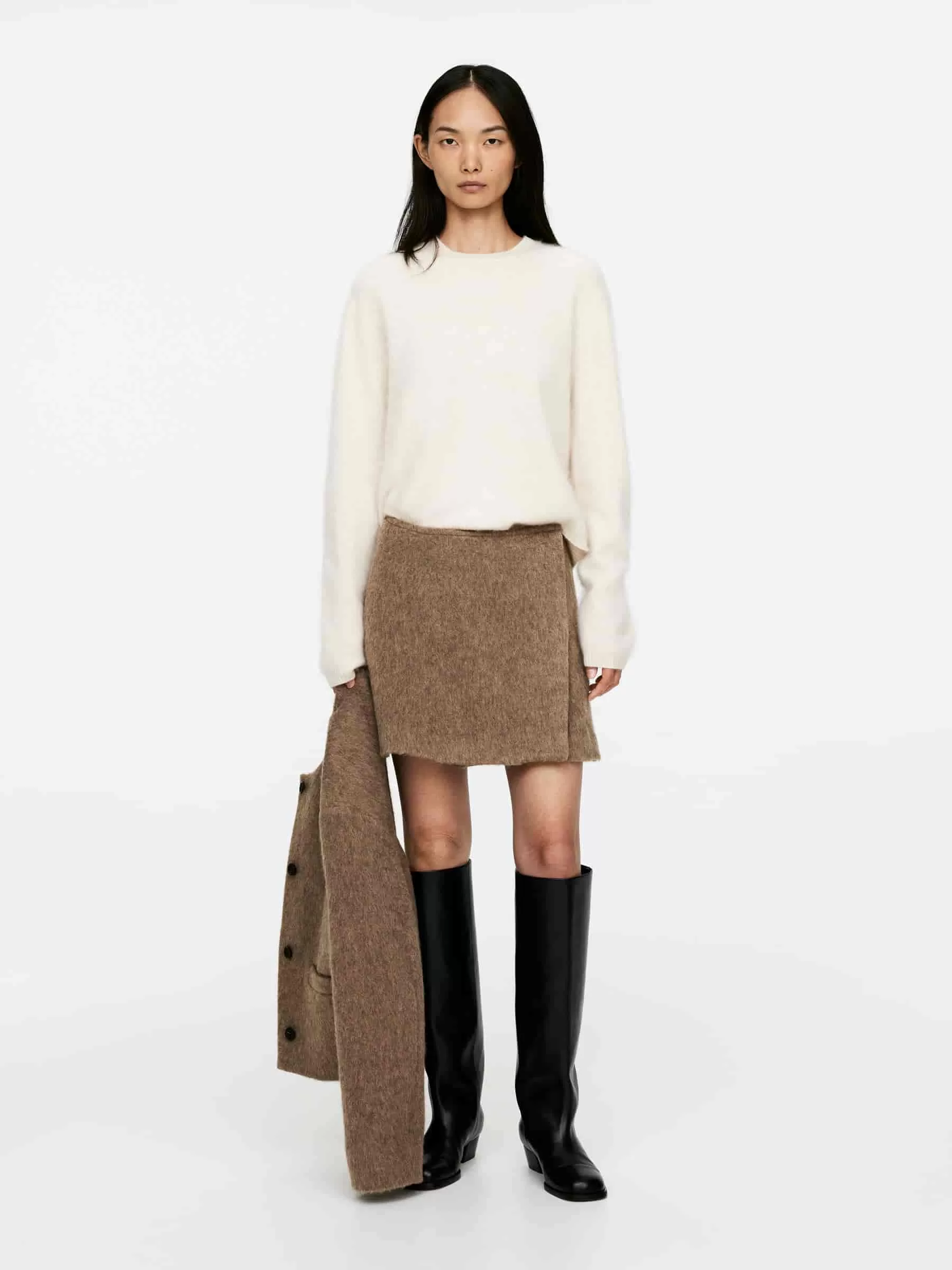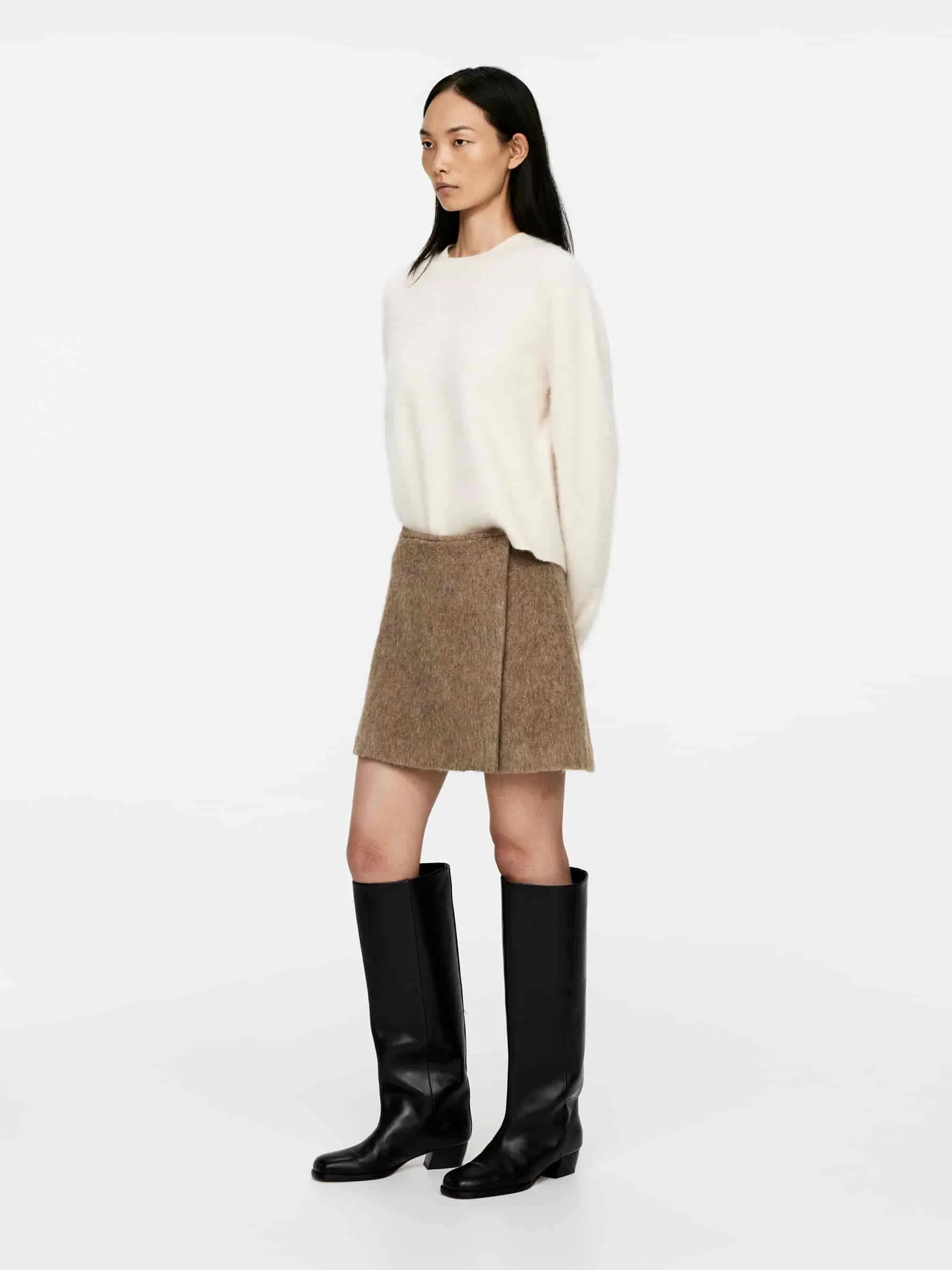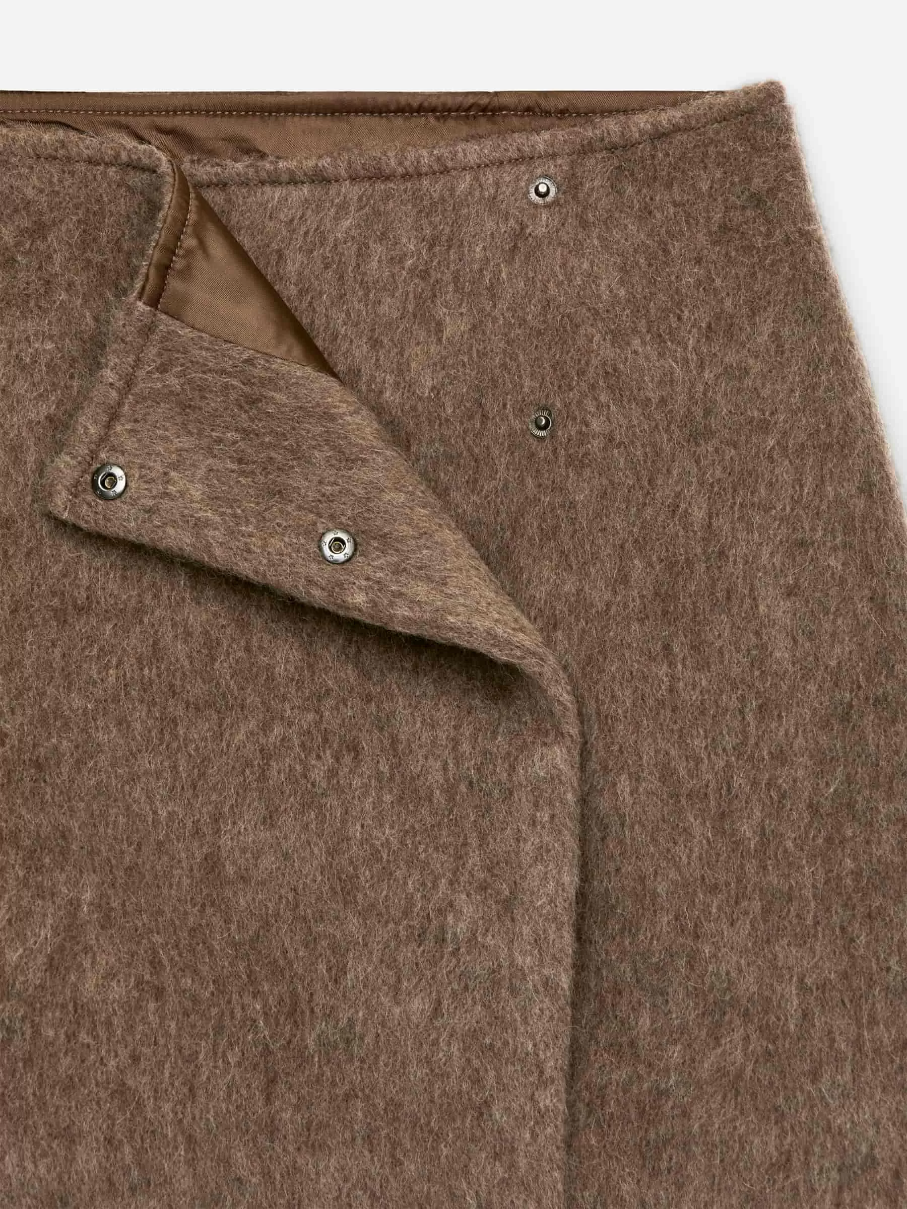 Kurzlanger Wickelrock aus einer Wollmischung mit haariger Oberfläche. Knopfverschluss an der Seitennaht und verdeckter Knopf am Wickelrand. Komplett gefüttert.
