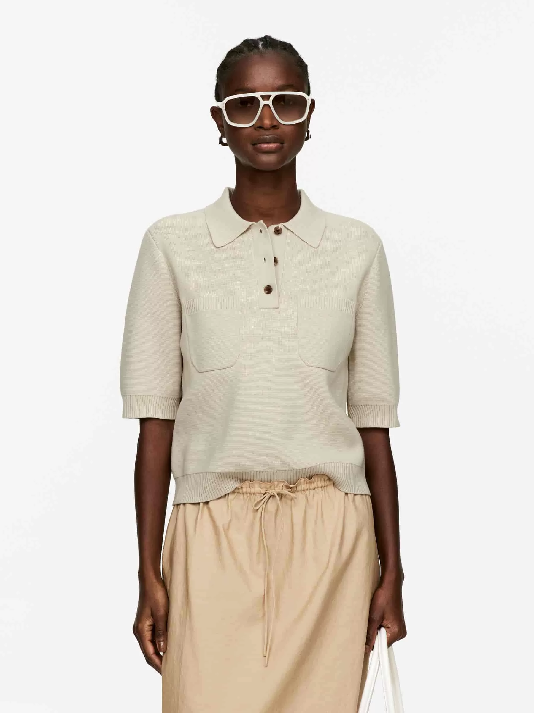 Kurzärmeliges Oberteil aus Baumwolle gestrickt. Mit Hemdkragen, Drei-Knopf-Verschluss und Brusttaschen. Normale Passform.