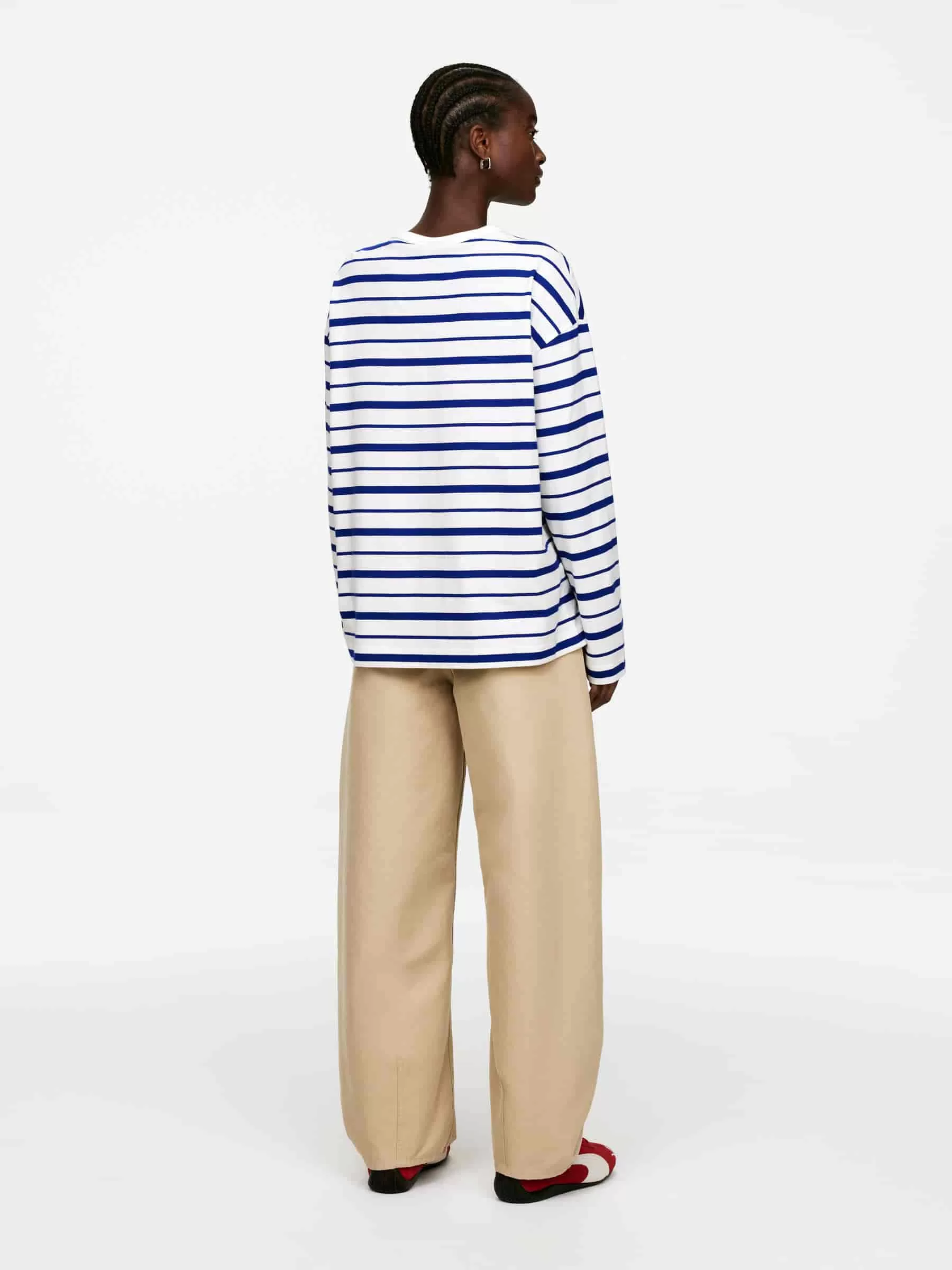 Mittelschweres T-Shirt aus Single-Jersey-Stoff aus Baumwolle. Ein langärmliges Modell mit übergroßer Passform und überschnittenen Schultern. Ausgestattet mit einer einzelnen Brusttasche.