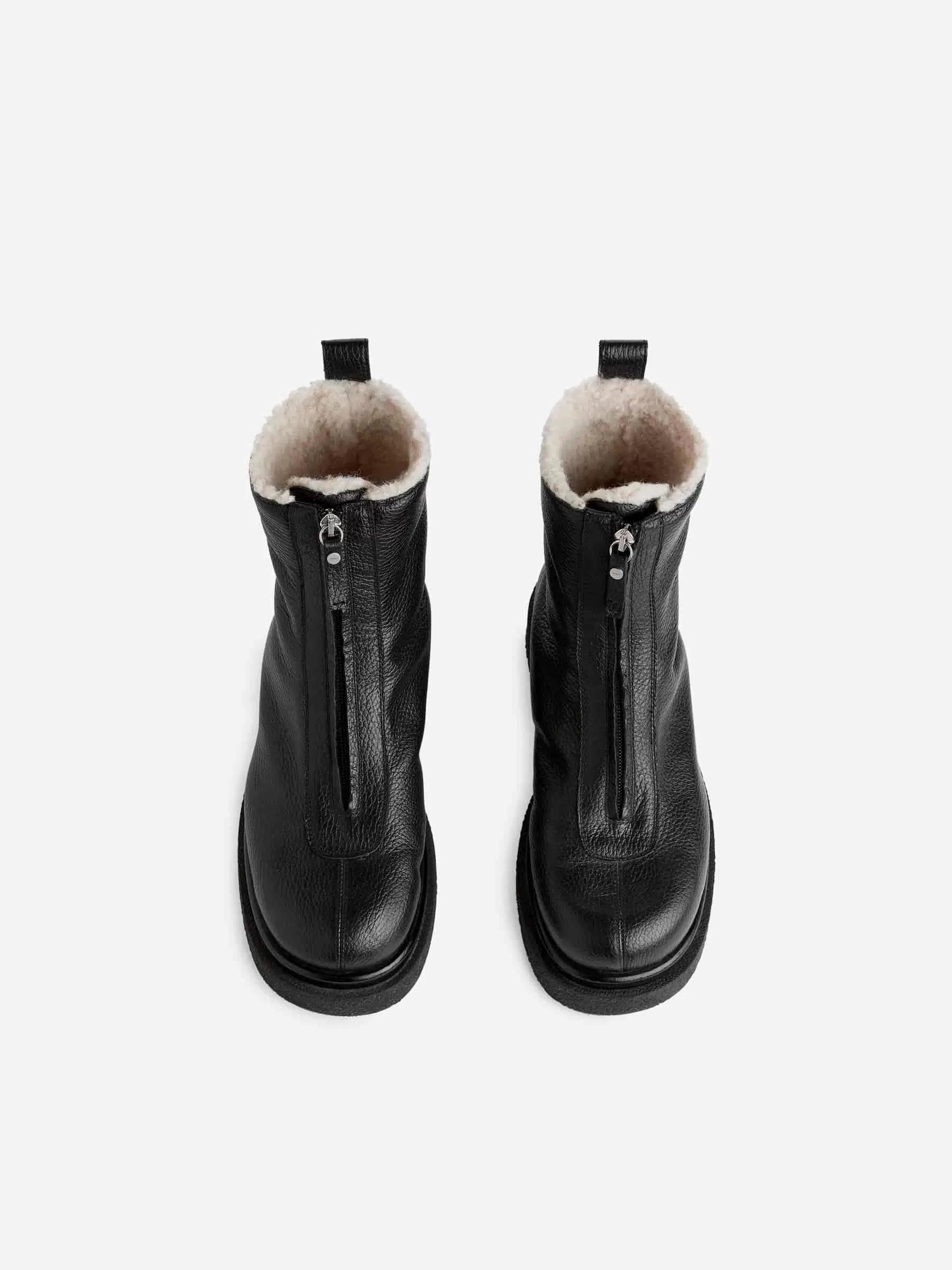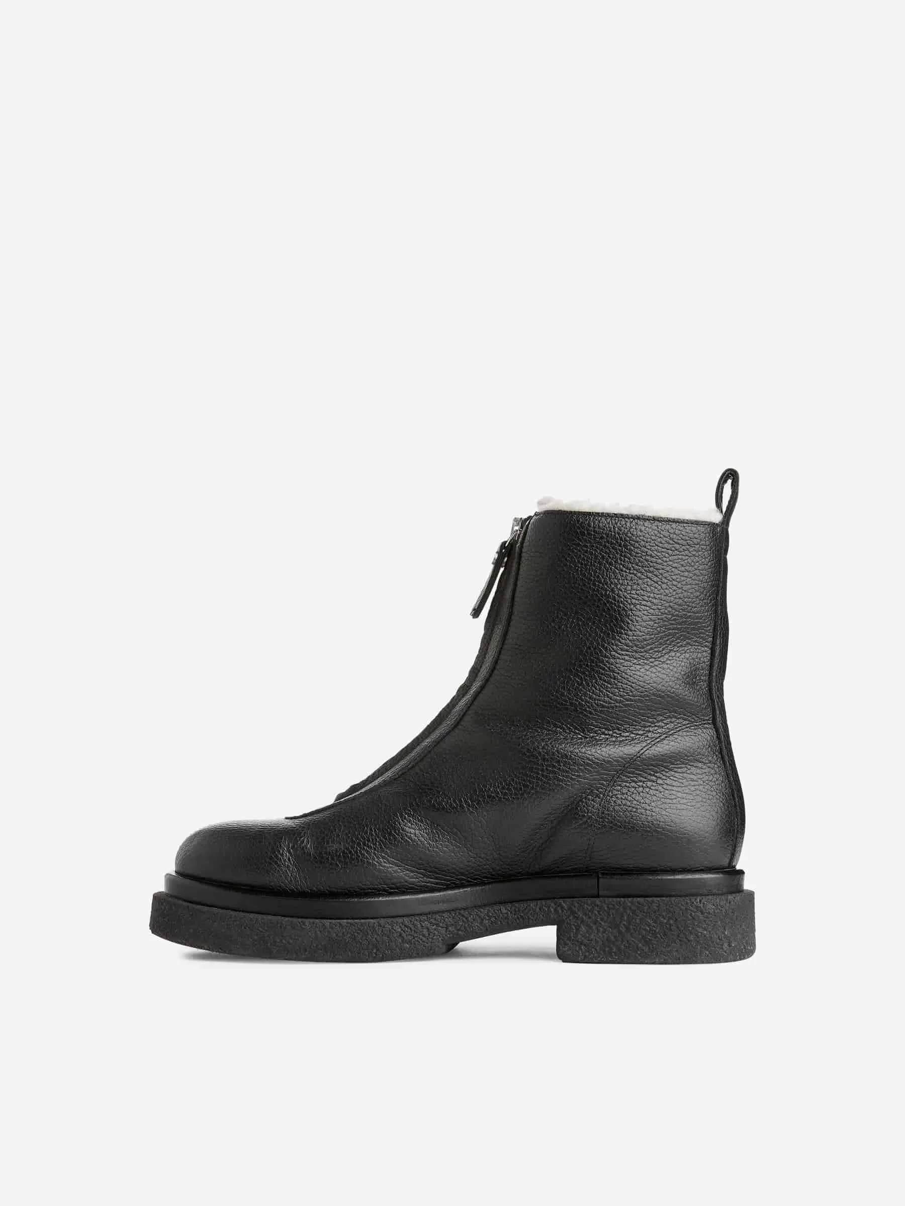 Lederstiefel mit Kunstfellfutter. Ein mittelhohes Modell mit Reißverschlussdetail vorne und einer dicken Gummisohle. Das verwendete Leder wurde einem chromfreien Gerbungsprozess unterzogen.