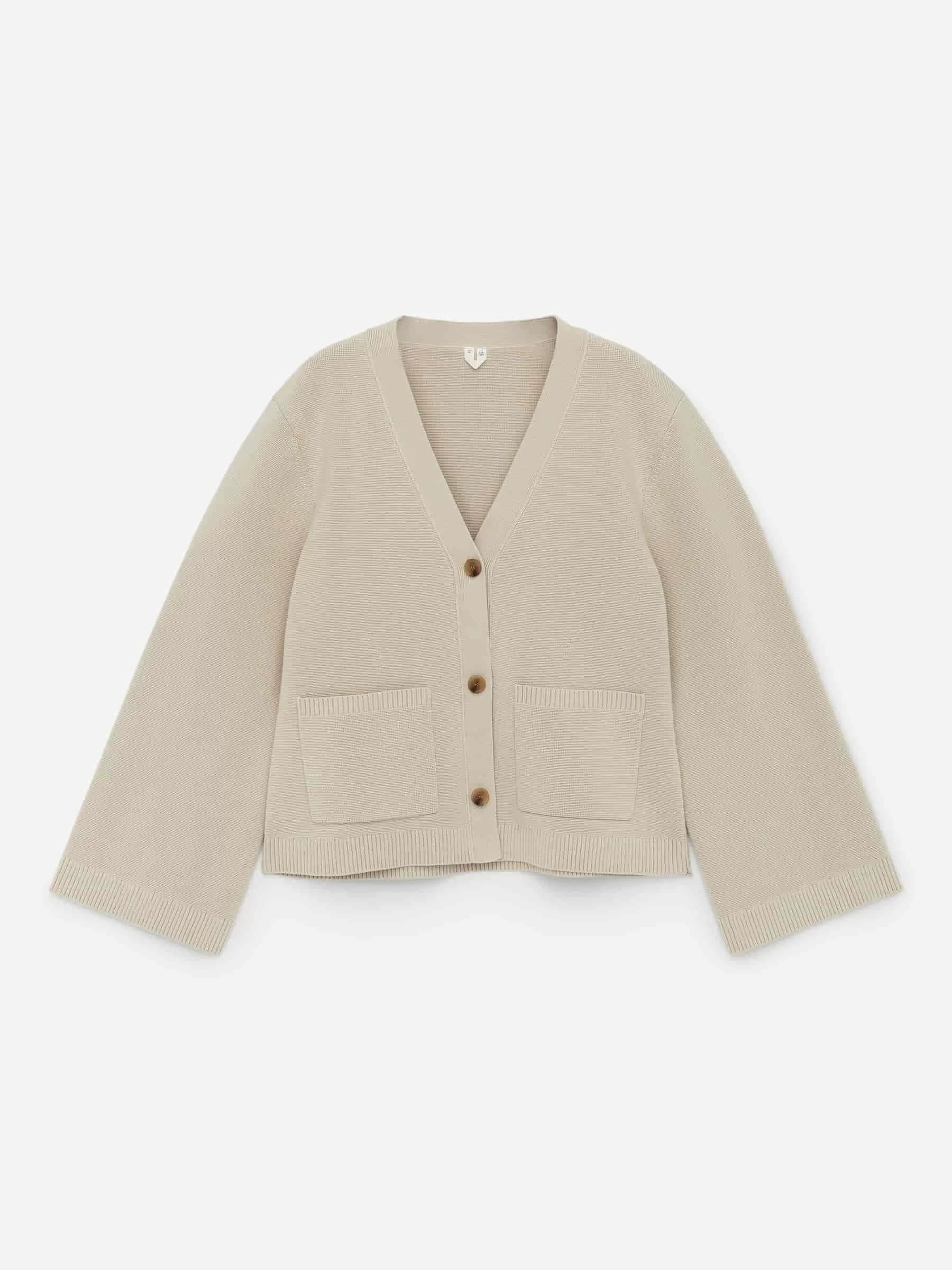 Baumwoll-Cardigan, gestrickt im kompletten Milano-Muster. Dies ist ein Modell mit V-Ausschnitt, drei Knöpfen, Vordertaschen und gerippten Bündchen und Saum. Normale Passform.