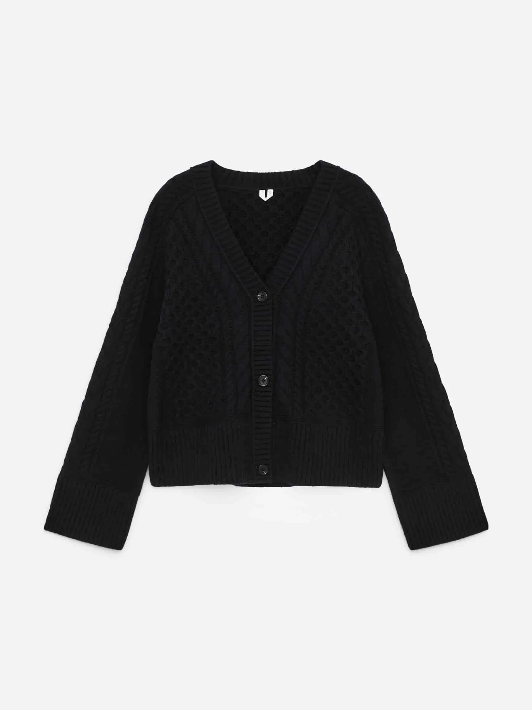 Cardigan mit Zopfmuster aus Wolle. Mit V-Ausschnitt, Drei-Knopf-Verschluss und gerippten Abschlüssen. Normale Passform. Der Cardigan besteht aus 100 % RWS-Wolle (TE-00047206). Produkte, die nach dem Responsible Wool Standard (RWS) zertifiziert sind, enthalten Wollfasern von Farmen, die unabhängig nach Tierschutz- und Landbewirtschaftungsanforderungen zertifiziert sind.