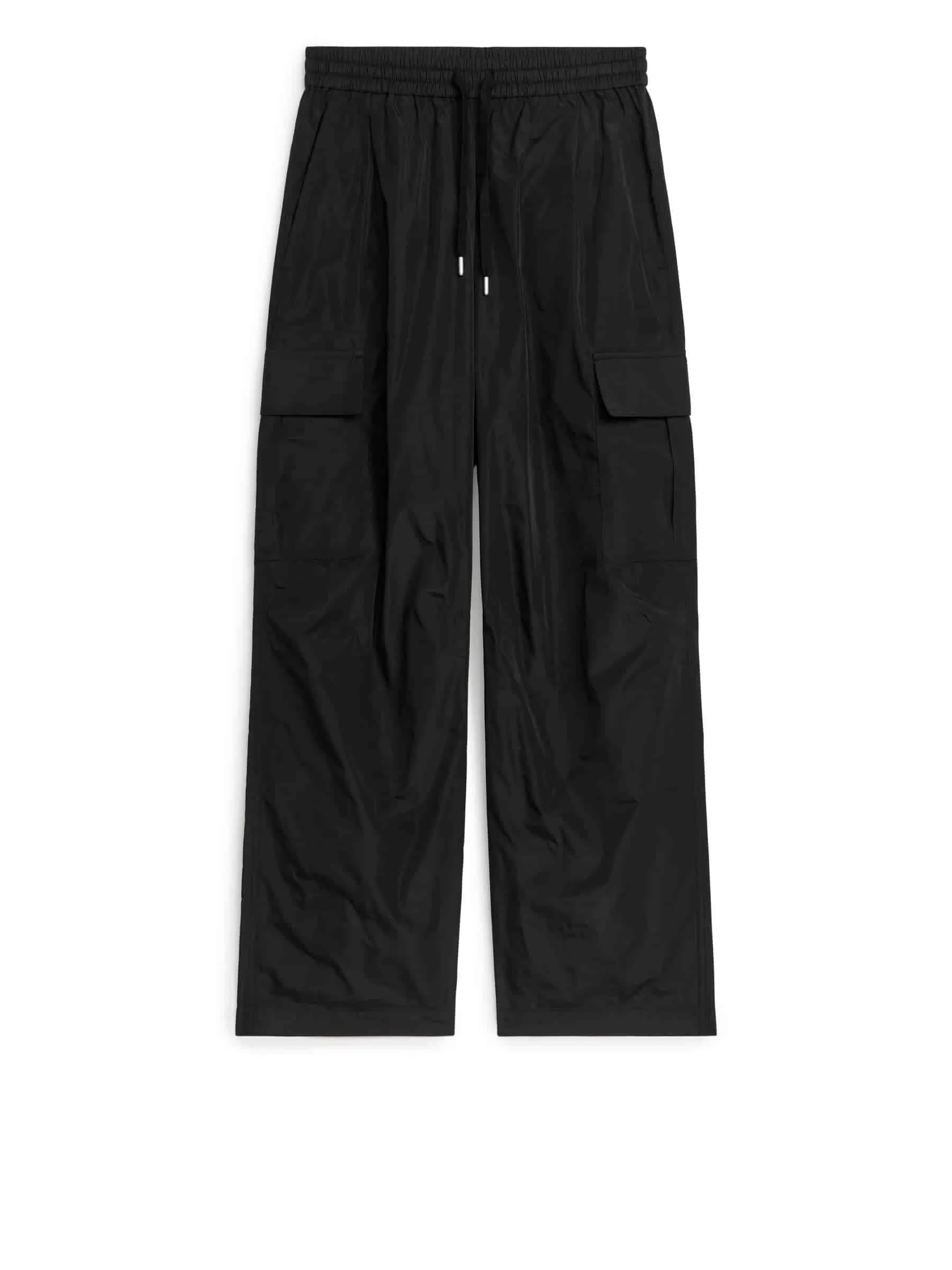 Cargo-inspirierte Hose aus glänzendem technischem Taft. Elastischer Bund mit Kordelzug, schräge Vordertaschen und Beintaschen mit Patte.