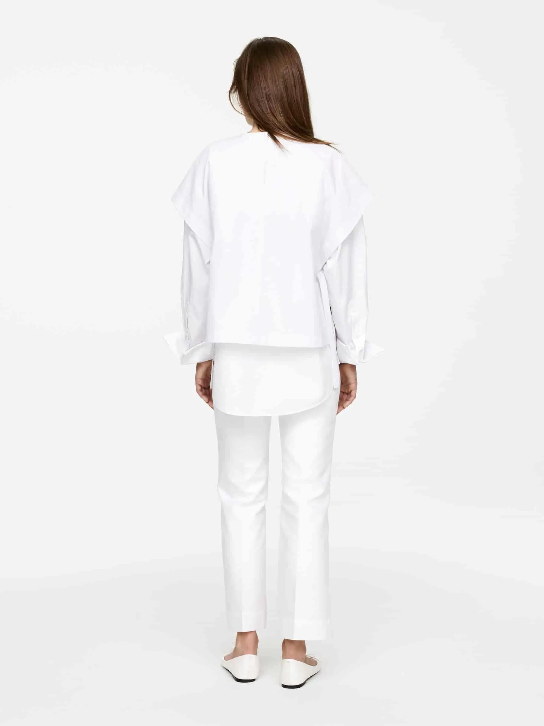 Trägershirt mit Bindeverschluss an den Seiten. Schlüssellochöffnung mit Knopfverschluss hinten in der Mitte.