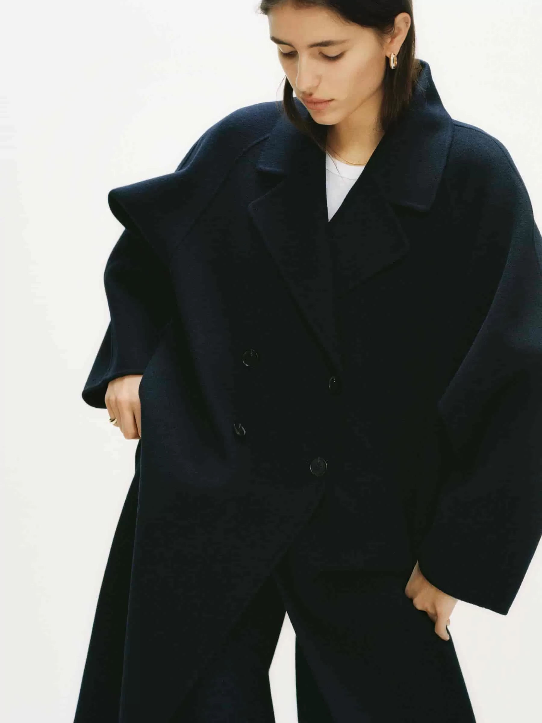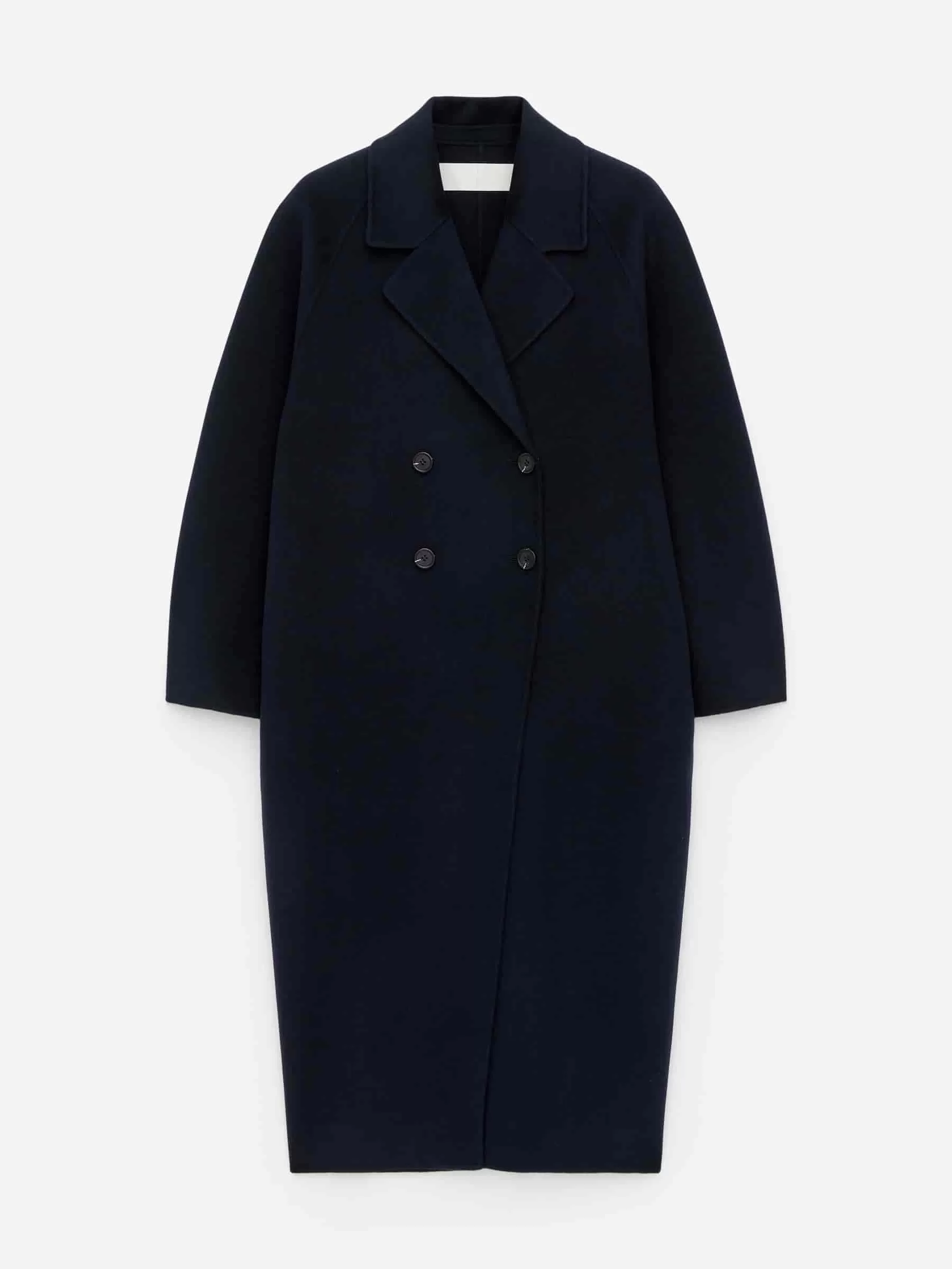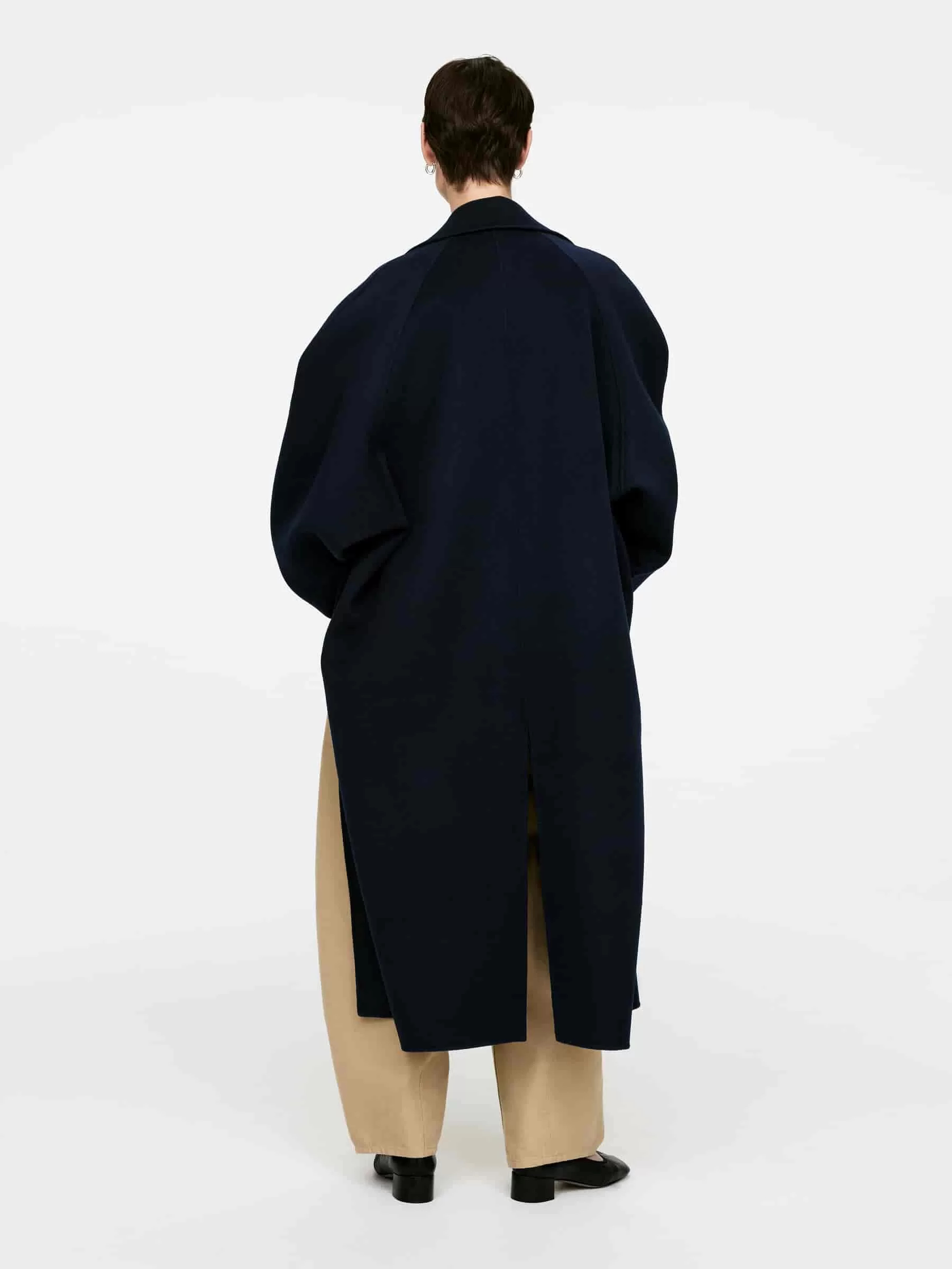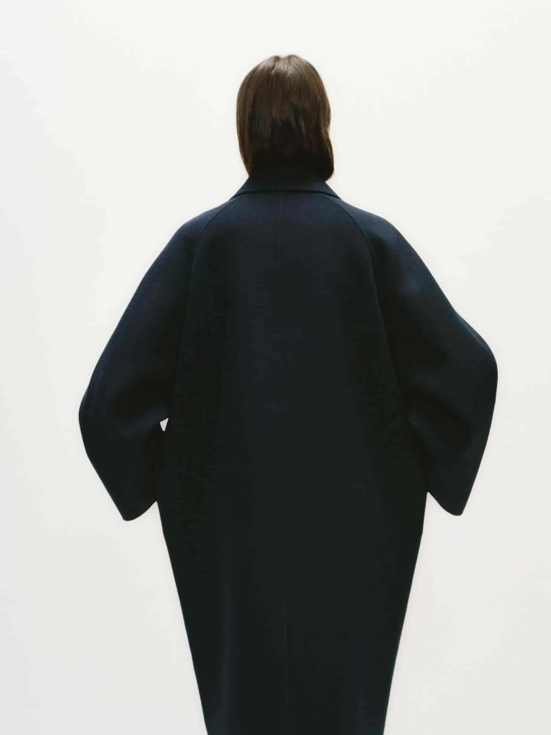 Zweireihiger Mantel aus doppelseitiger Wollmischung. Ein ballonförmiger, übergroßer Stil mit Raglanärmeln. Seitentaschen und Schlitzöffnung hinten in der Mitte. Ungefüttert.