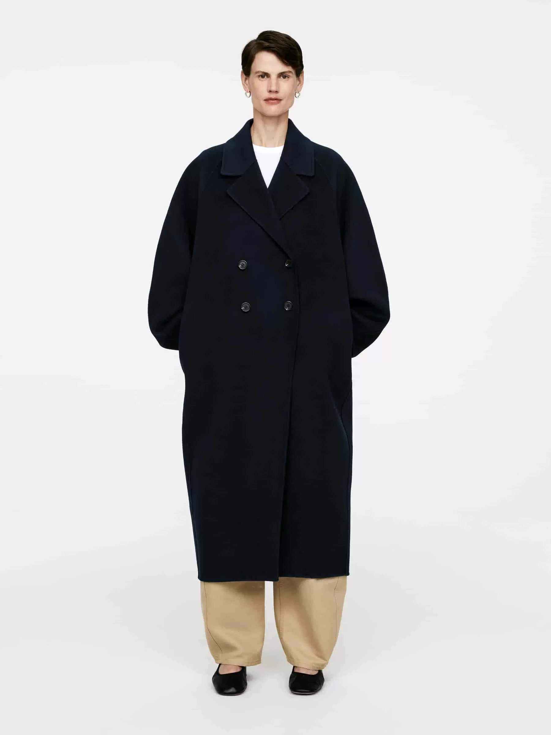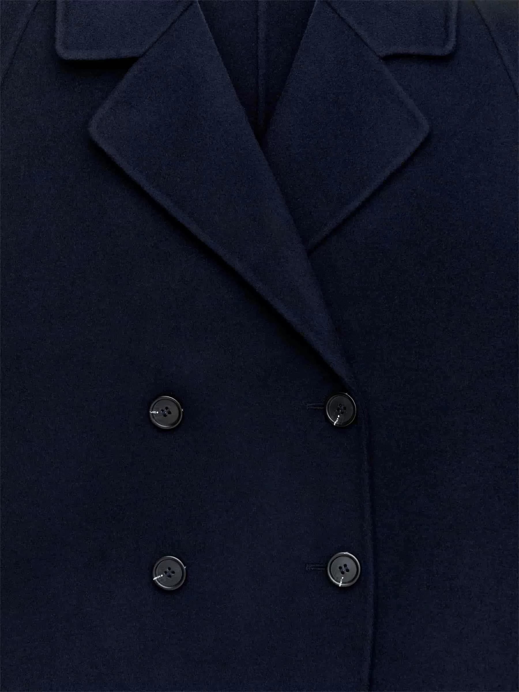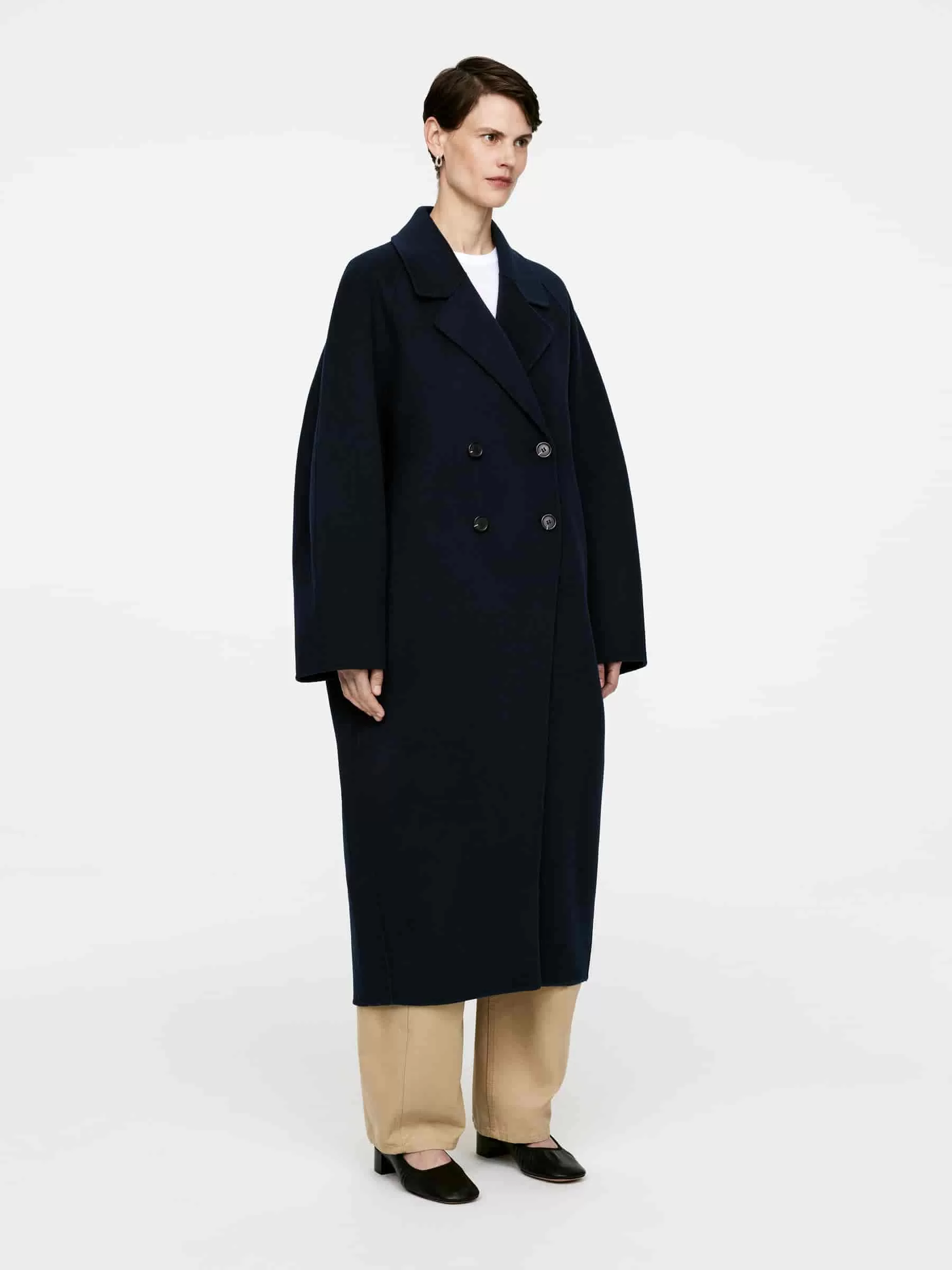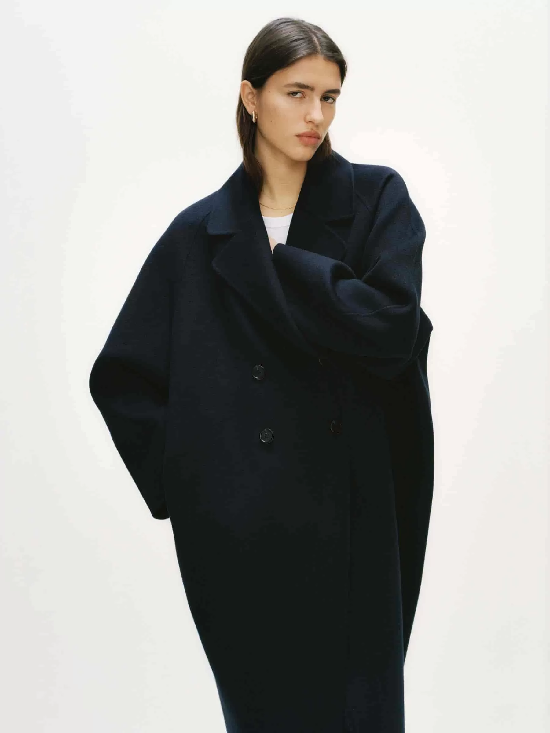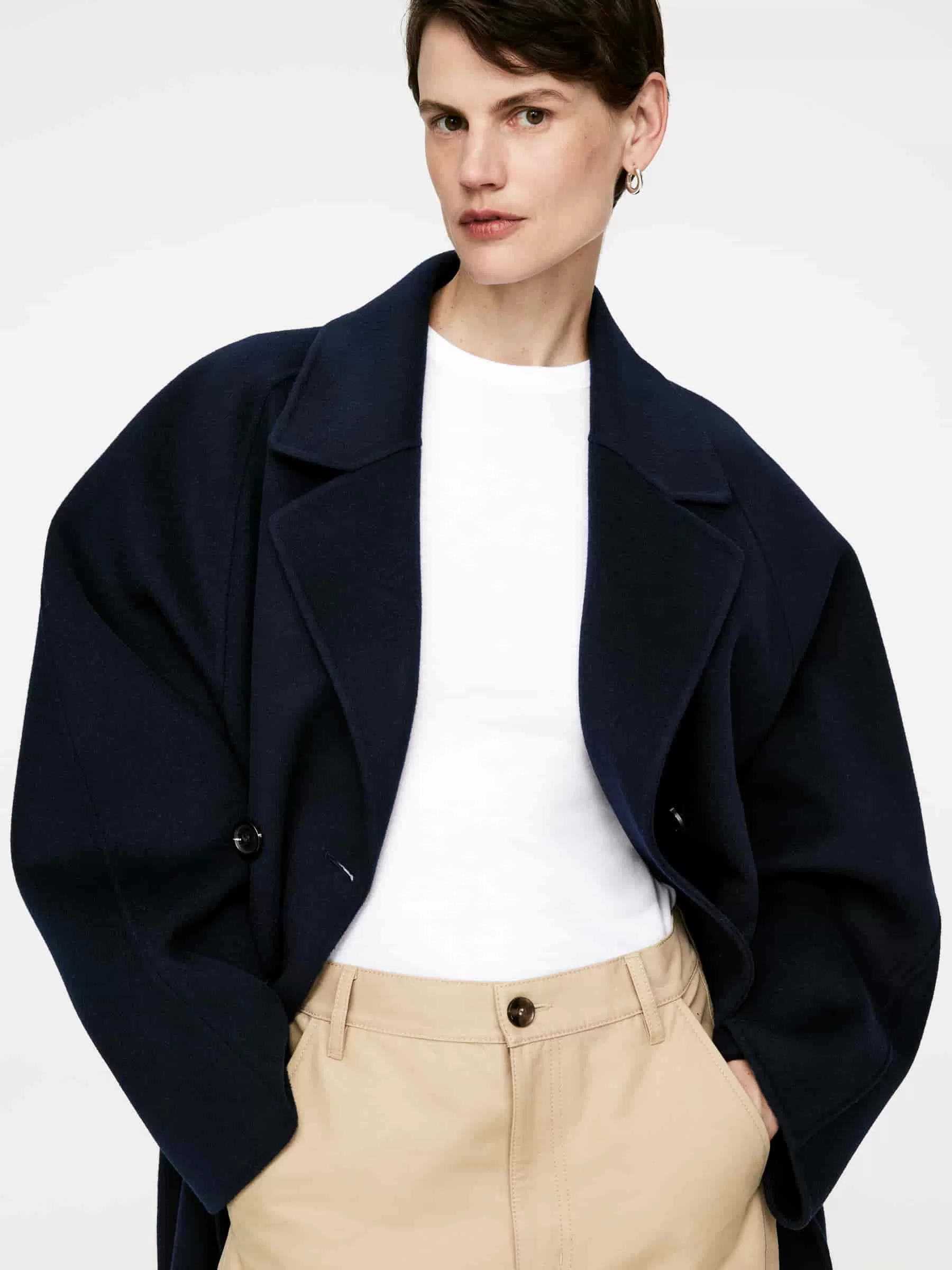 Zweireihiger Mantel aus doppelseitiger Wollmischung. Ein ballonförmiger, übergroßer Stil mit Raglanärmeln. Seitentaschen und Schlitzöffnung hinten in der Mitte. Ungefüttert.