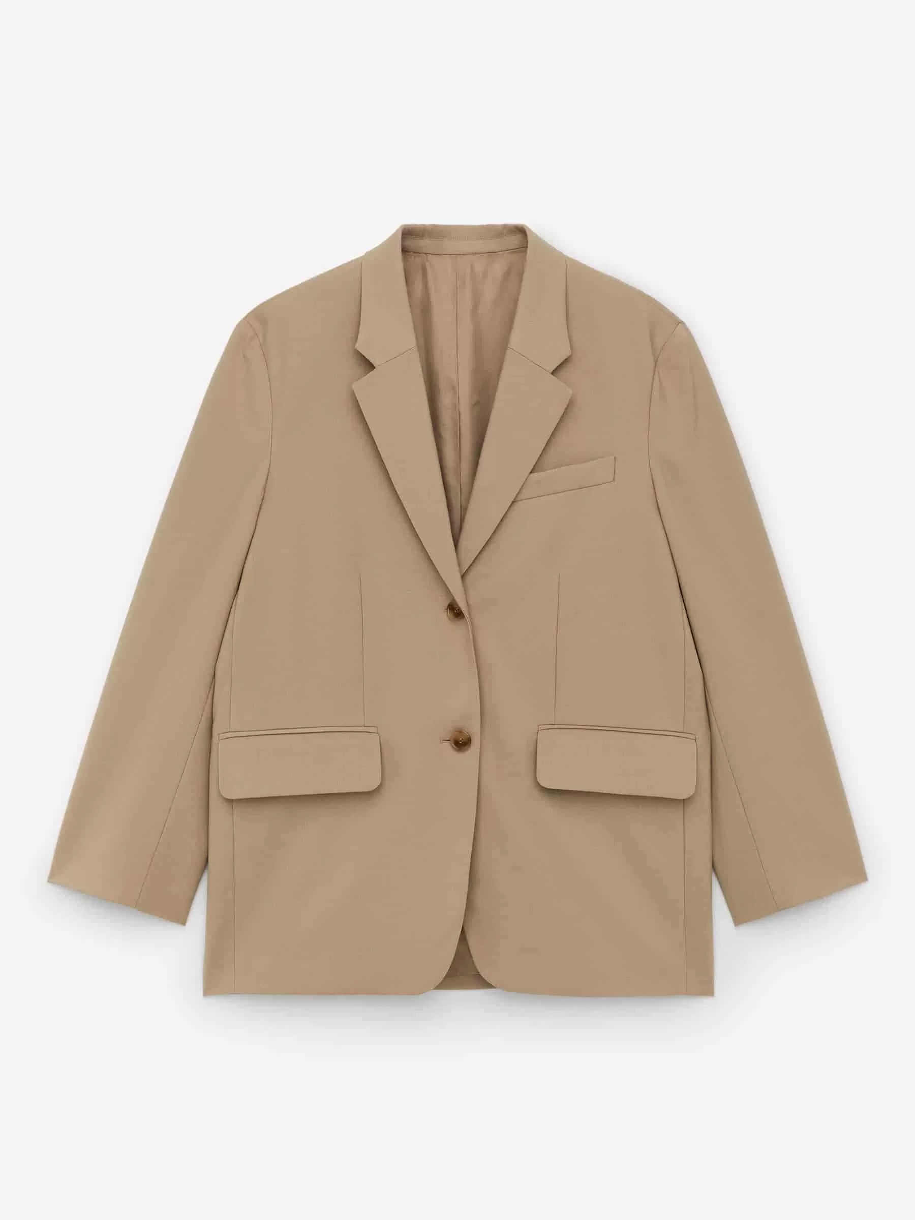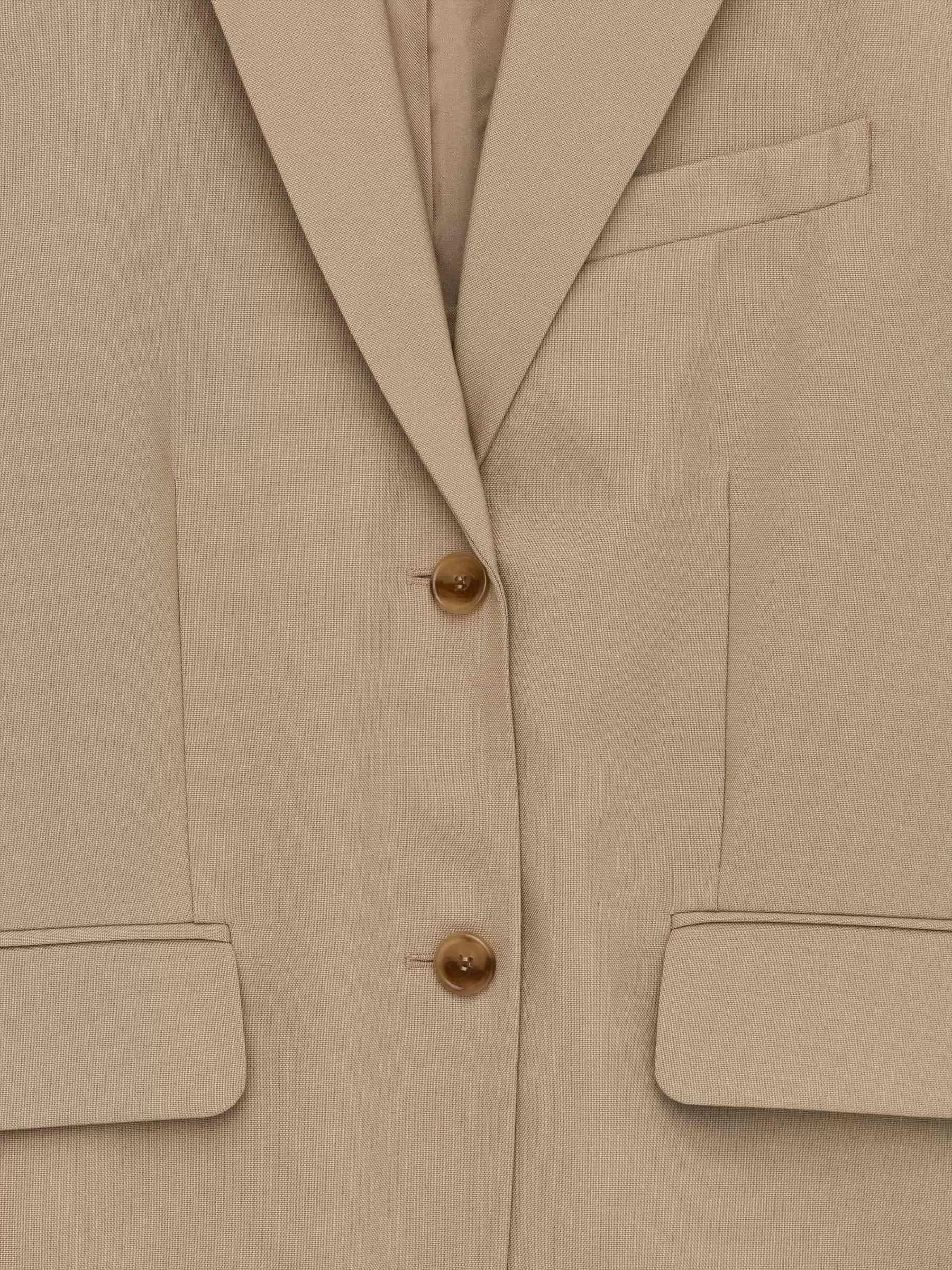 Übergroßer Blazer aus Wolle. Dies ist ein aus Hopsack gewebter, vollständig gefütterter Stil mit doppelten Leistentaschen mit Klappen und Schlitzen in der hinteren Mitte und am Ärmelsaum.