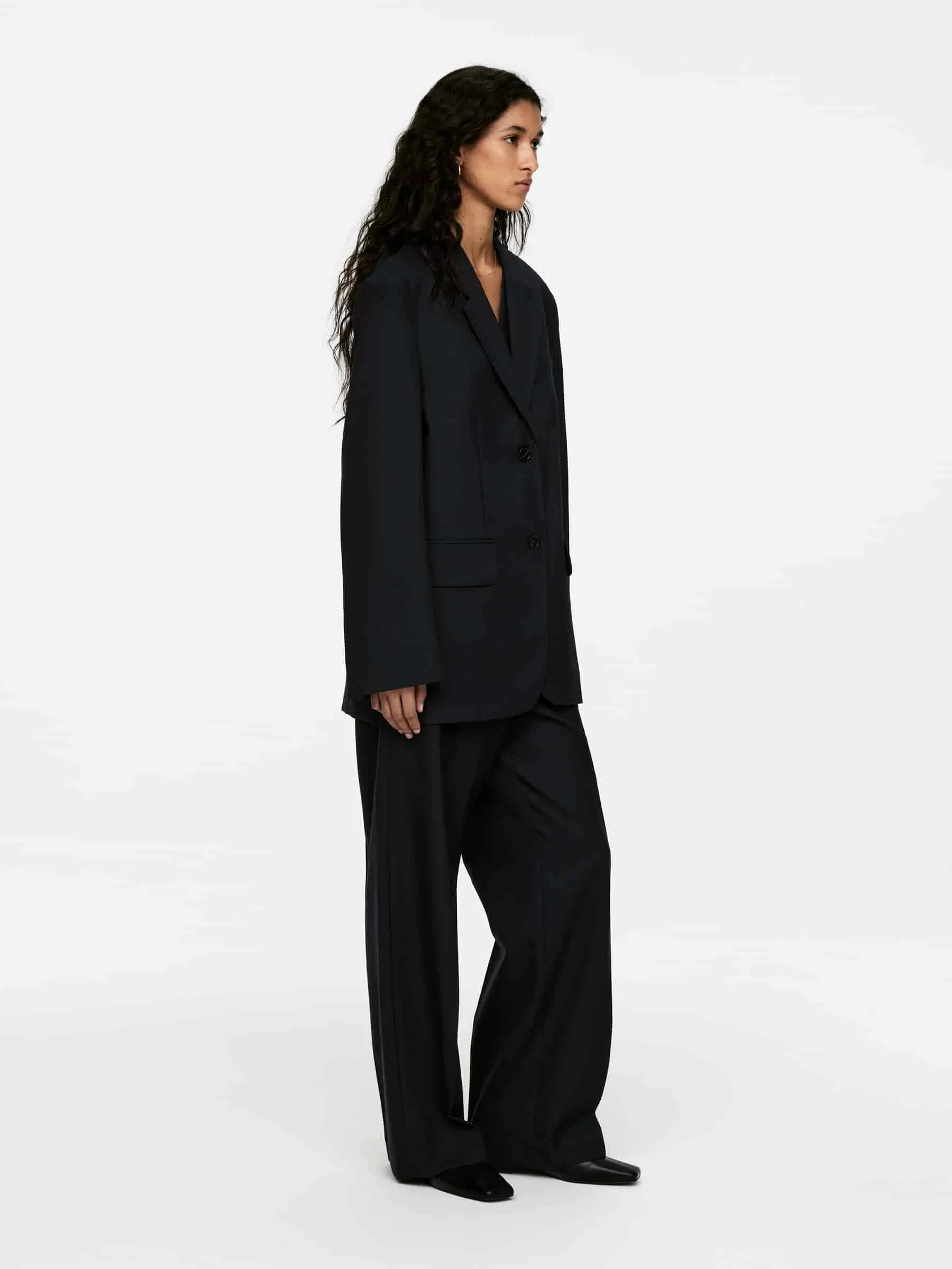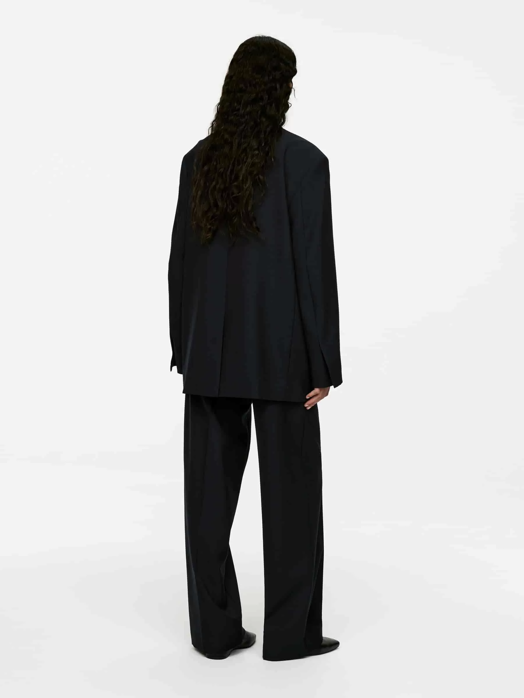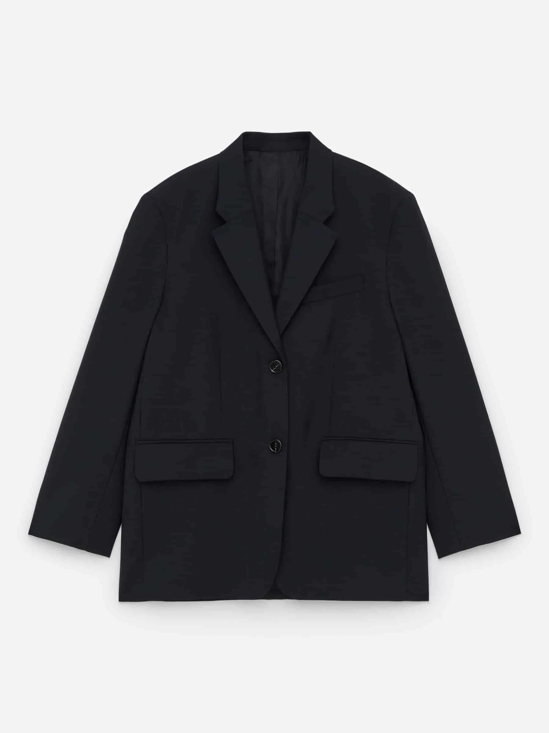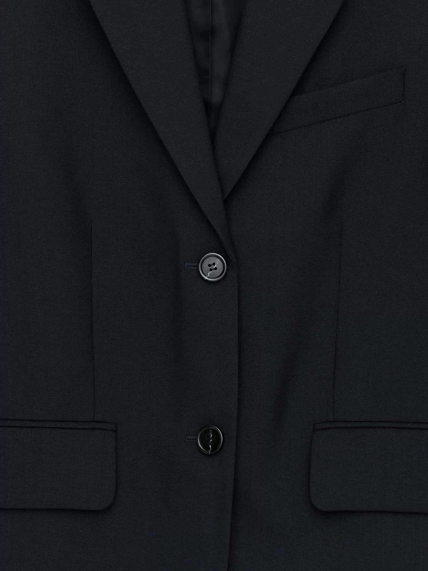 Übergroßer Blazer aus Wolle. Dies ist ein aus Hopsack gewebter, vollständig gefütterter Stil mit doppelten Leistentaschen mit Klappen und Schlitzen in der hinteren Mitte und am Ärmelsaum.