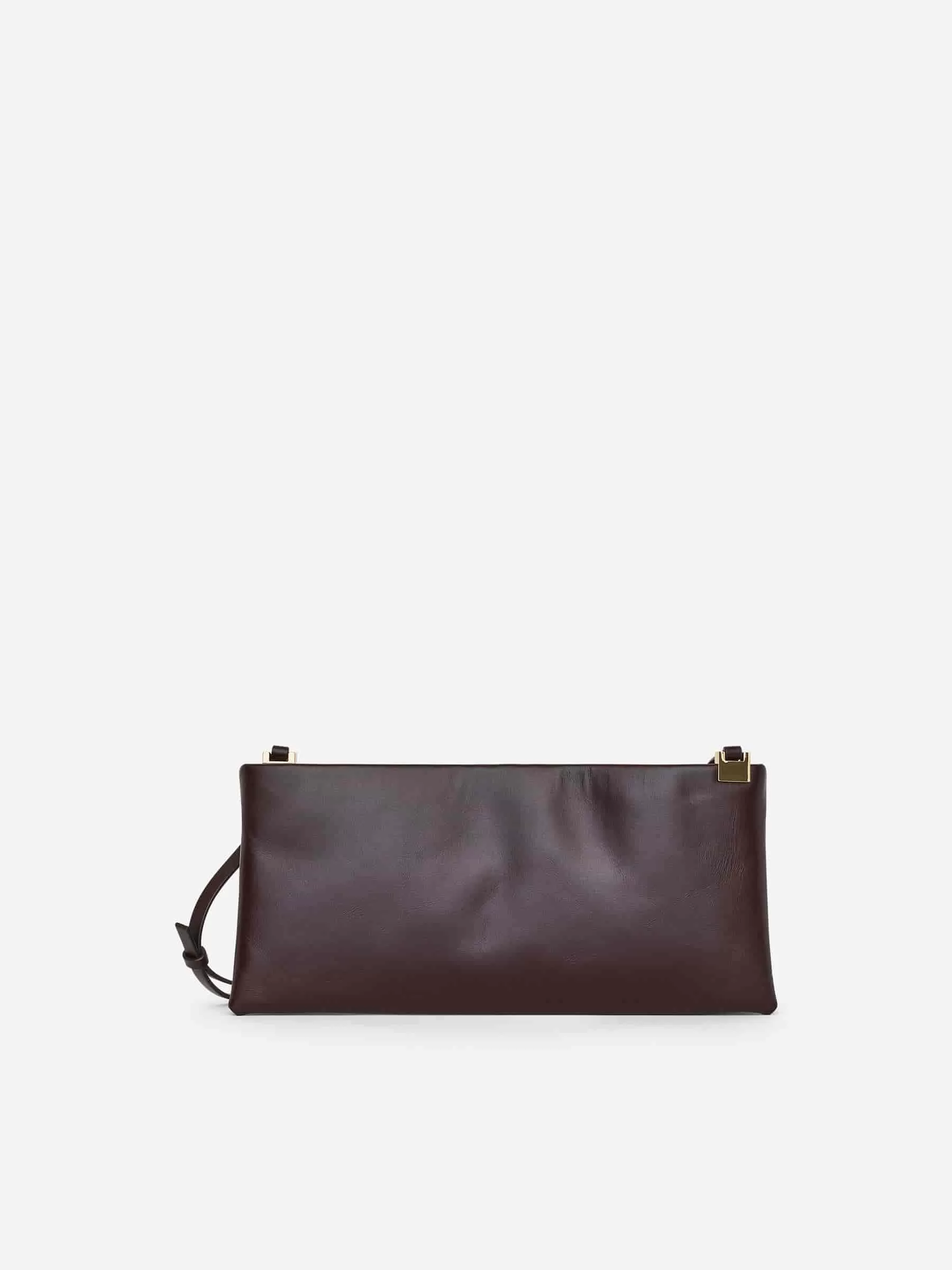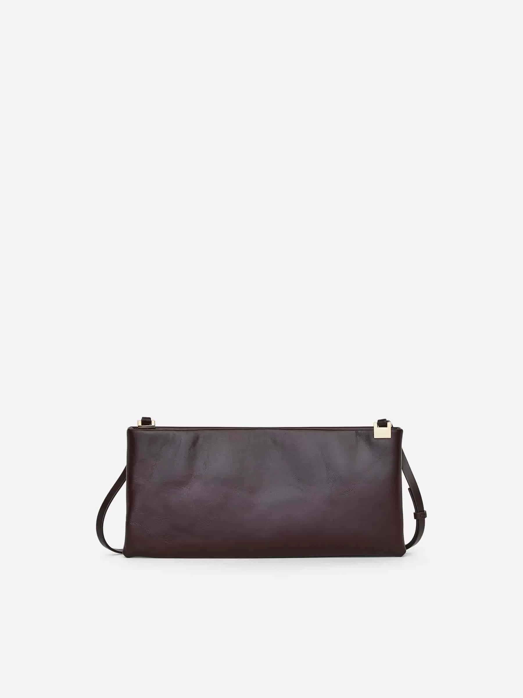 Abendtasche aus chromfreiem Leder. Ausgestattet mit dekorativen goldfarbenen Verzierungen am Ende des verstellbaren Riemens. Innentasche. Maße: 33 x 15 x 6 cm.